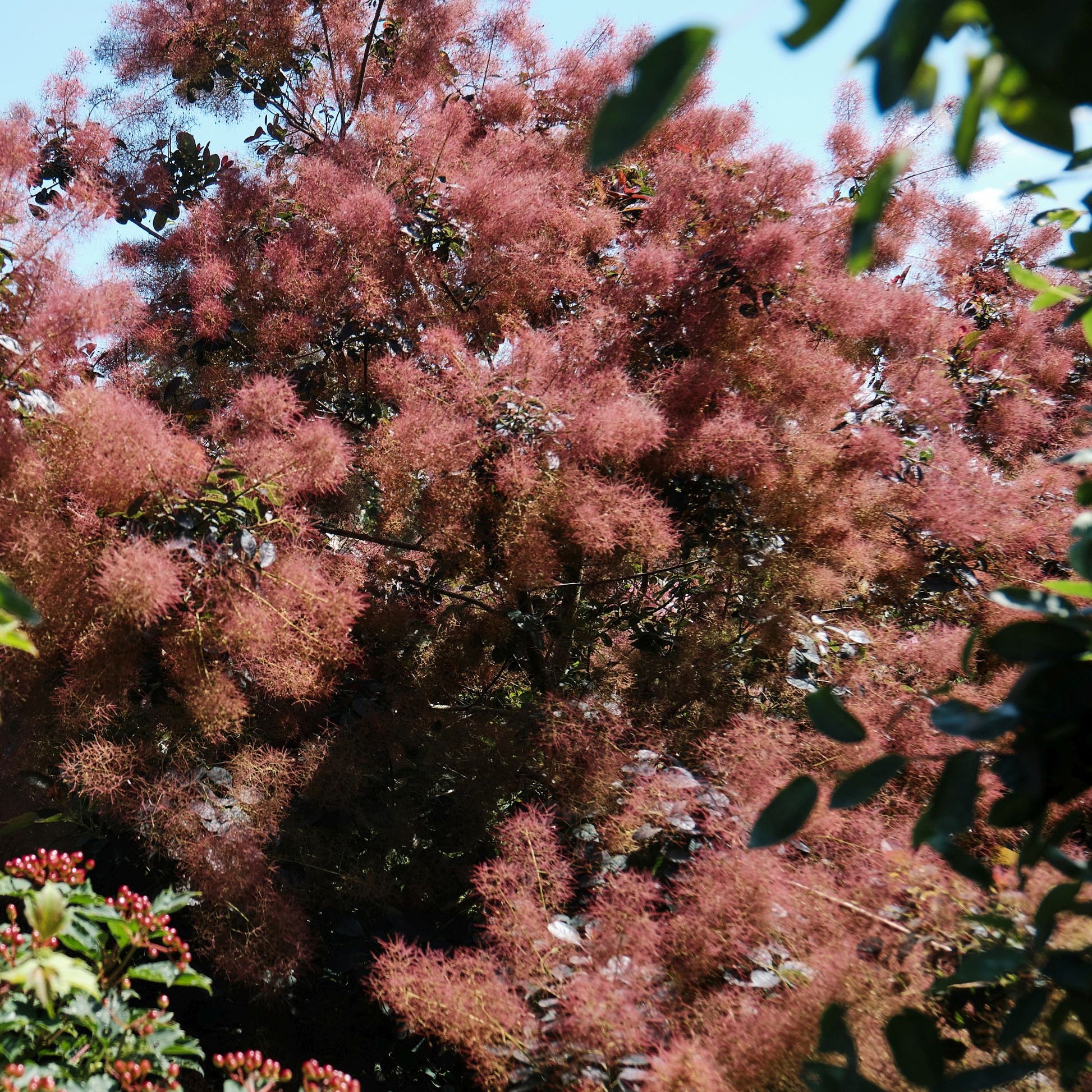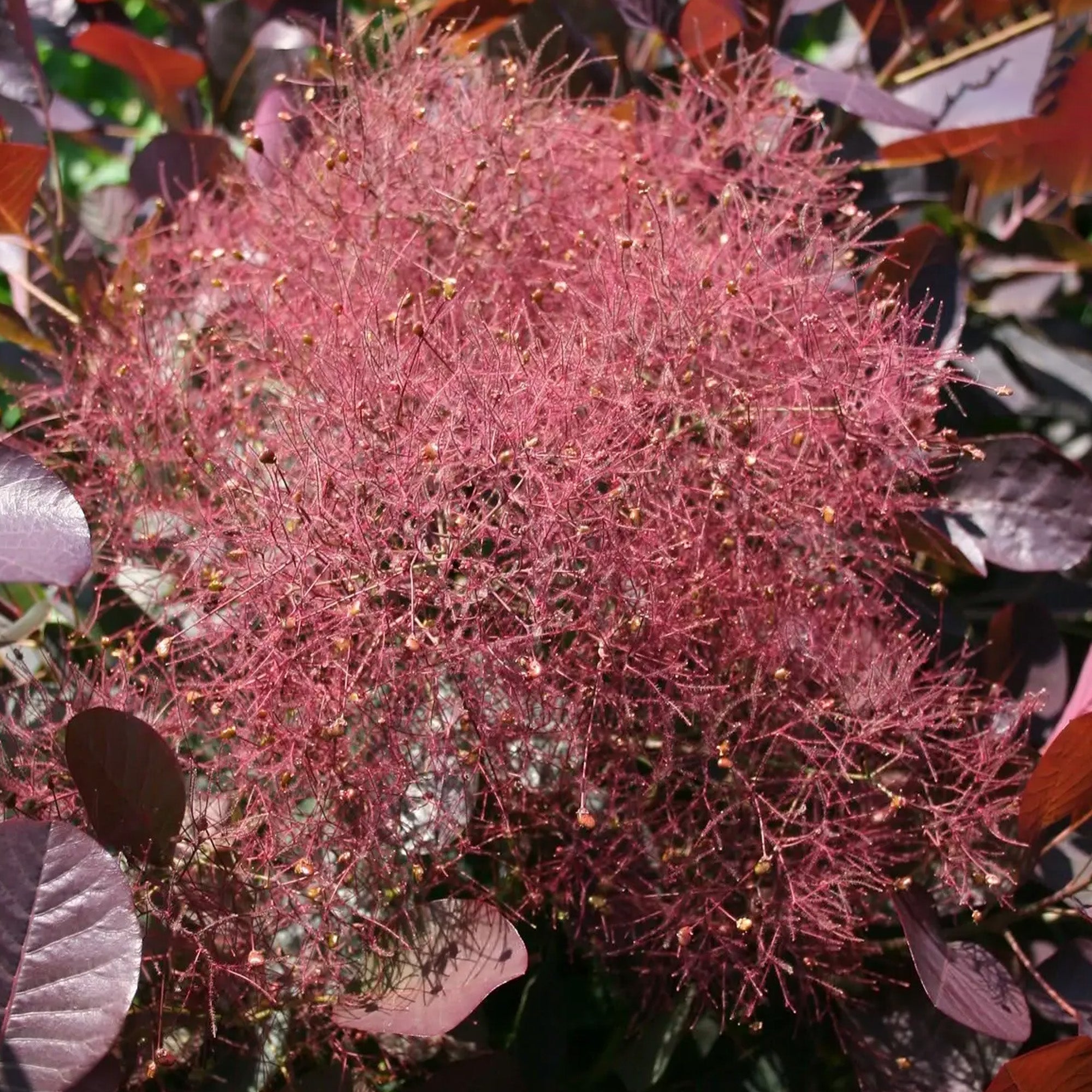 Cotinus Magical Red Fountain is often referred to as the Smoke Bush, due to the wispy nature of its flower plumes. These deep pink flowers begin to appear in July, lasting for months and attracting bees, butterflies and other pollinators to the garden.