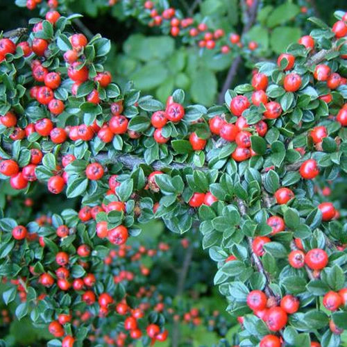 Cotoneaster Horizontalis is a spreading dwarf deciduous shrub with distinctively flat regularly branched sprays of foliage with small glossy leaves that turn orange and red in autumn/winter, with pink-tinged flowers and red berries