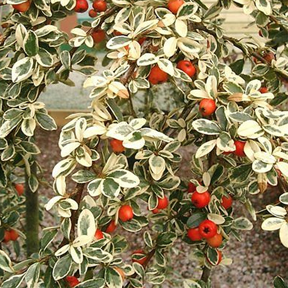 Cotoneaster Variegatus is a low-growing small deciduous shrub with horizontally spreading branches, bearing small leaves margined with cream and tinted red in autumn. Develops small pink flowers followed by red berries.