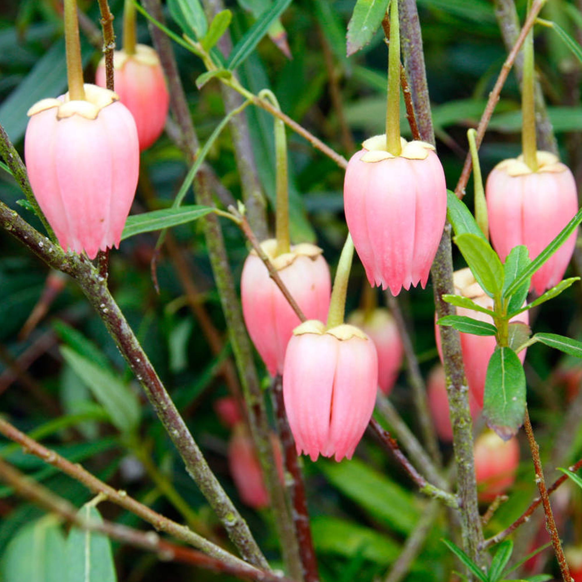 Crinodendron hookerianum ‘Ada Hoffmann’ is an evergreen shrub. This variety features ovate dark green leaves that accommodate hanging, urn-shaped pale pink flowers in the Spring. The Crinodendron hookerianum ‘Ada Hoffmann’ is hardy and will thrive in most soil types. This particular plant will be best planted in a full sun or partially shaded location.