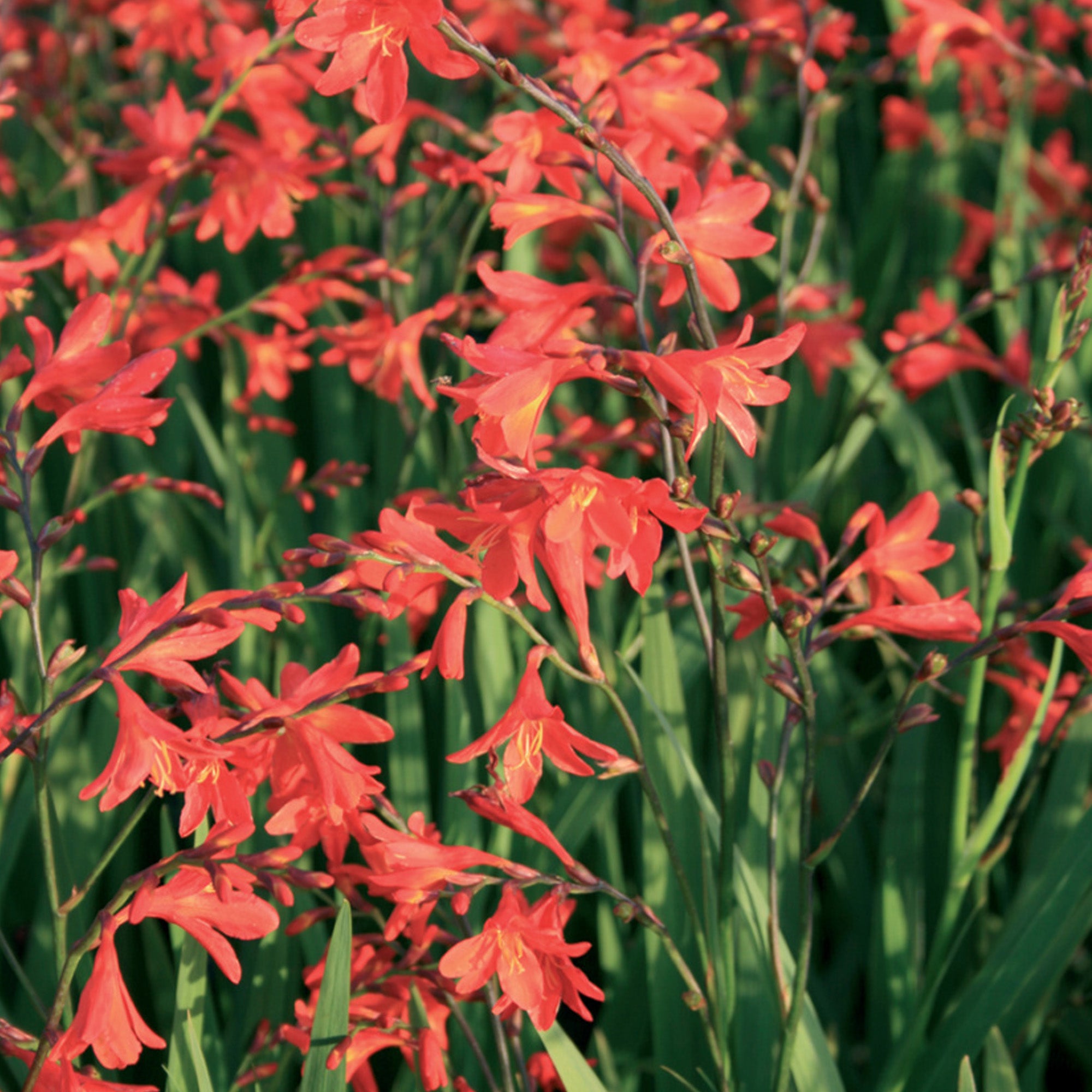 Crocosmia crocosmiiflora Carmine Brilliant brings a guaranteed burst of vibrance into any garden. If it's colour you're looking for, then its array of long-lasting, dark orange, Summer flowerheads is the ideal solution. Each bloom is accompanied by bright, mid-green leaves, making this clump-forming, herbaceous perennial a must-have for your pots, containers and more. This variety will also reach an ultimate height of 0.5-1m and spread of 0.1-0.5m.