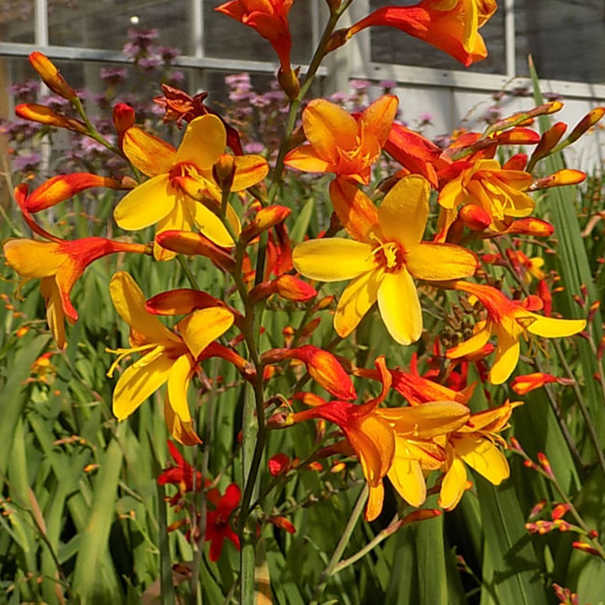 Montbretia has a clump forming habit and is ideal for borders, adding colour and height late into the season. It is winter hardy to temperatures as low as around -10 °C, but may require some additional help through the winter months if planted in a pot or container.
