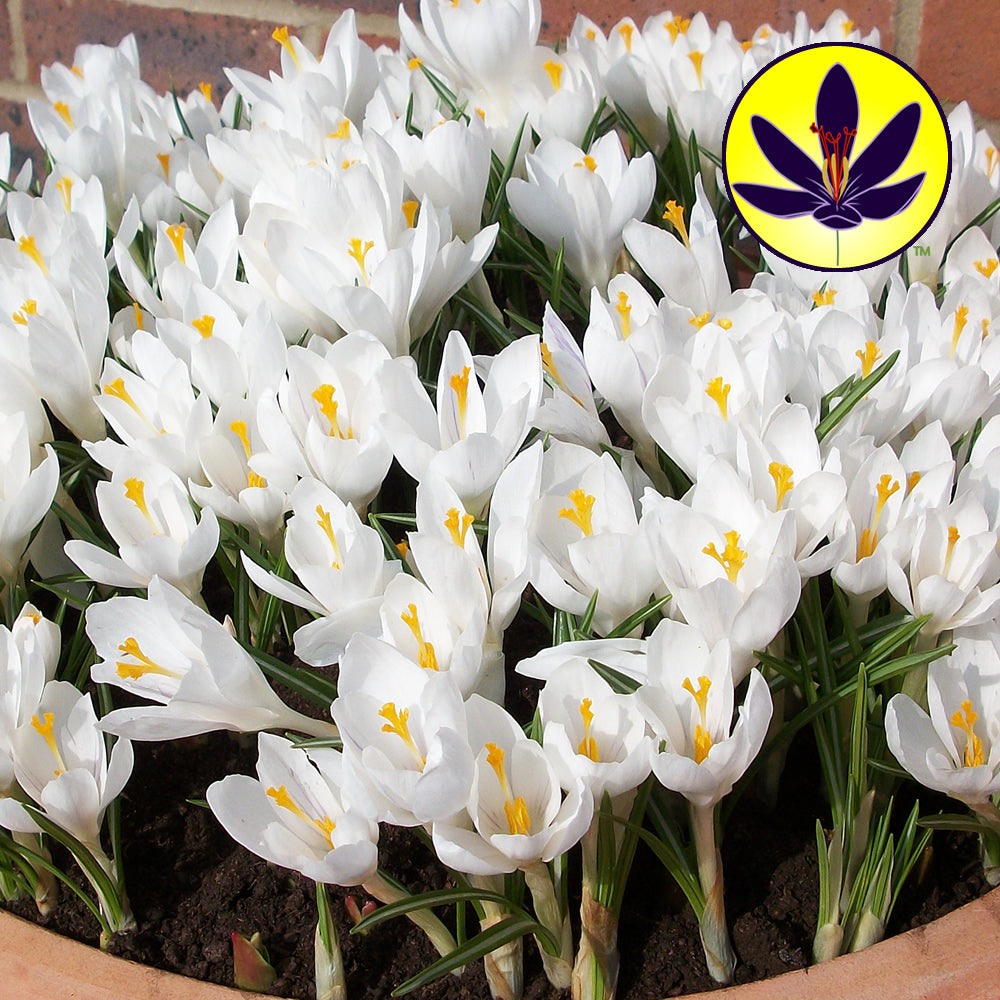 Crocuses are versatile bulbs that can be planted in lawns, beds, borders, or containers. Choose a spot in full sun or partial shade with well-draining soil and use a bulb planter or trowel to dig small holes 7-10cm apart. Plant one bulb to each hole at a depth of 10-15cm with the pointed end facing upwards. Backfill the holes, firm down the soil, and water in well.