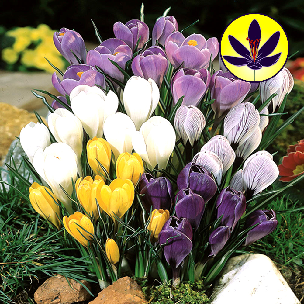 Crocuses are versatile bulbs that can be planted in lawns, beds, borders, or containers. Choose a spot in full sun or partial shade with well-draining soil and use a bulb planter or trowel to dig small holes 7-10cm apart. Plant one bulb to each hole at a depth of 10-15cm with the pointed end facing upwards. Backfill the holes, firm down the soil, and water in well.