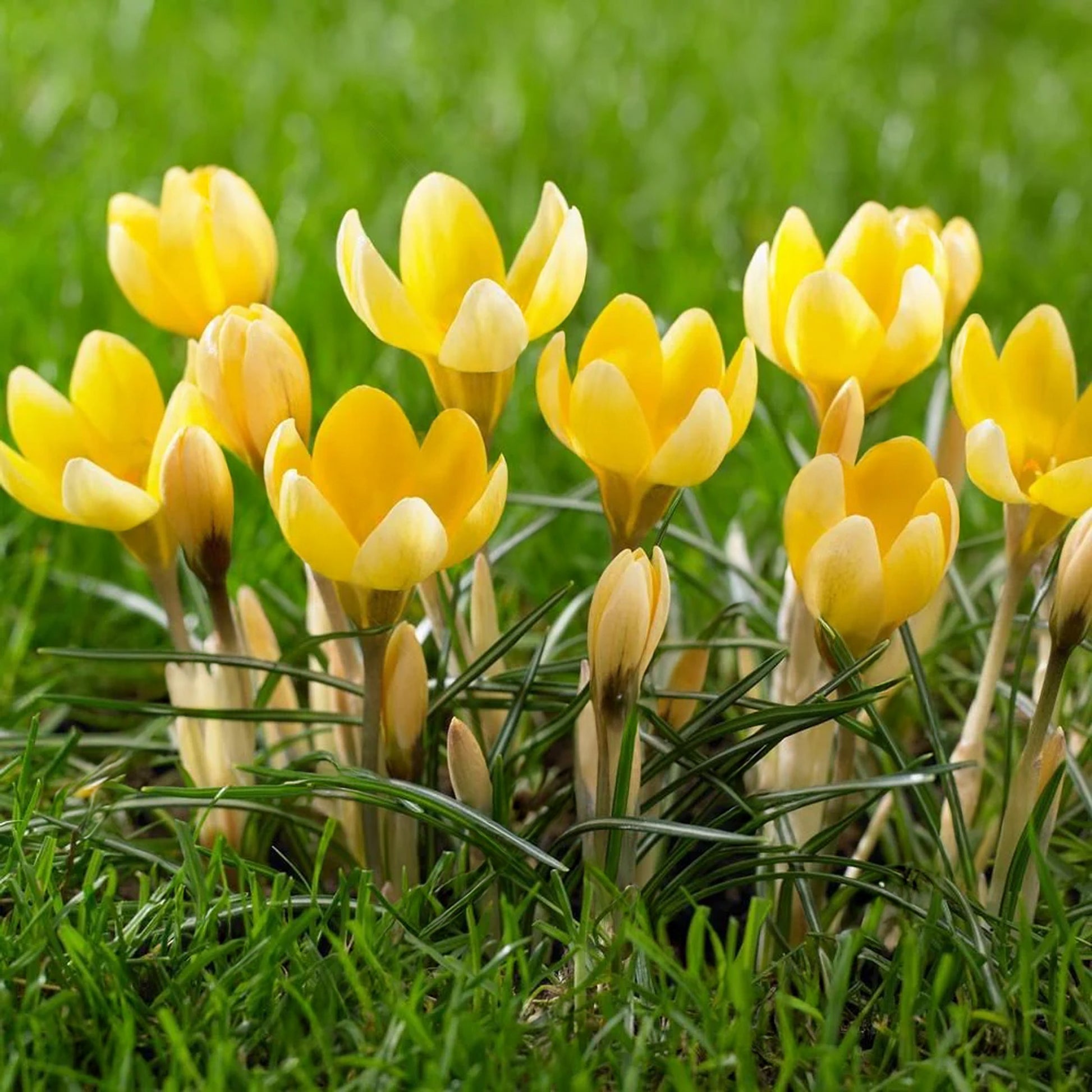 Crocuses are versatile bulbs that can be planted in lawns, beds, borders, or containers. Choose a spot in full sun or partial shade with well-draining soil and use a bulb planter or trowel to dig small holes 7-10cm apart. Plant one bulb to each hole at a depth of 10-15cm with the pointed end facing upwards. Backfill the holes, firm down the soil, and water in well.