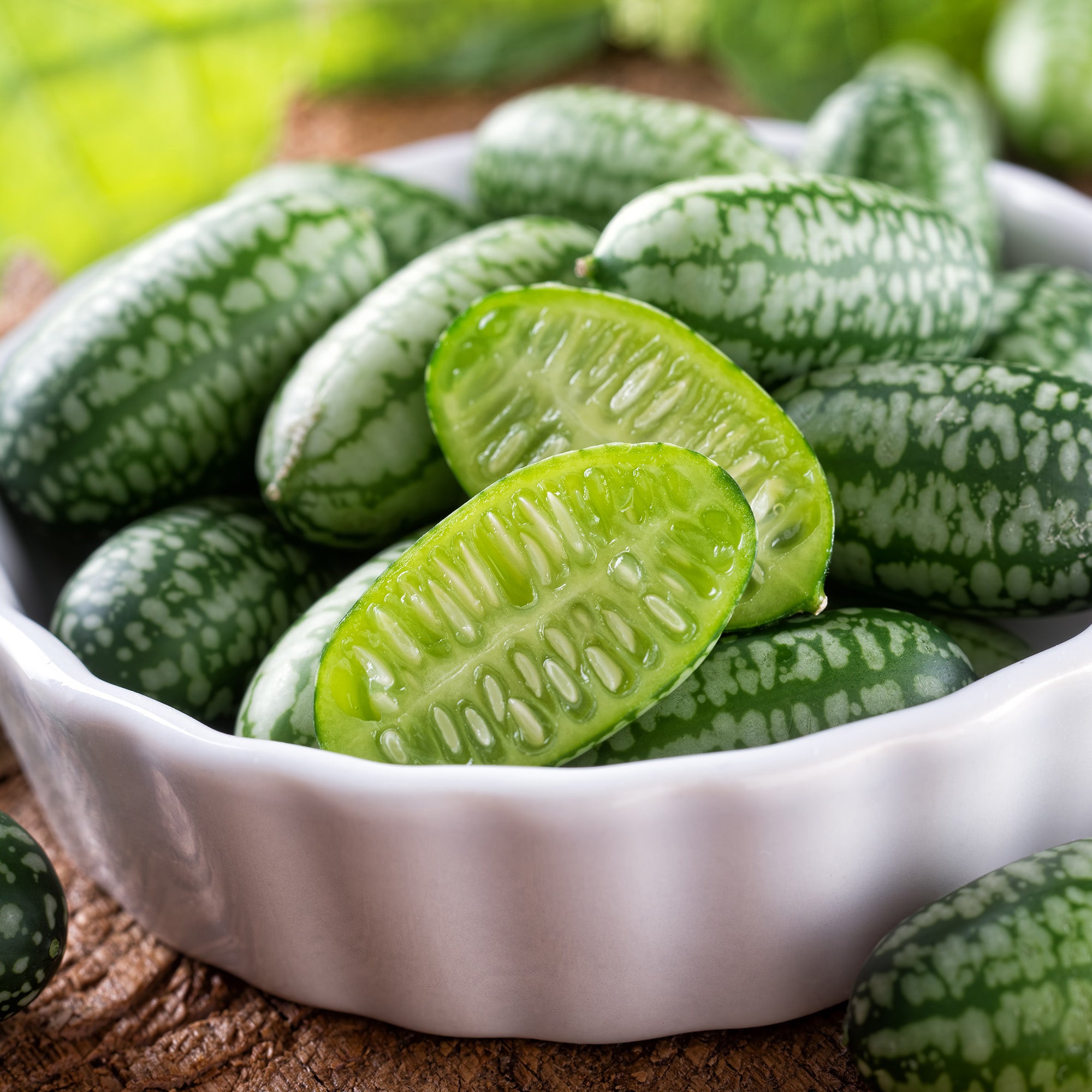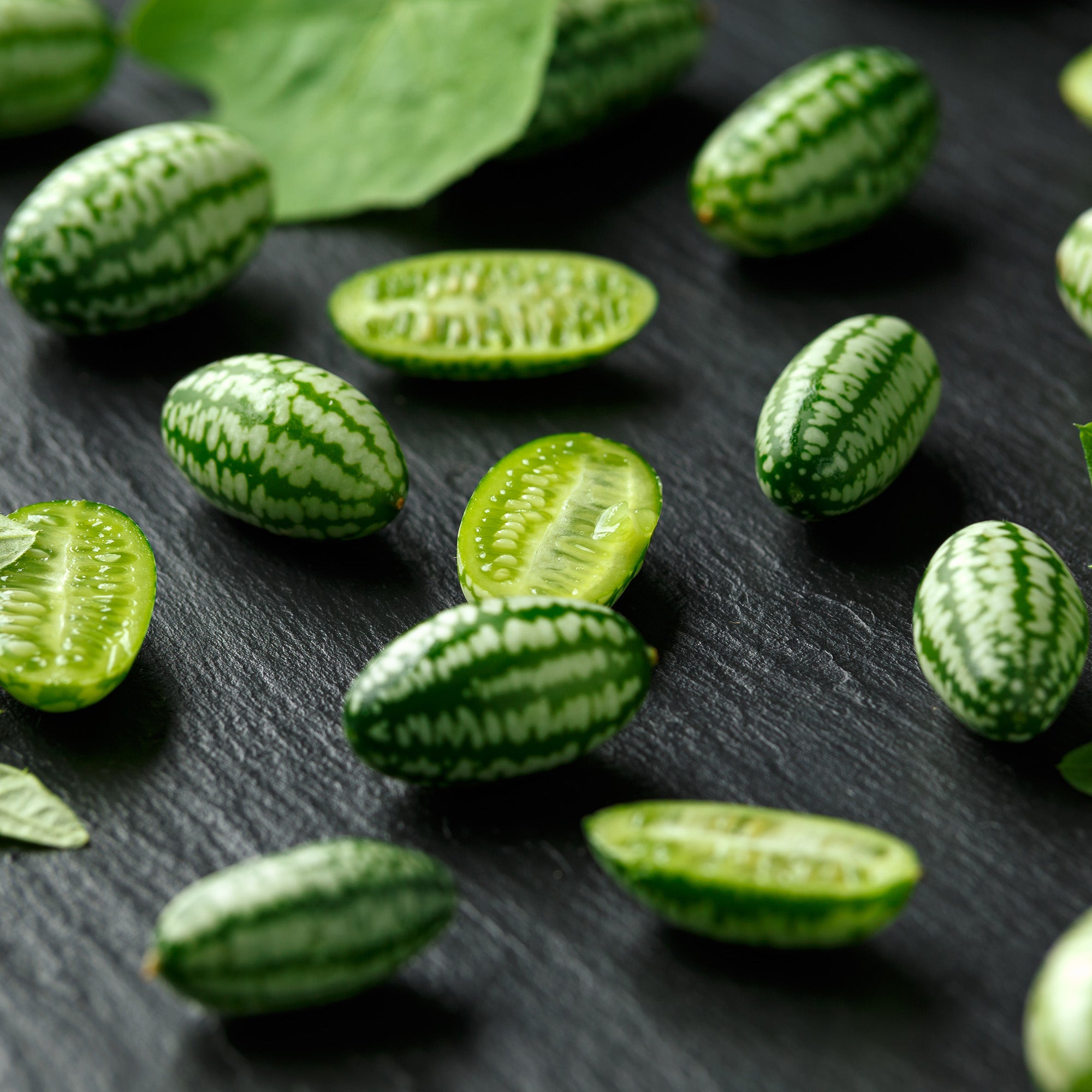 Cucamelons, also known as Mexican Sour Gherkins or Mouse Melons, are charming, grape-sized fruits that resemble miniature watermelons but taste like refreshing cucumbers with a hint of citrus. These vigorous climbers produce an abundance of bite-sized treats, perfect for snacking, pickling, or adding a zesty twist to summer salads and cocktails.