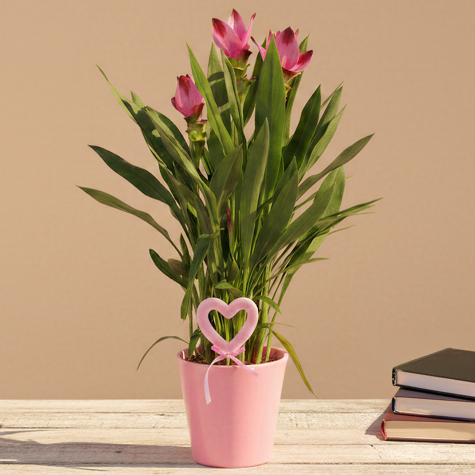 The Curcuma Splash, also known as the Siam Tulip, is a bright and eye catching plant that brings a fresh burst of colour into the home. Its upright flowers sit above lush, sword-shaped green leaves, creating a tidy and modern display that works well on shelves, tables or windowsills. The tulip-shaped bracts give the plant a distinctive look, making it a lovely choice for anyone who enjoys something a little different. Presented in a ceramic pot, this Siam Tulip arrives ready to display and makes a thoughtful gift for Valentine’s Day, Mother’s Day, birthdays, or simply as a cheerful surprise.
