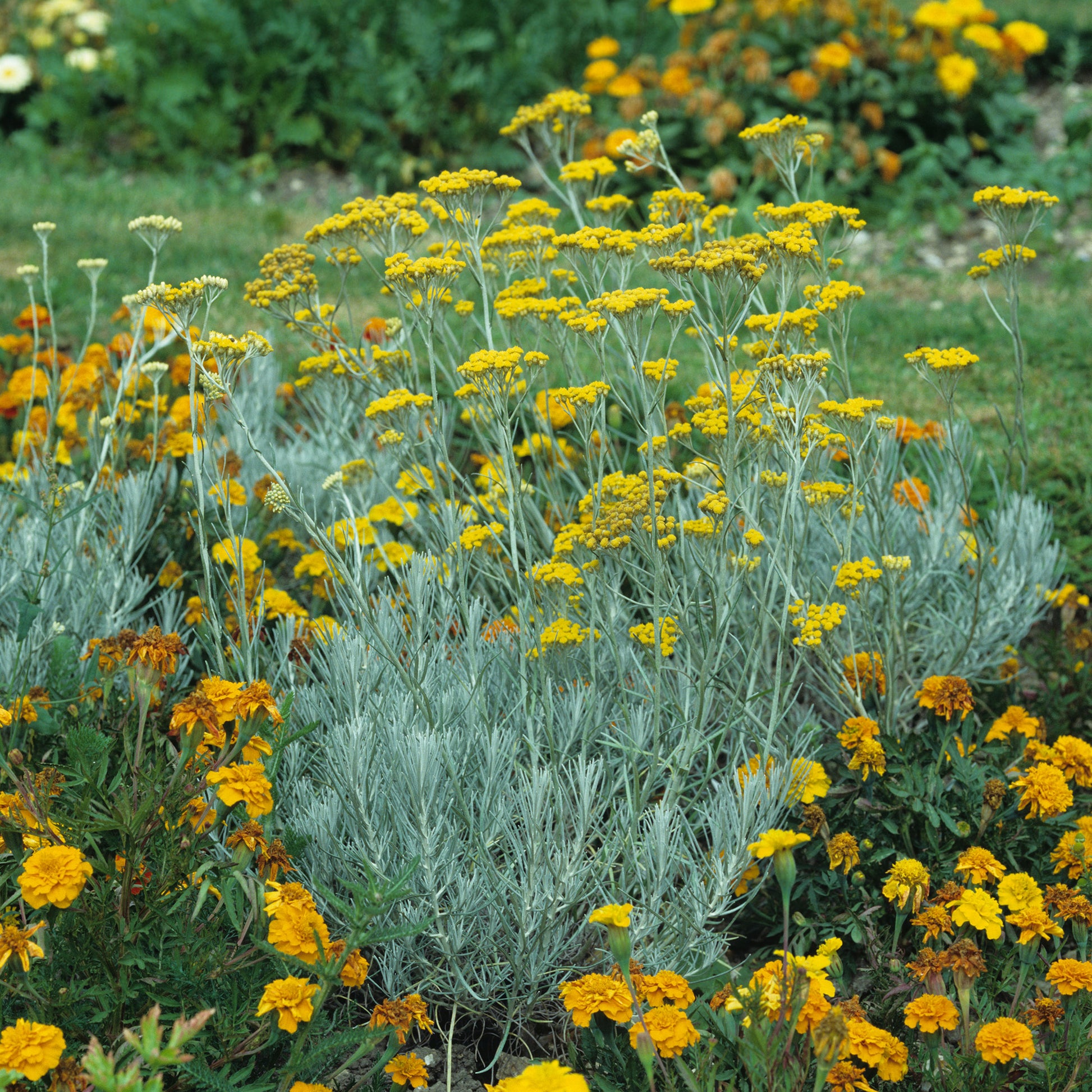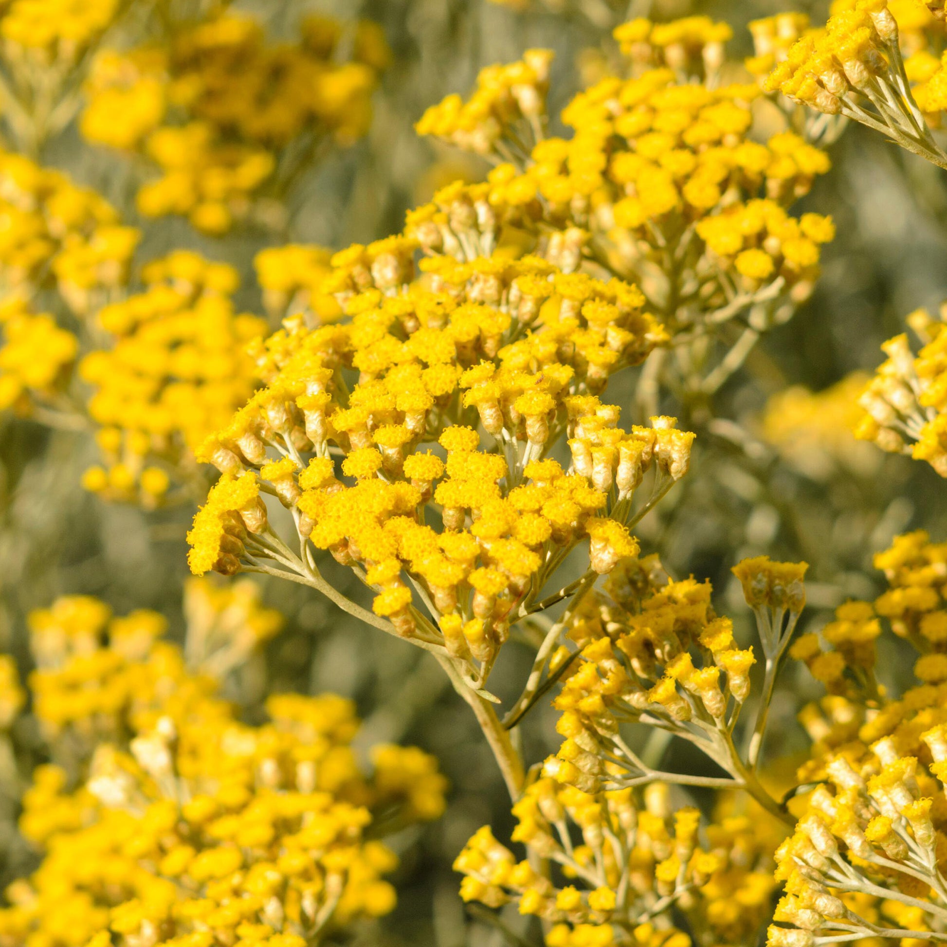 Commonly known as the curry plant, Helichrysum Italicum is an attractive garden herb with shimmering, silvery, linear foliage. It works well in flower beds and borders, contrasting beautifully with darker plants. In summer, domed clusters of tiny yellow flowers appear, attracting bees and other pollinators to the garden.