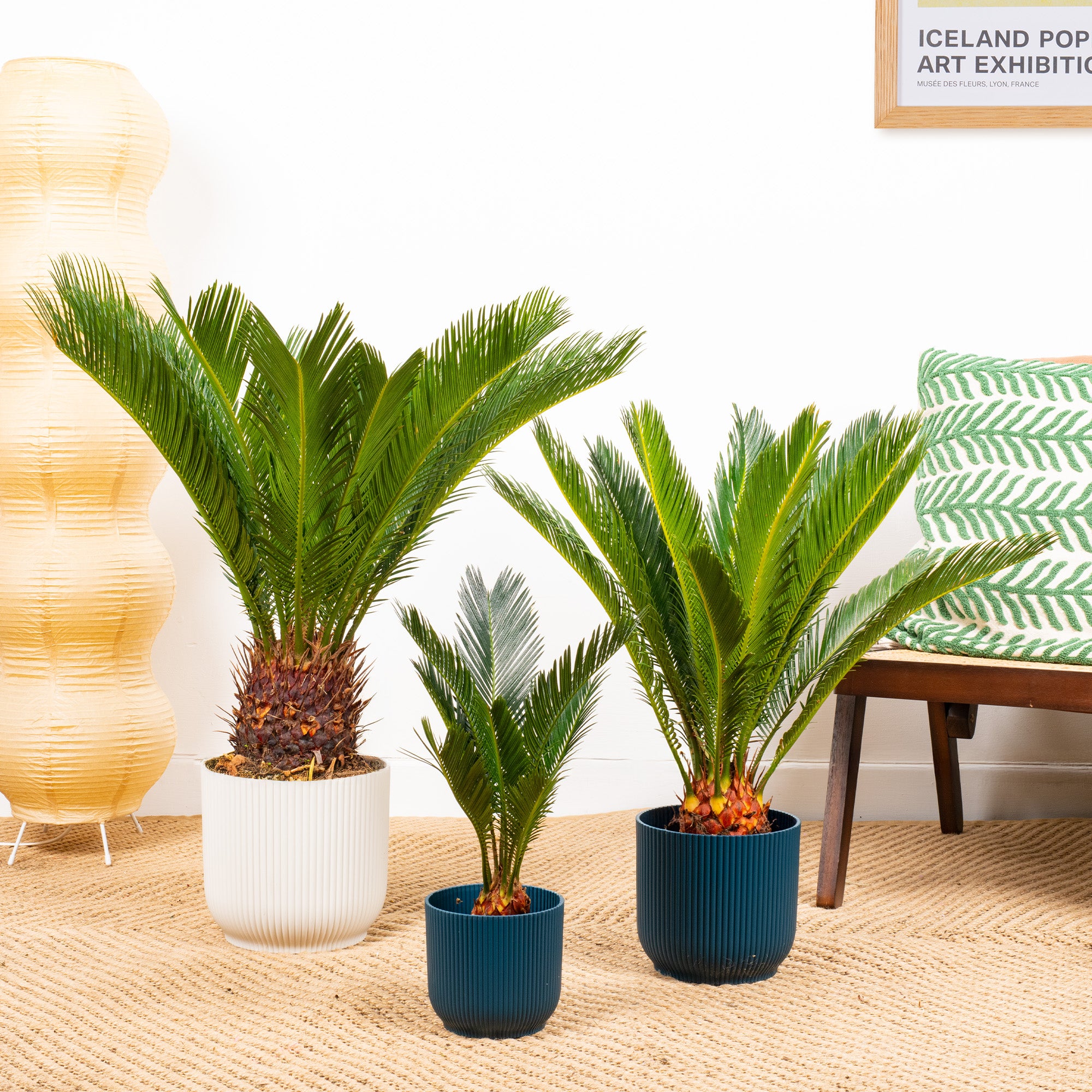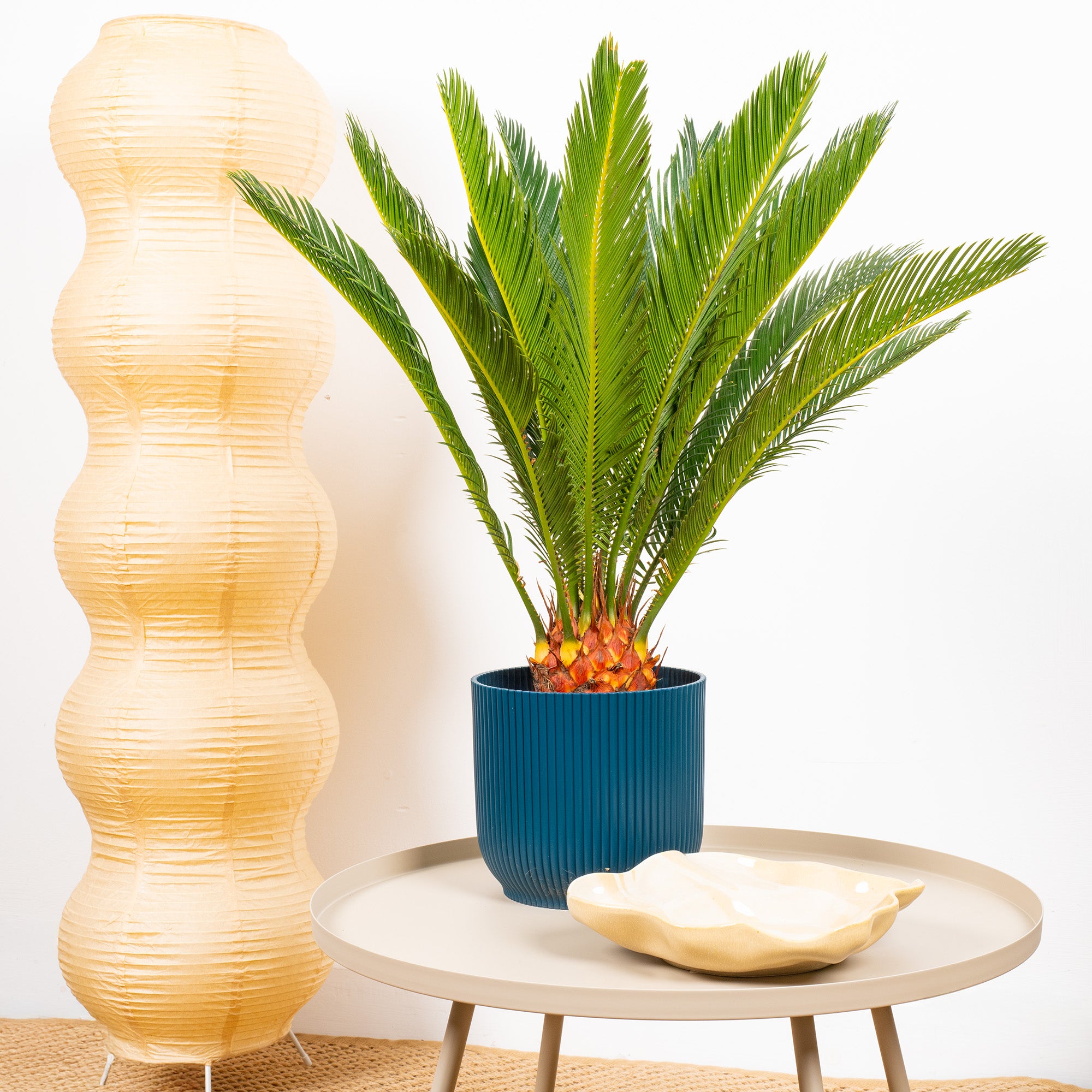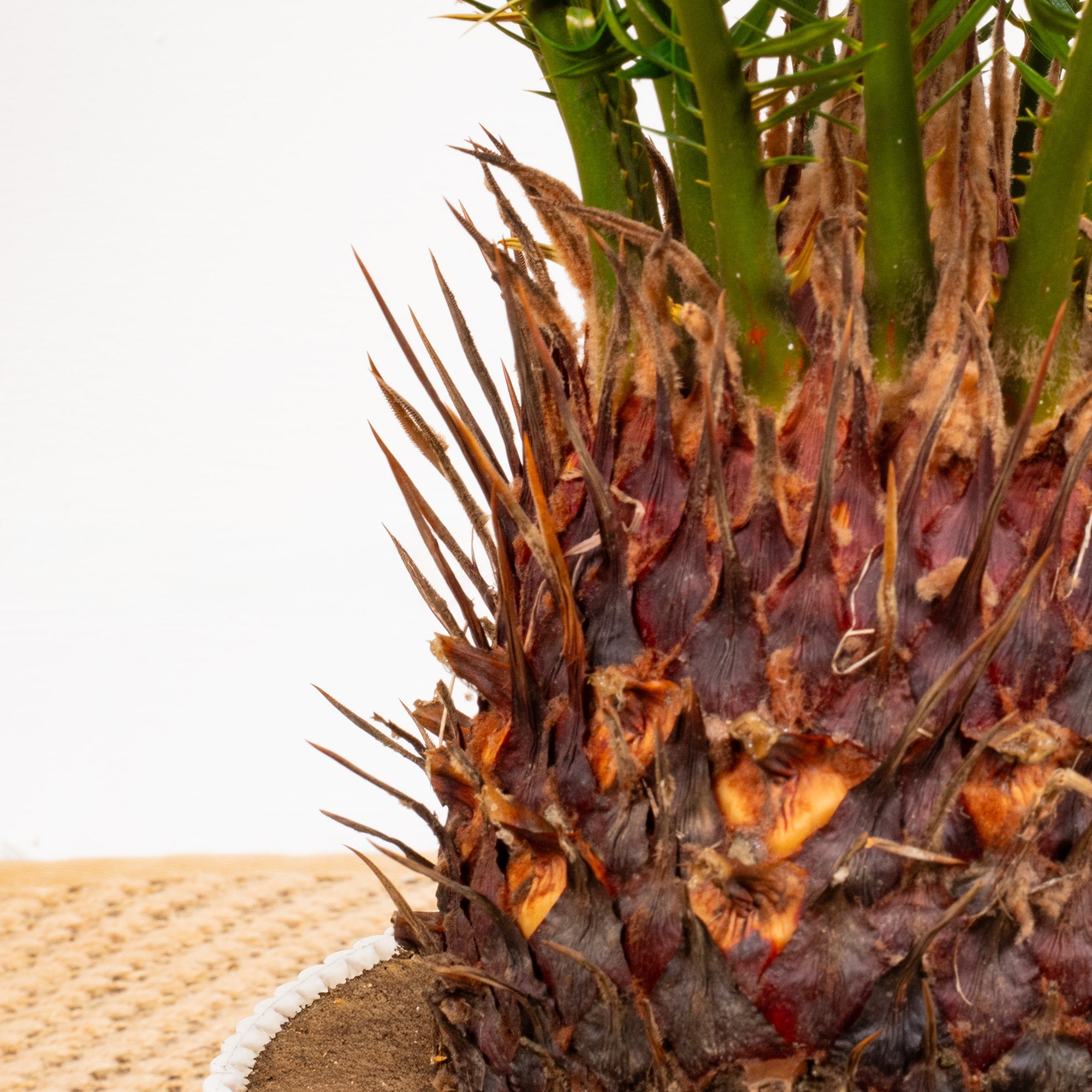 Keep your Cycas in a warm, sheltered spot away from cold drafts or frost for best results. Fertilise sparingly with a balanced fertiliser during the growing season to encourage lush foliage, but avoid overfeeding as it can damage the roots. Prune dead or yellowing leaves at the base to maintain a tidy appearance and promote new growth.