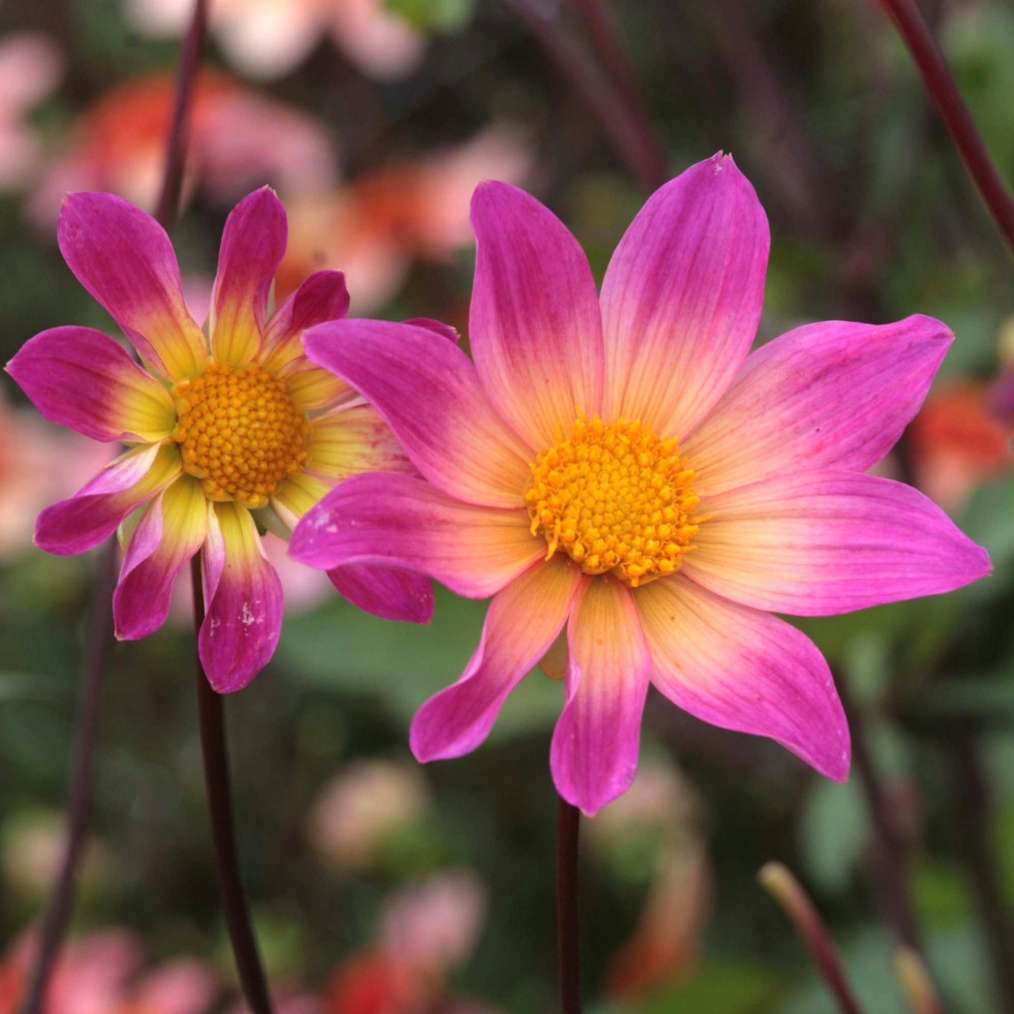 A display of Bright Eyes Dahlias will be the envy of your neighbours. The large single flowers grow in abundance and boast yellow centres that blend into pink-purple petals for an intense show of colour.