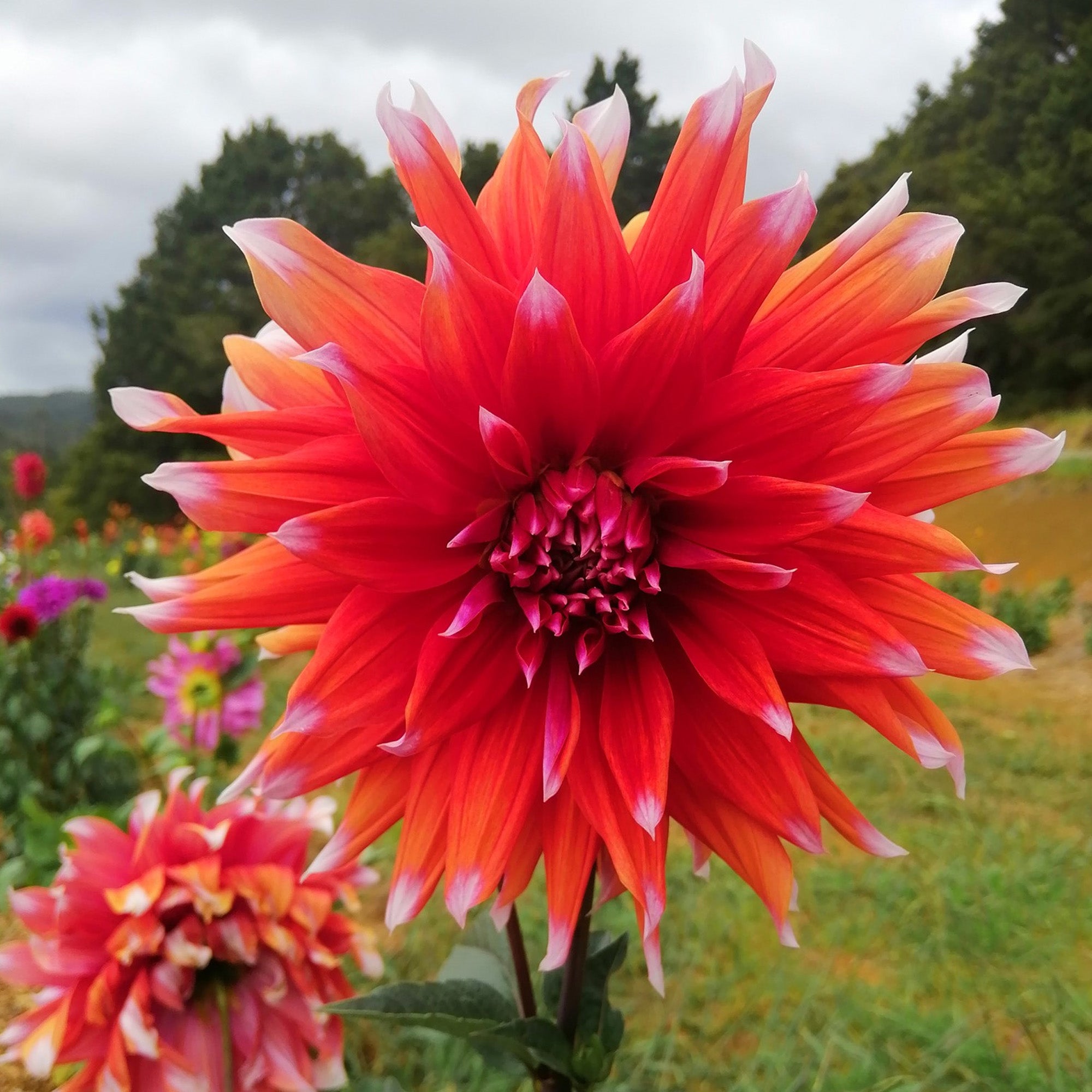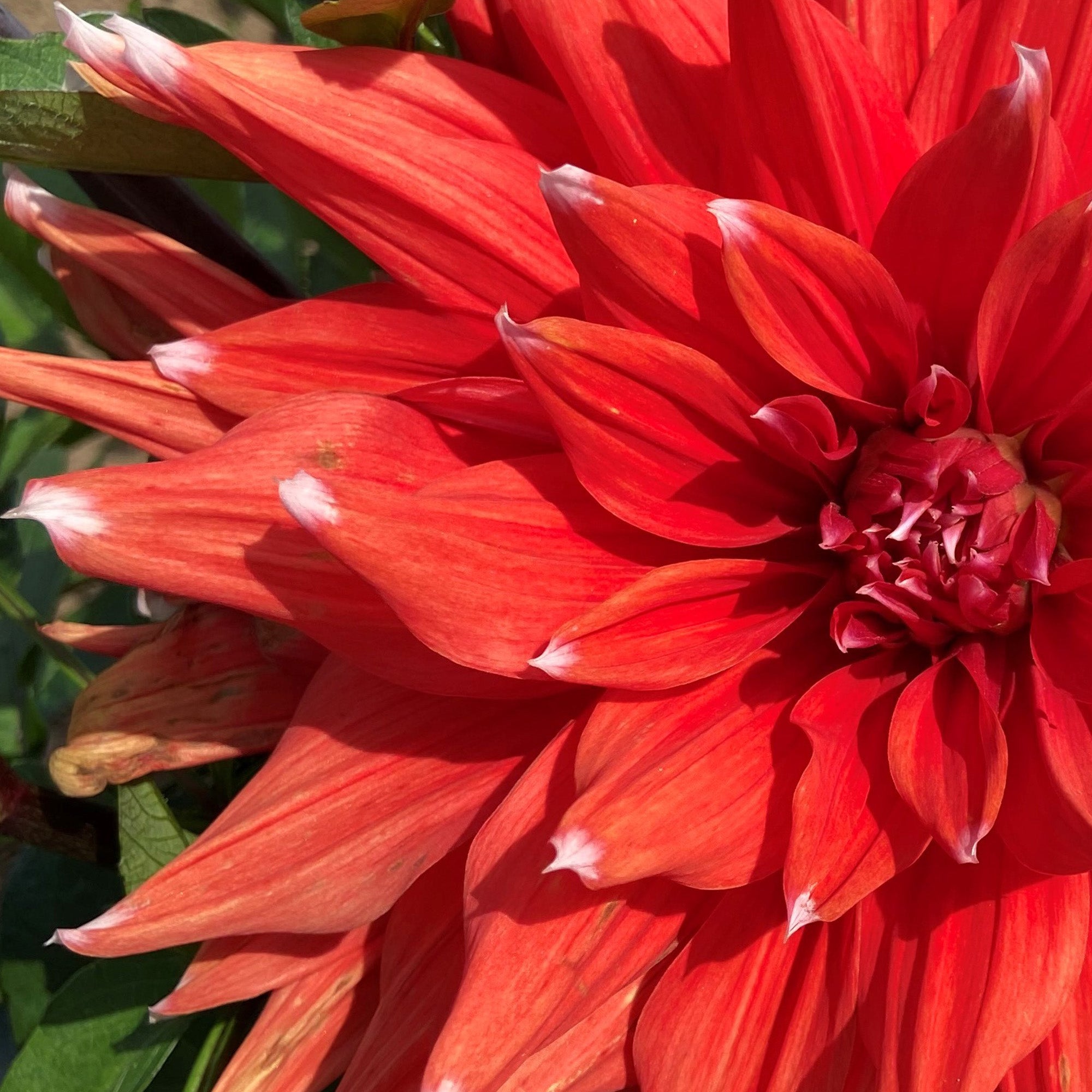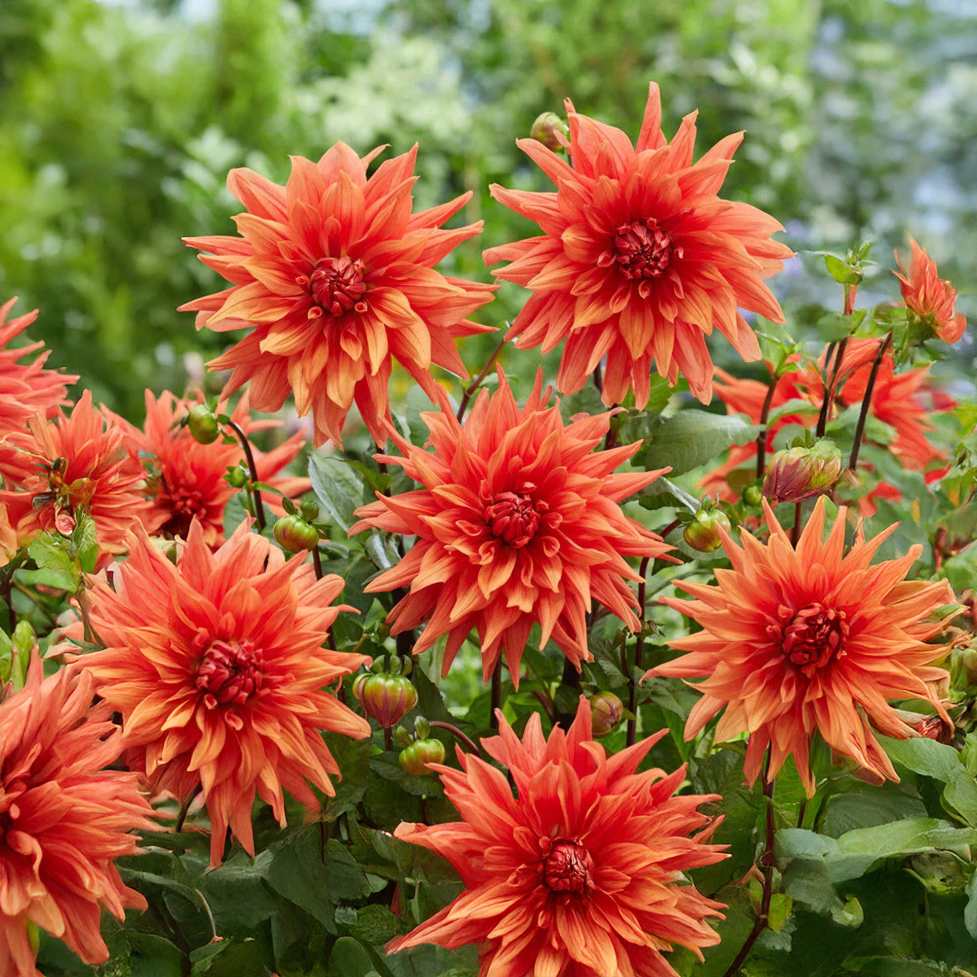 Dahlia Colour Spectacle is incredibly well-named. These bulbs produce a vibrant show of large, vividly coloured blooms that last from early summer right through to the first frosts. The flowers boast an abundance of bright orange petals that feature small white tips for a dramatic sunburst effect.