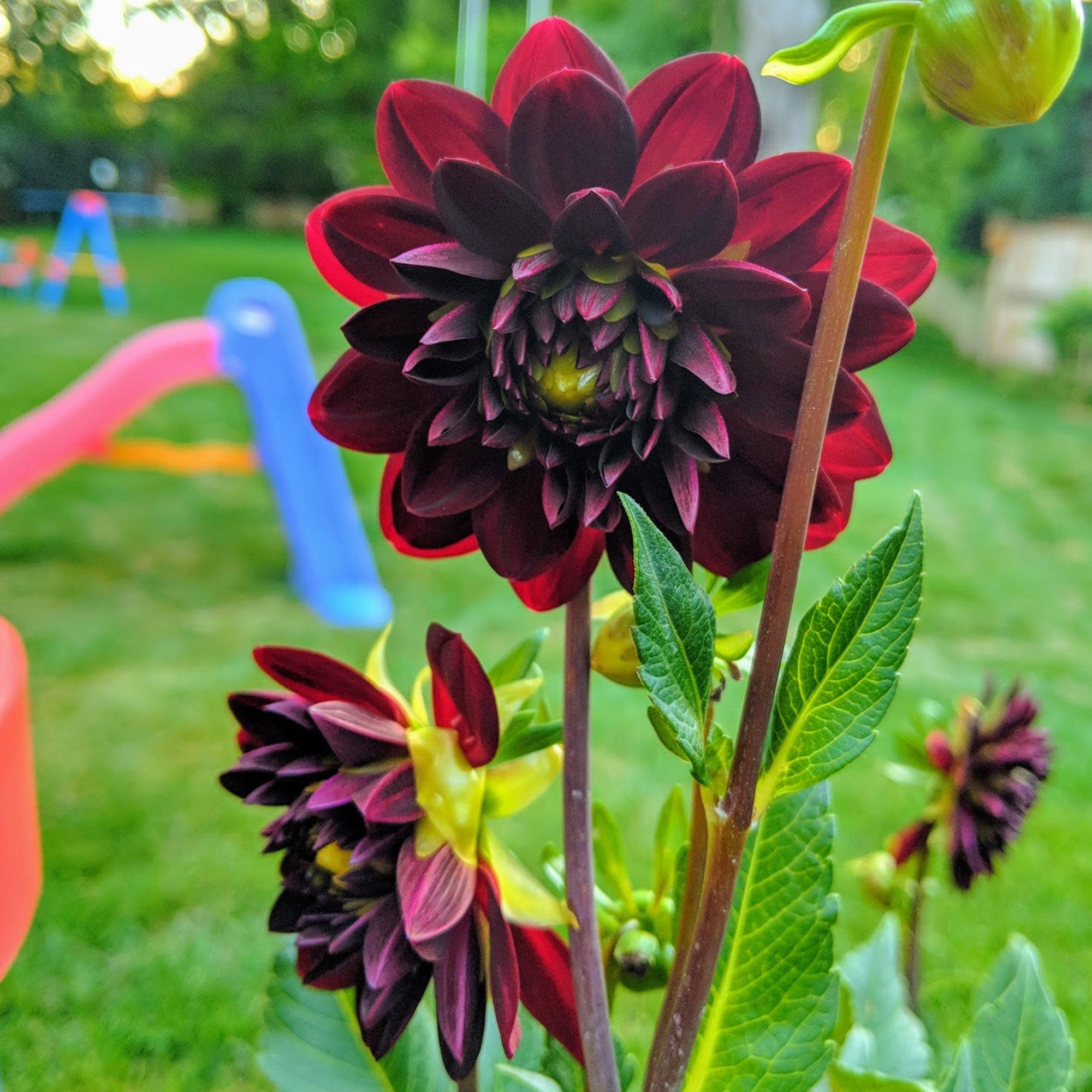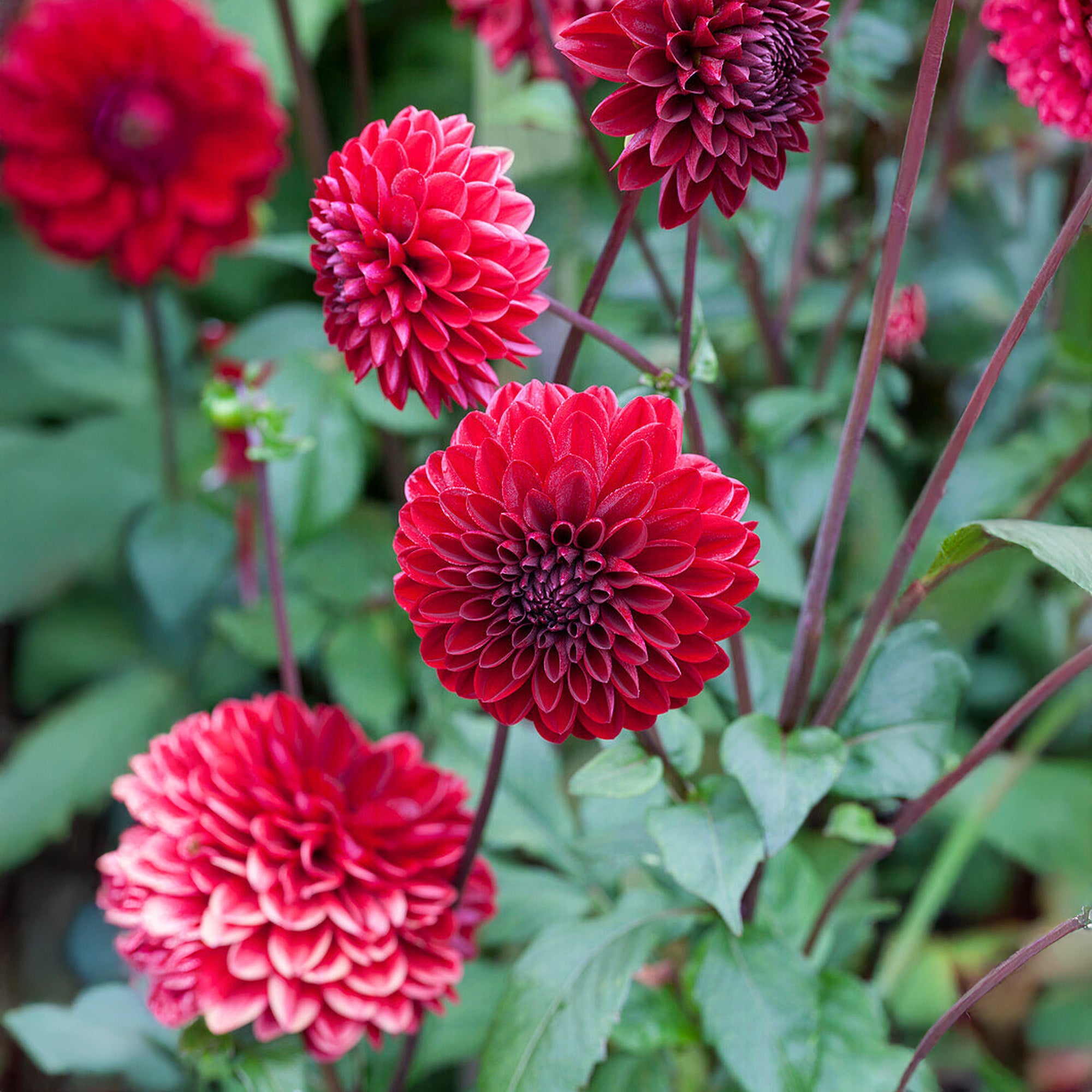Night Queen is a decorative ball dahlia with neatly rounded small-medium flowers in a glorious shade of deep crimson red. In certain lights, the petals can even appear almost black. The blooms grow on tall stems to 120cm high and contrast beautifully with the rich green foliage beneath.