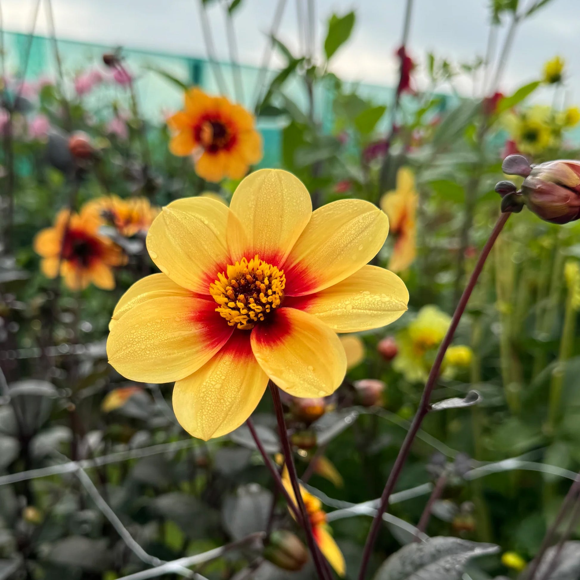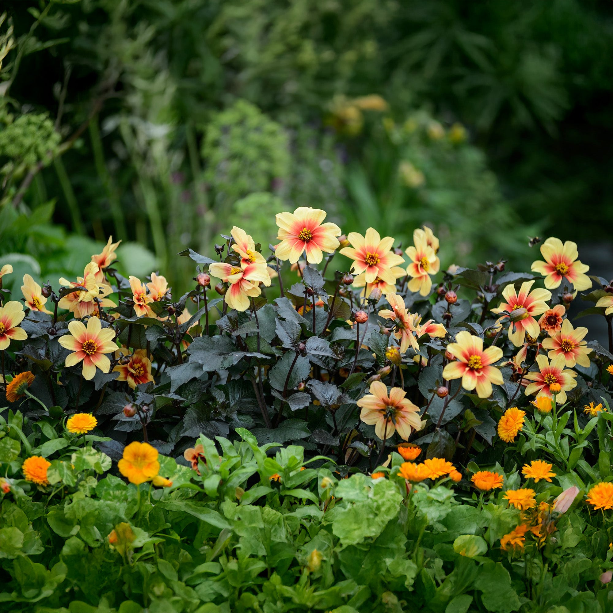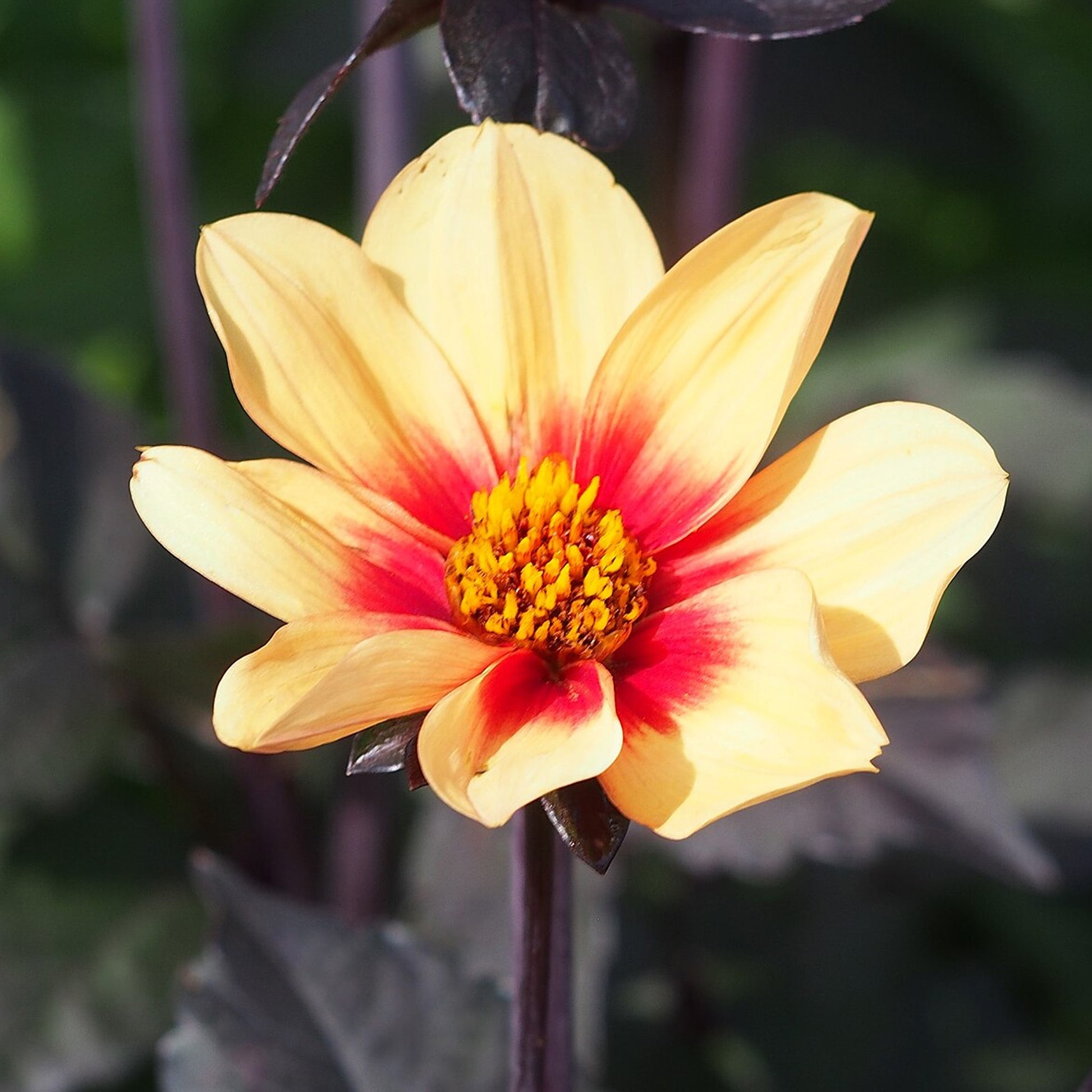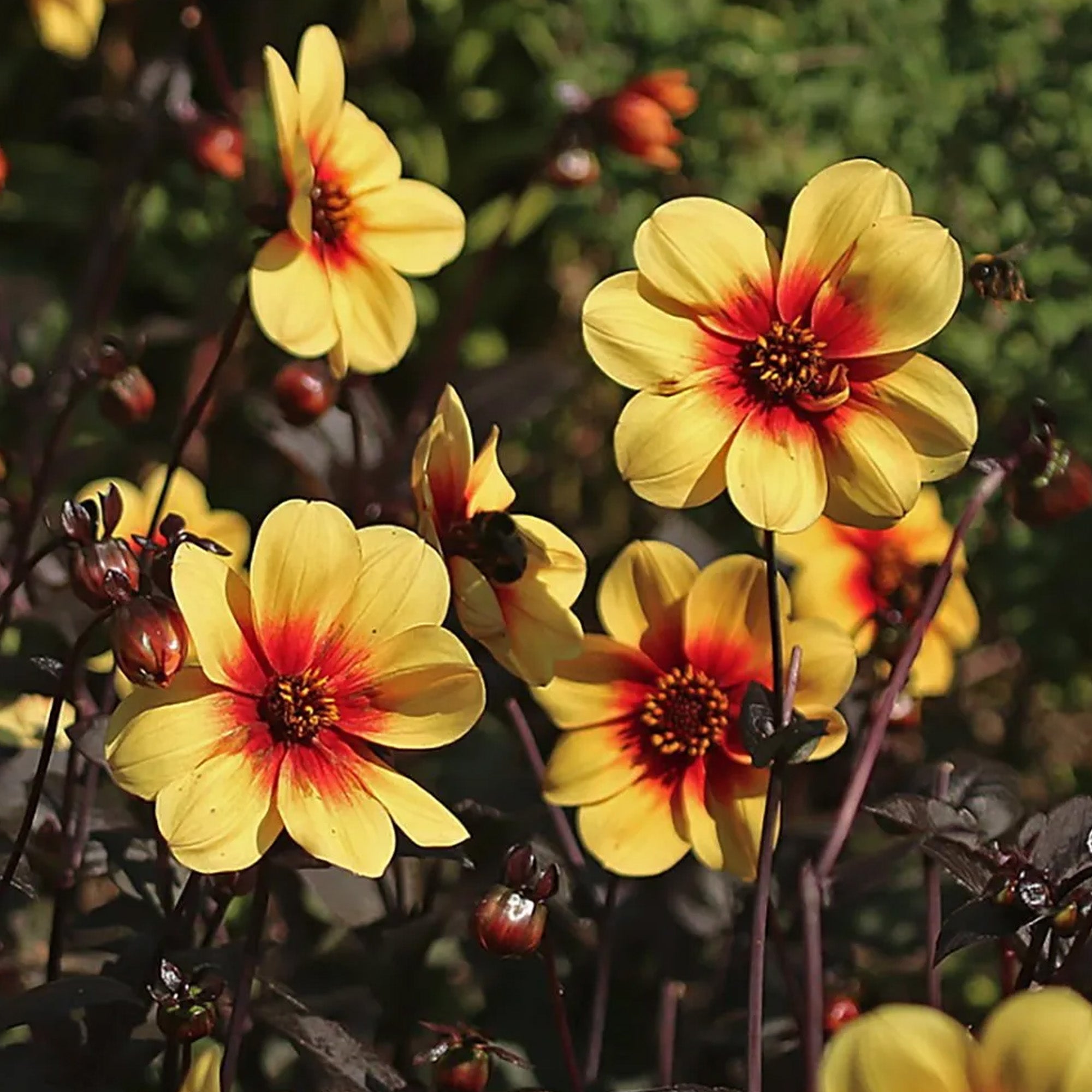 Dahlia Sunshine is also known as Moonfire Dahlia and boasts bright yellow single flowers that blend into orange in the middle. Dark green foliage is tinged with purple tones and contrasts beautifully with the blooms as they flower from mid-summer into autumn.