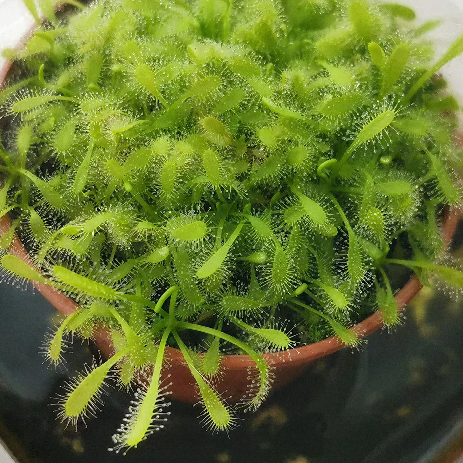Water Sundew plants with rainwater or distilled water, keeping the soil consistently moist at all times. Avoid tap water, as minerals can harm the plant, and ensure the pot never dries out.