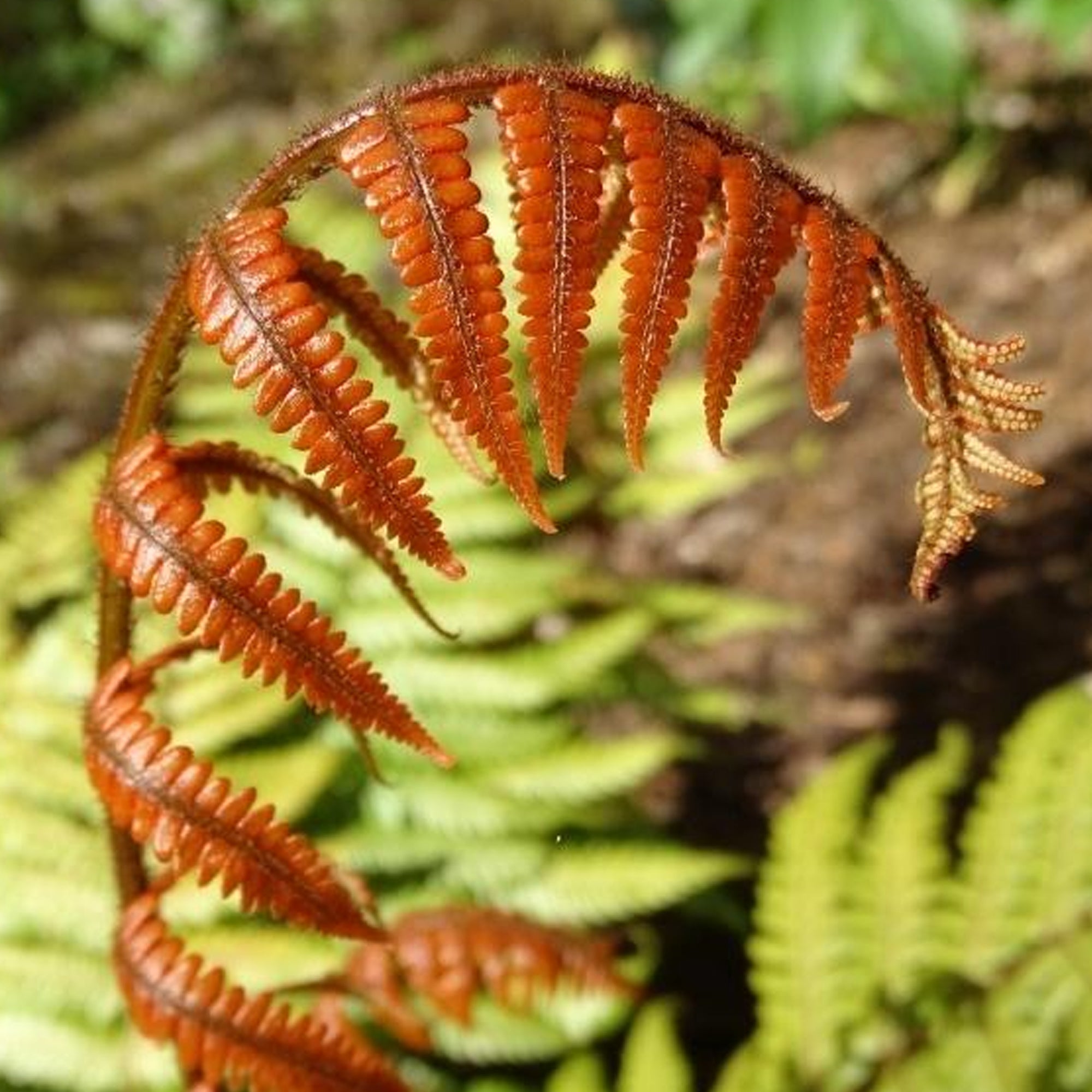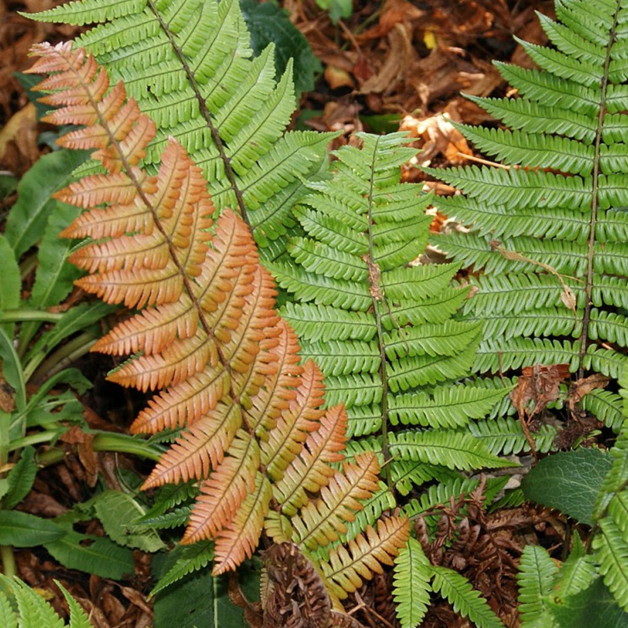 Known commonly as Sunset fern, Dryopteris lepidopoda is a semi-evergreen, clump forming, hardy fern. In spring, the fern produces upright to arching fronds that grow in as an orange-pink colour, before maturing to olive green.