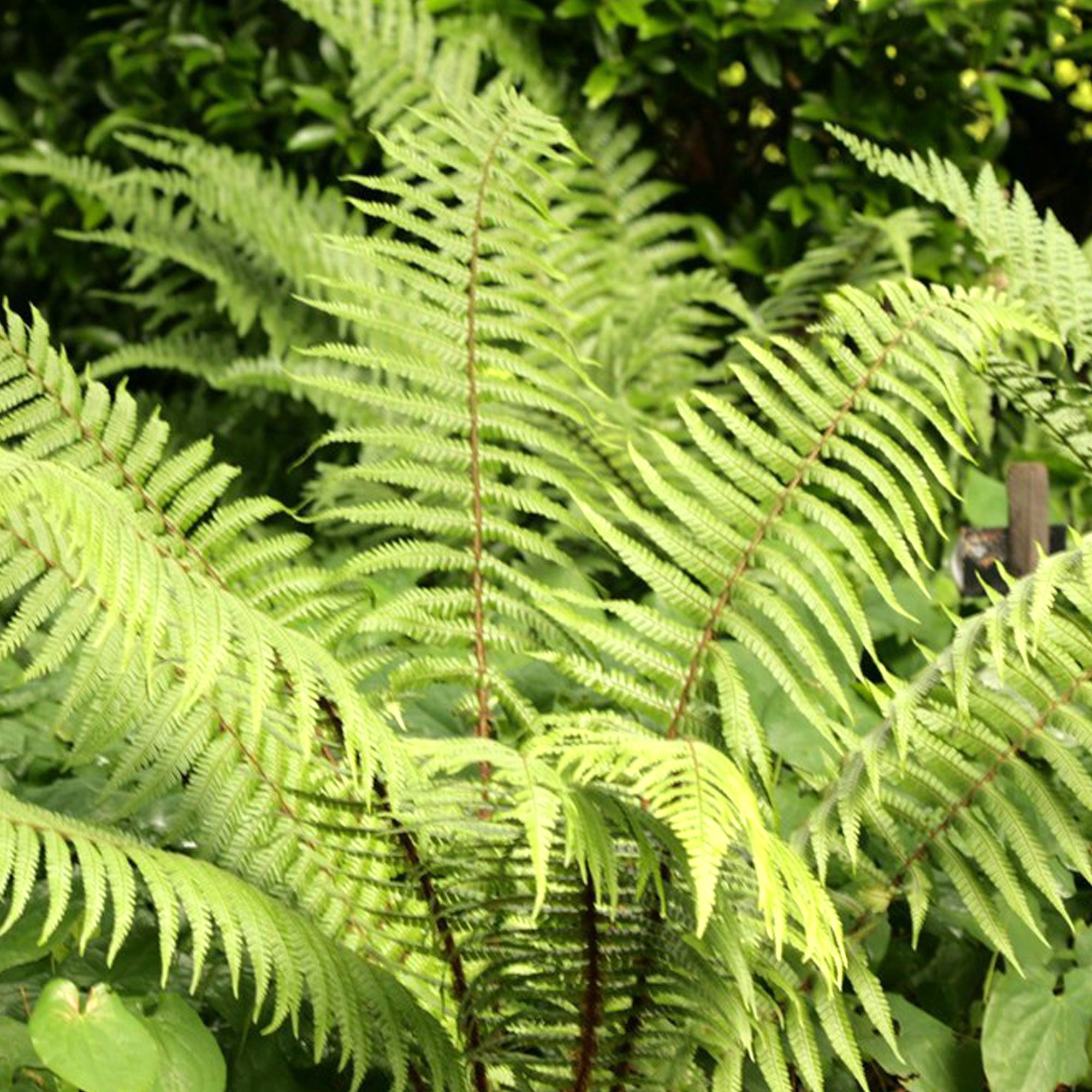 A tufted, semi-evergreen hardy fern, known commonly as alpine wood fern. A Dryopteris wallichianas fronds appear in spring as a vibrant yellow-green before maturing to a forest green. The colour of the pinnae is contrasted with the brown-black stem and midrib of the fronds.