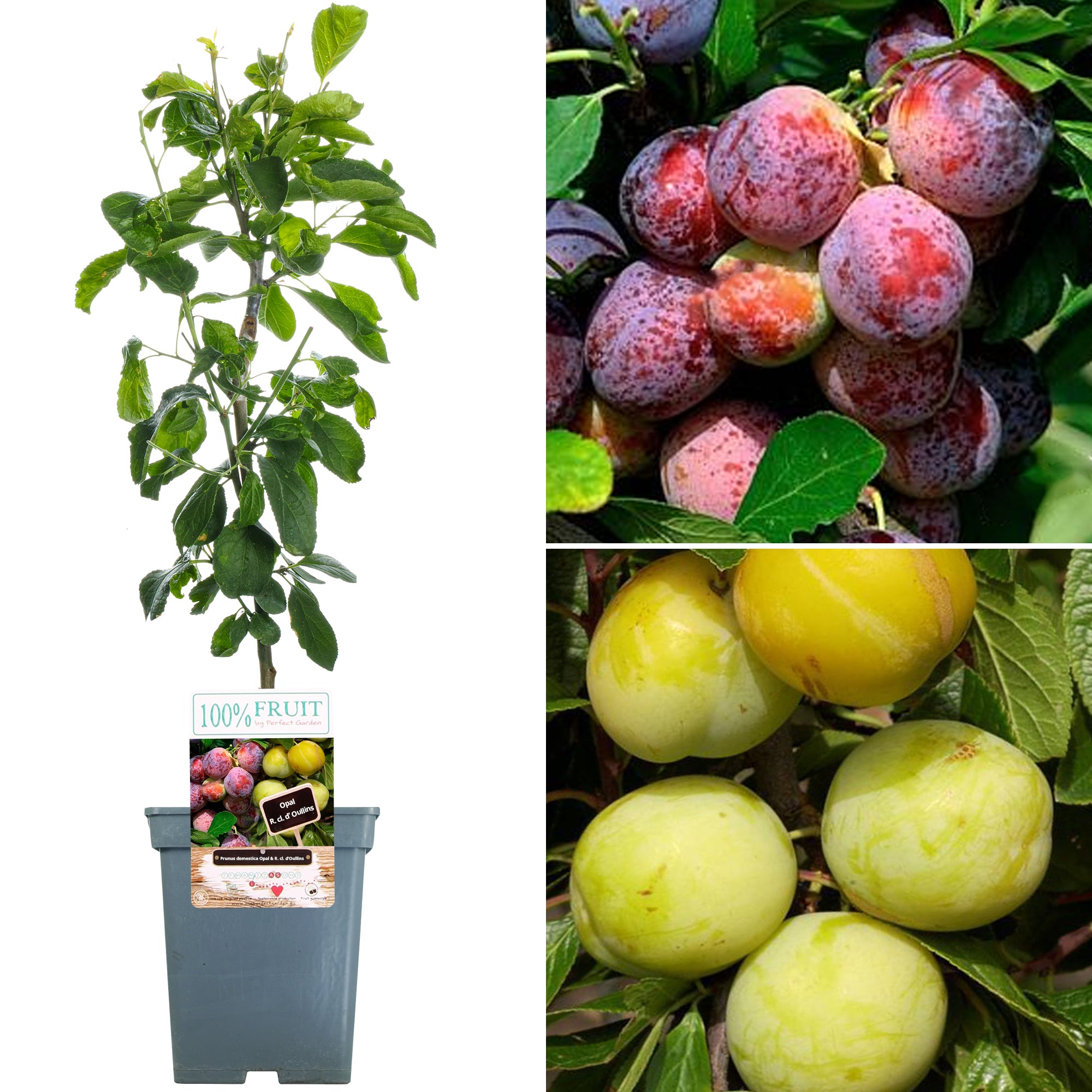 Duo Plum Trees - A hardy and tough tree that can tolerate most soil types except very chalky or badly drained areas. This tree is very reliable and will produce heavy crops of fruit ready for picking in late August. The fruits are preceded by lovely white flowers in April and May that attract birds and butterflies into your garden. The fruits are oval in shape and have a pale red to purple skin flushed with golden-yellow. The flesh is golden-yellow and juicy with a delicious sweet flavour. Prunus domestica 'Reine Claude d'Oullin' & ‘Opal’ has its heritage in Sussex in the 19th century.