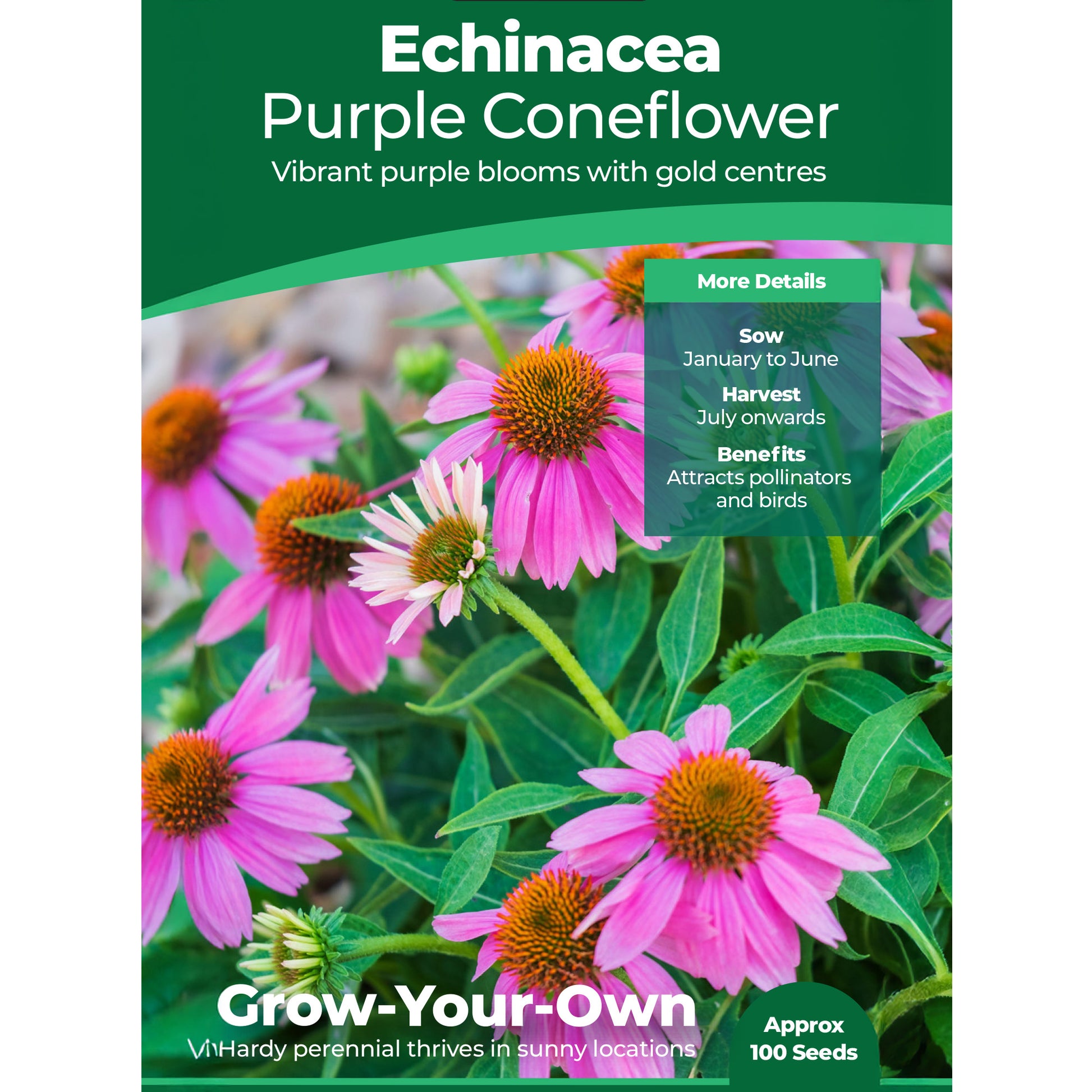 This pack of Echinacea purpurea seeds produces an abundance of large, long-lasting blooms all summer long. The purple-pink daisy-like petals are complemented by raised cones in the centre - hence the plant’s common name, Coneflower. These colourful flowers are irresistible to pollinators, attracting bees and butterflies into the garden. Strong stems also make Coneflowers ideal for creating cut flower vase displays.