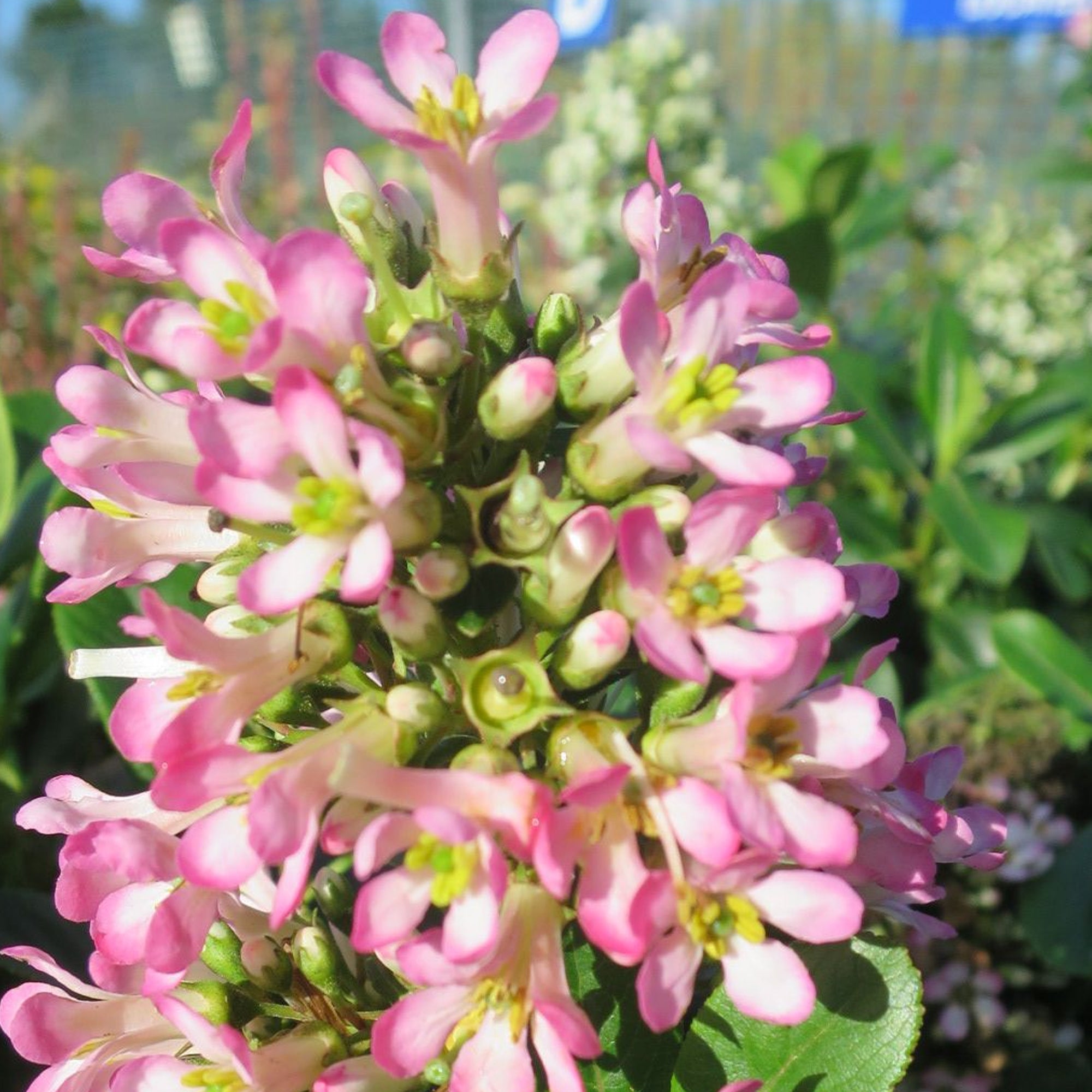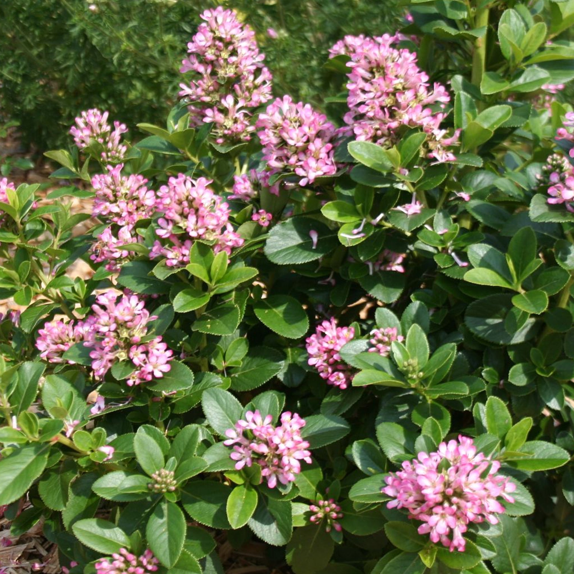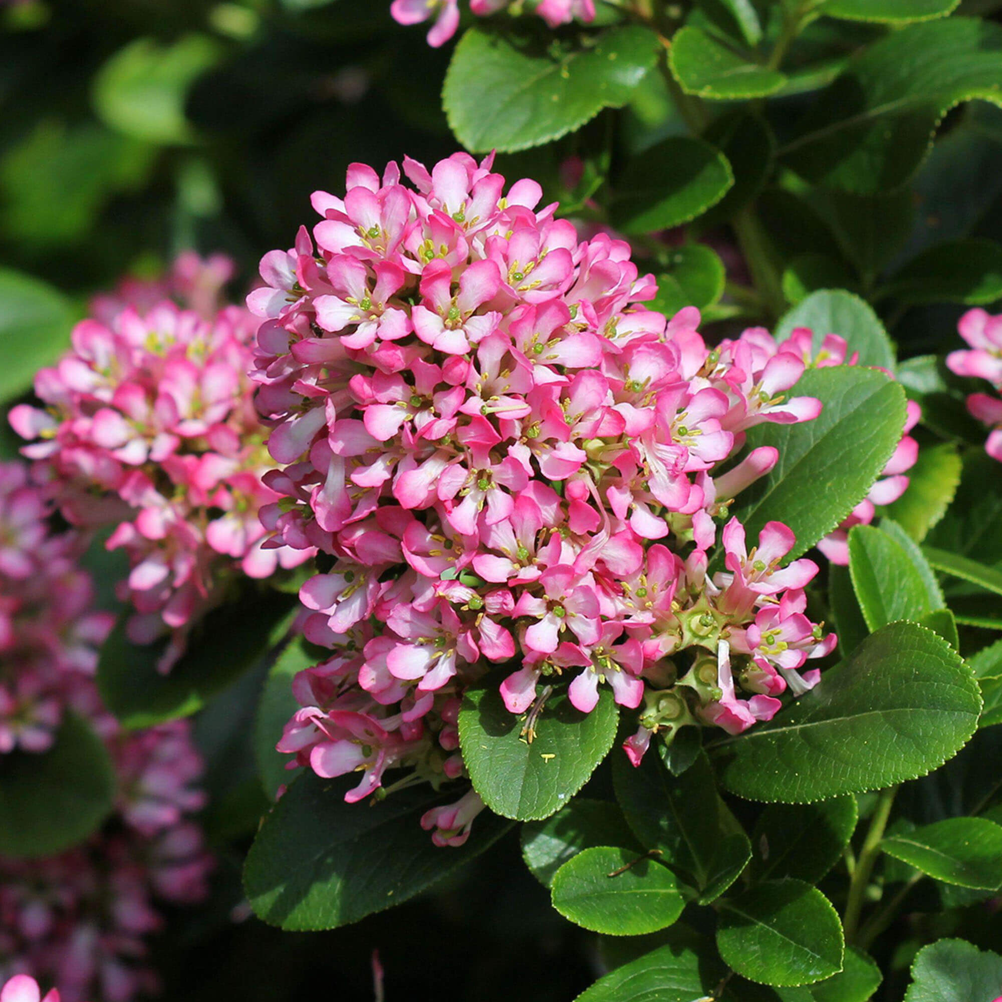 A variety of the popular species, Escallonia laevis ‘Pink Elle’ is a lovely addition to the garden and a great choice due to its ease of care and low maintenance. An evergreen shrub with glossy, leathery dark green foliage with toothed edges and trusses of larger mid-pink flowers that emerge in abundance from early to mid-Summer and again, though with less quantity in the early Autumn months. A great shrub for informal hedging and late blooming beds.
