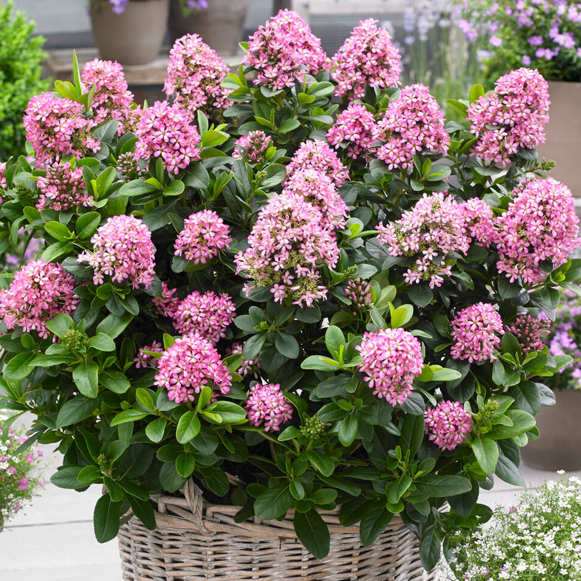 Escallonia Pink Elle grows well in pots and containers and is perfect for brightening up patios, driveways and terraces, as well as flanking entrances.