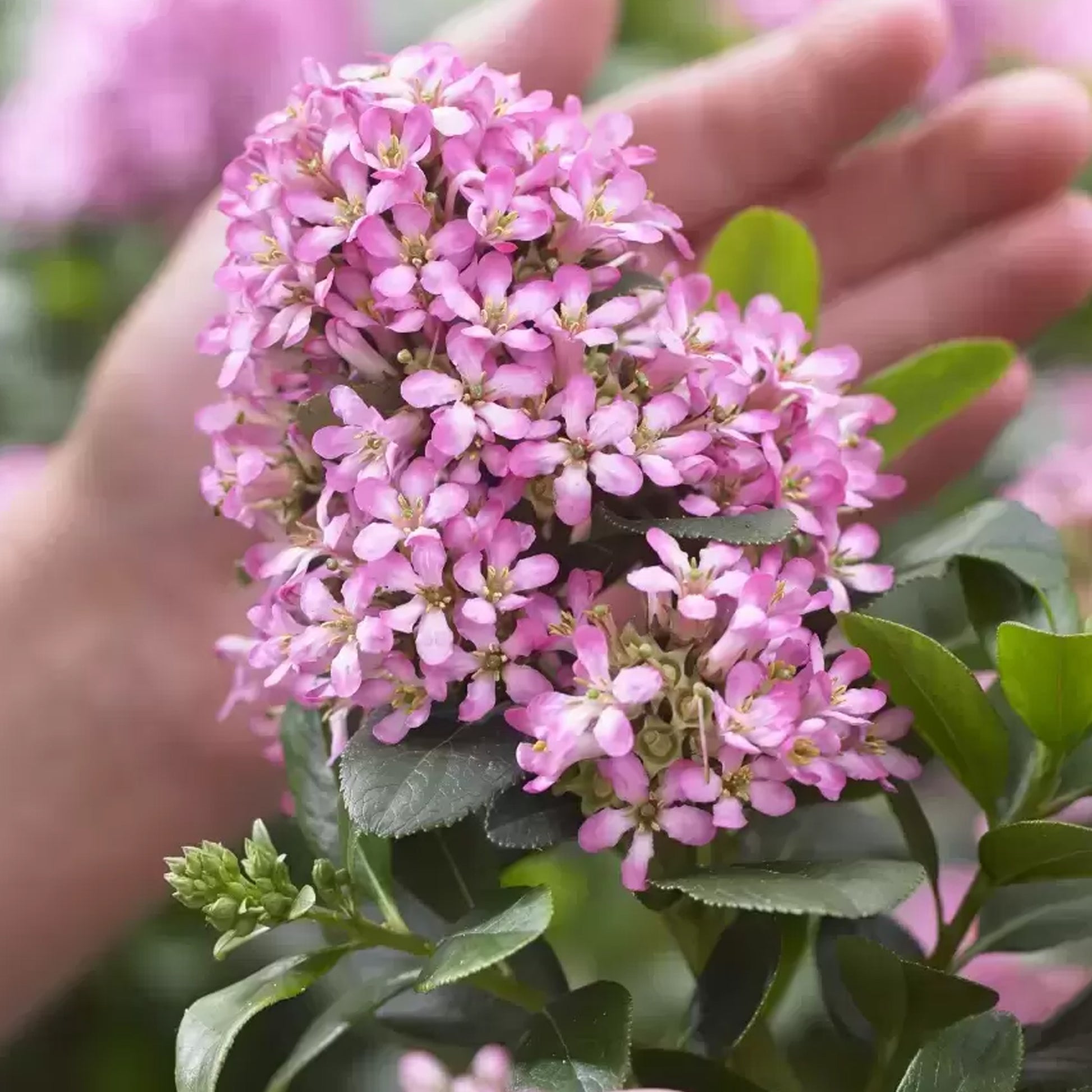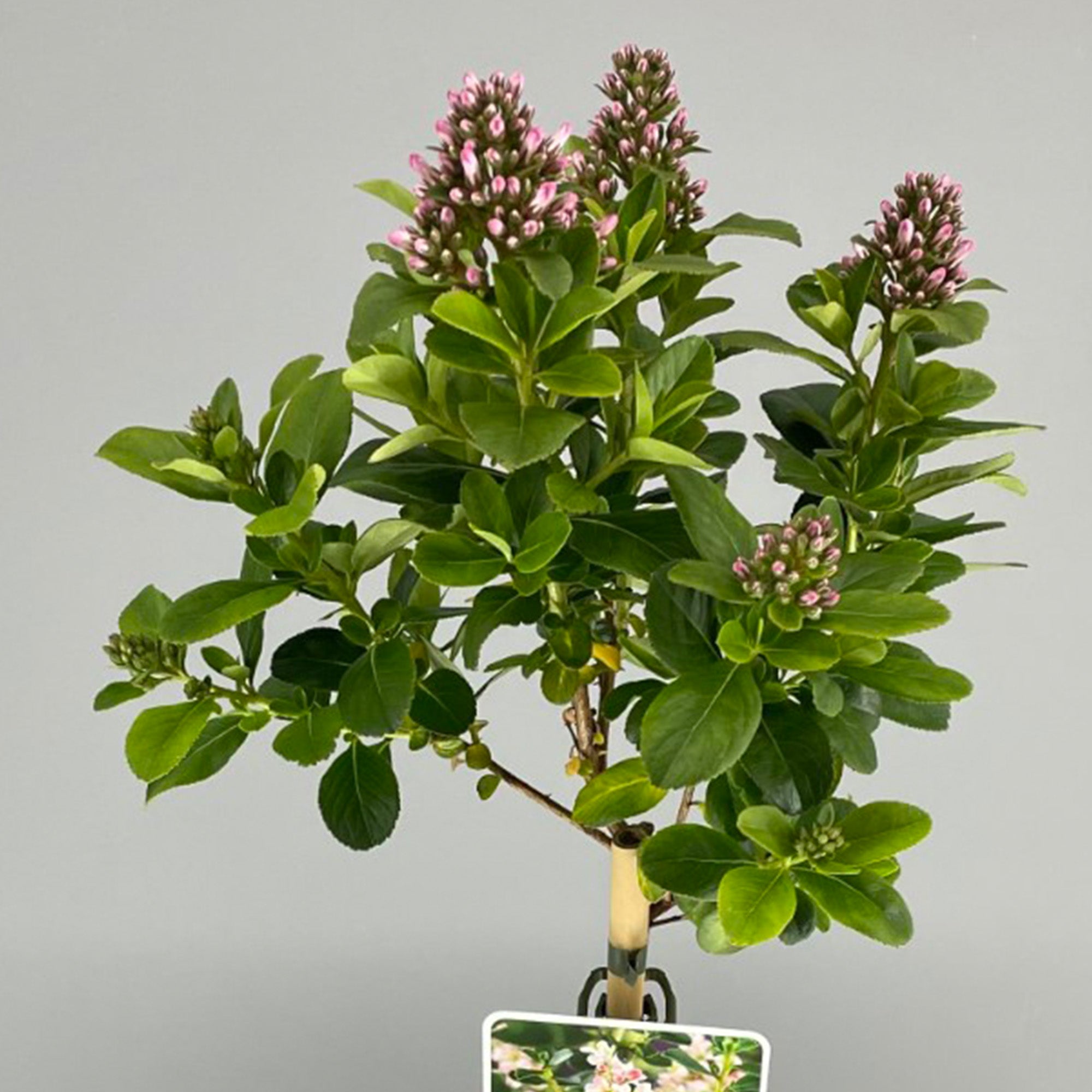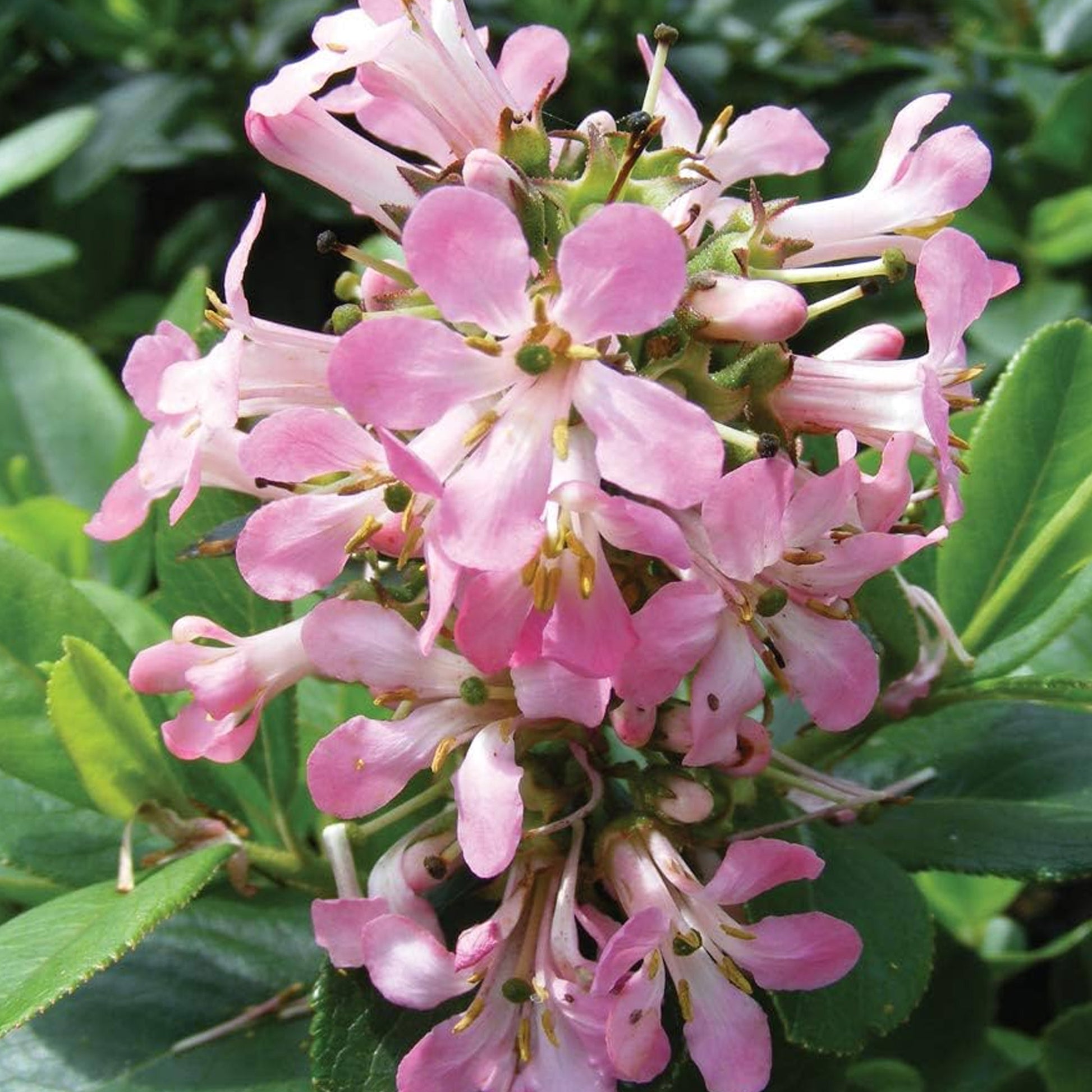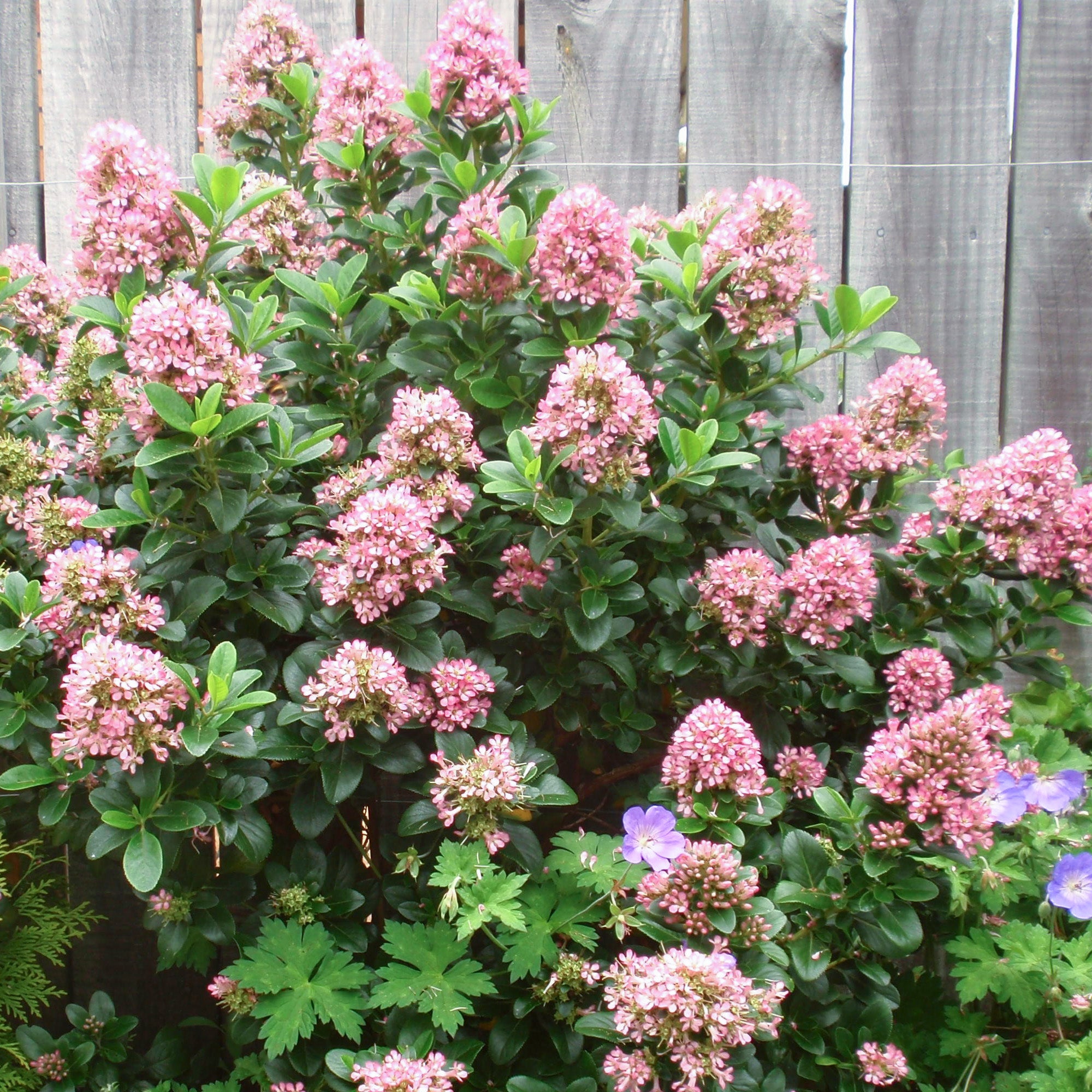 This cultivar boasts glossy green, ovate leaves that remain in place throughout the year, providing winter colour and interest. Large clusters of small, five-petalled, mid-pink flowers adorn the foliage through summer and autumn.