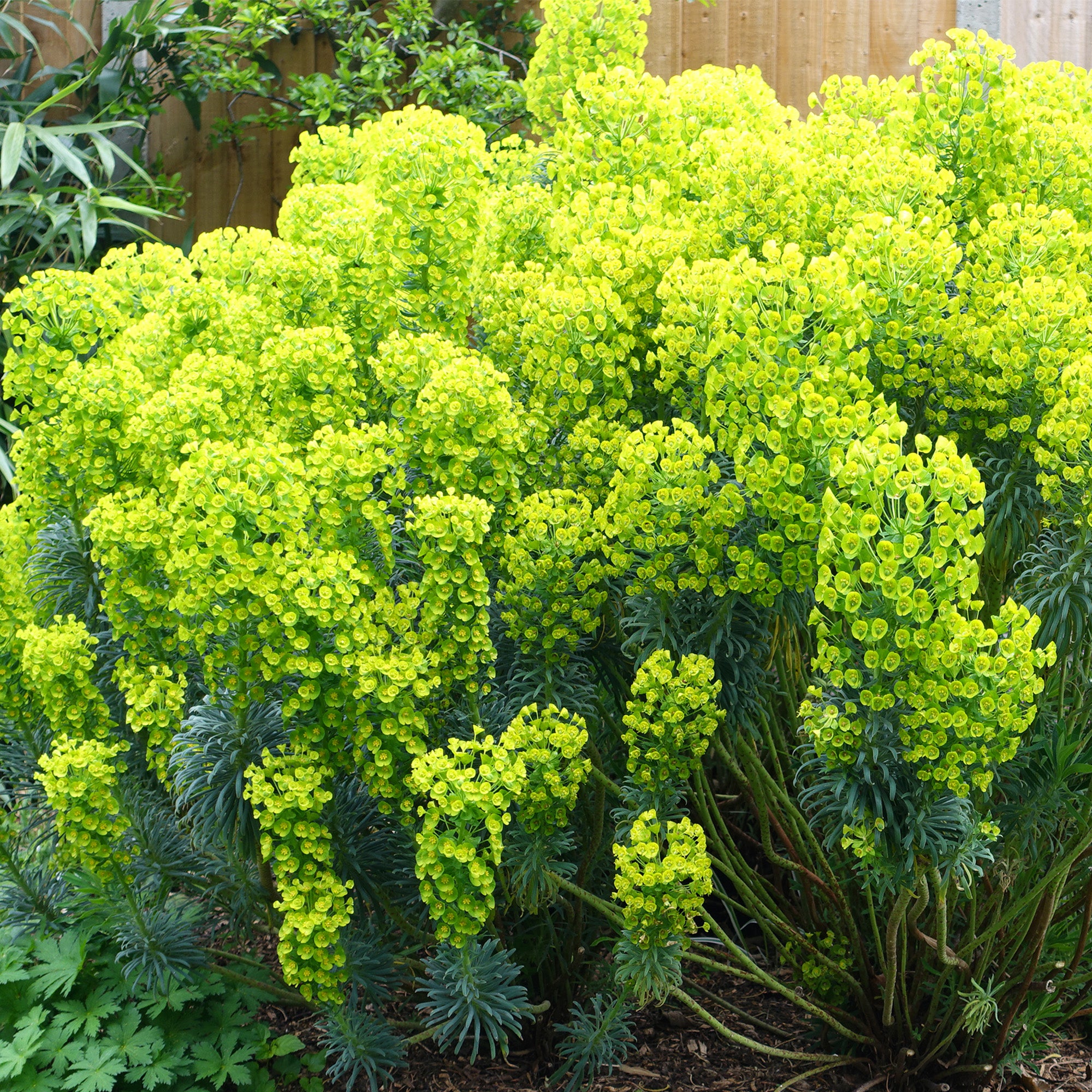 Euphorbia wulfenii, also known as Mediterranean Spurge, is a bold plant known for its dramatic clusters of yellow flowers that bloom in late winter, spring and into summer. Its blue-green foliage remains evergreen, adding year-round interest to gardens, whether you plant it in a pot, container, border or flower bed.