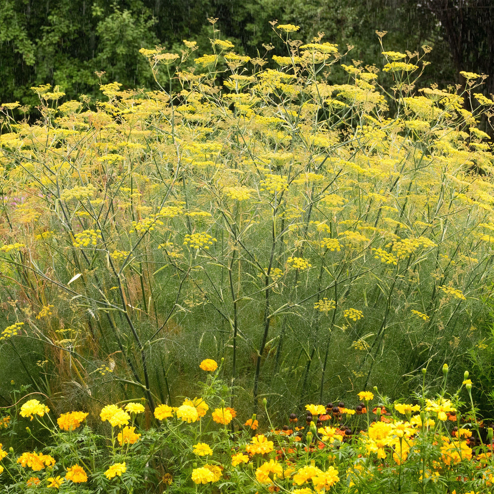 Fennel Bronze is a prolific self-seeder and will pop up all over your garden if left unchecked. To prevent this, deadhead the yellow flowers as soon as they fade—unless you want to harvest the fennel seeds for baking or leave them as a winter food source for birds.