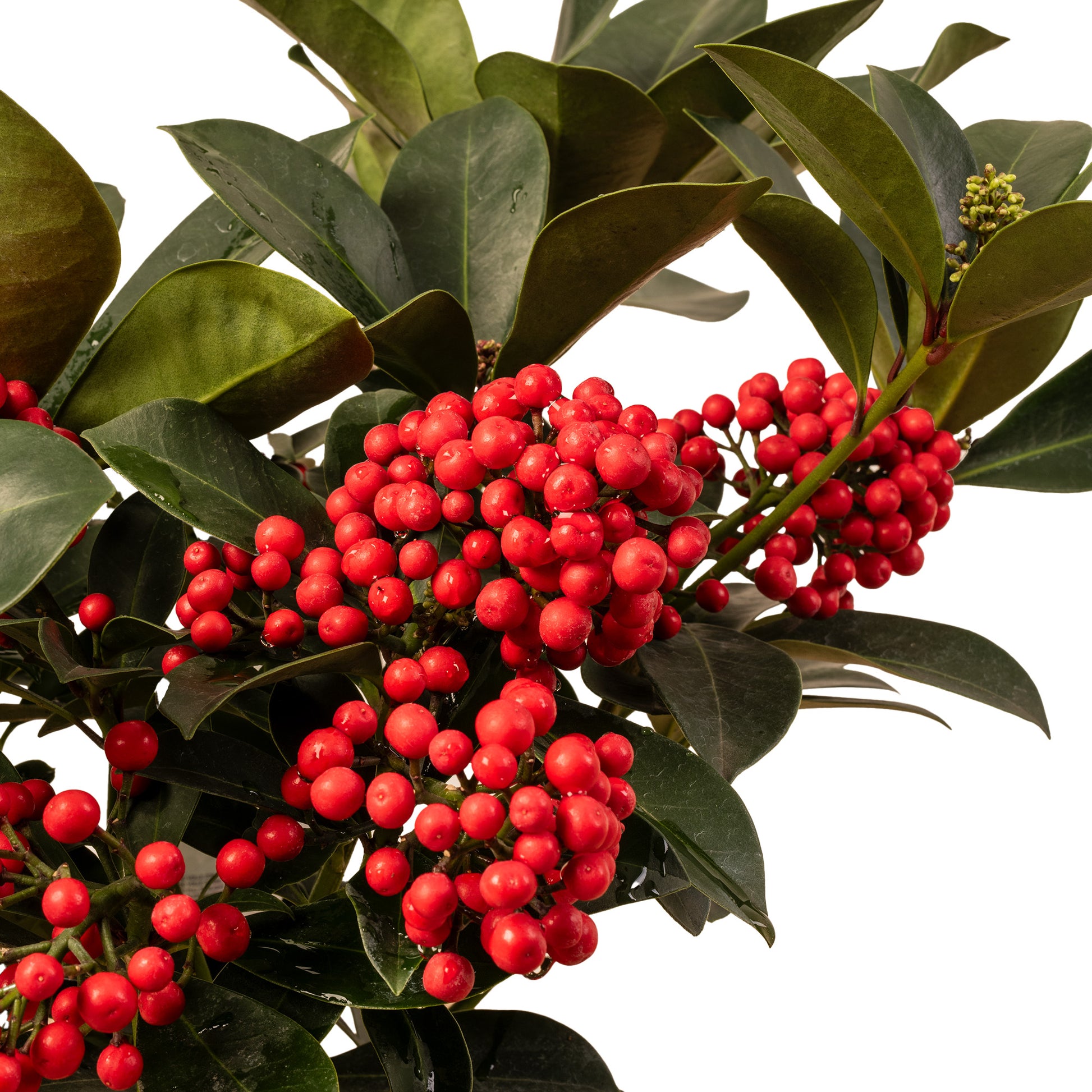 This Skimmia Redruth is a beautiful, bushy evergreen plant that brings together all the colours of Christmas. Glossy, green foliage and red berries are complemented by white, scented Spring flowering. The perfect Christmas gift, complete with rustic gift bag and stylish bow that flourishes all year long, Position the Skimmia in areas receiving partial shade, shielding it from the harshness of direct sunlight. A well-drained, consistently moist soil is key to its thriving, necessitating regular watering, especially during the drier phases of its inaugural growth year.