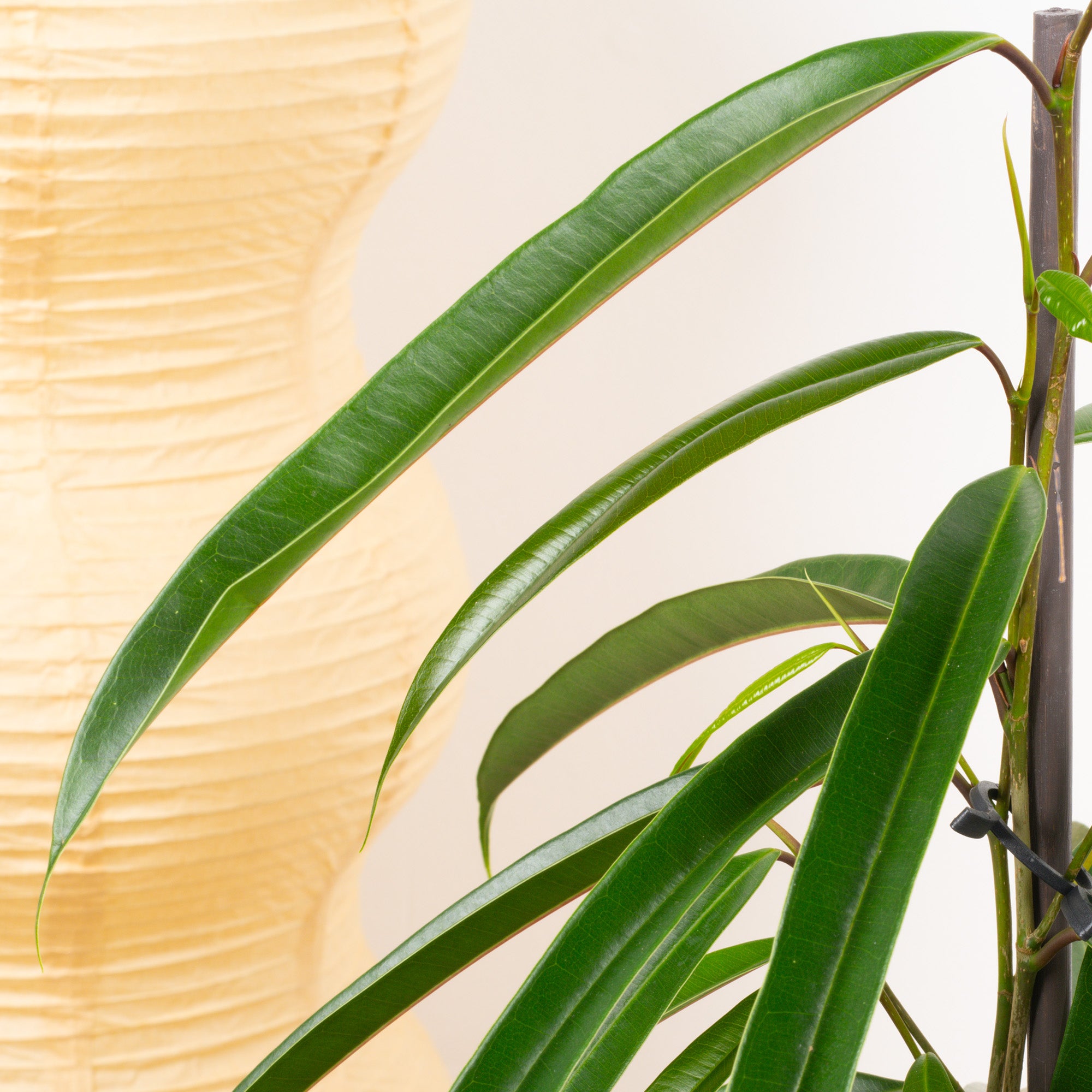 With proper care, including moderate watering and well-draining soil, this resilient plant remains vibrant year-round. It adapts well to slightly pot-bound conditions, requiring occasional pruning to maintain its shape. Whether placed as a statement piece in a living room or an accent in an office, the Ficus Alii brings both beauty and functionality to any space.