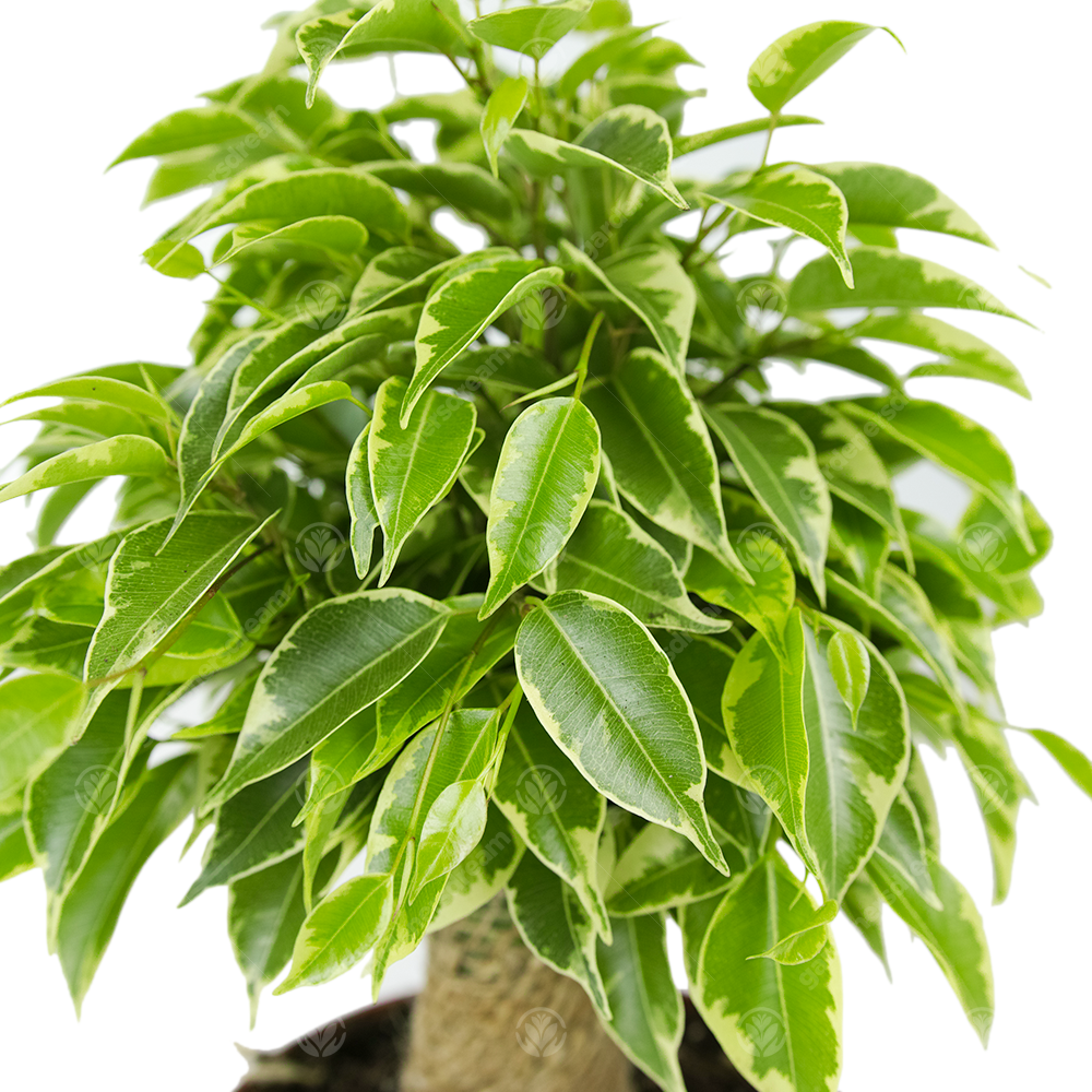 Ficus benjamina 'Kinky' is one of the most popular house plants available. Also known as 'weeping fig', this variegated leaved version is prized for its glossy foliage, which features light green leaves with a creamy-white edge, and as they grow they will droop and overhang, giving off an attractive bushy effect. This variety is very adaptable and requires very little maintenance, requiring a slight trim to keep it's shape and only requires watering once a week and/or when the soil is partially dry. It is best to leave this plant in partial sun, as direct sunlight can potentially harm the plant. An added feature of this ficus is how it is used to filter toxins, it can extract pollutants like ammonia and formaldehyde and purify the air around it.