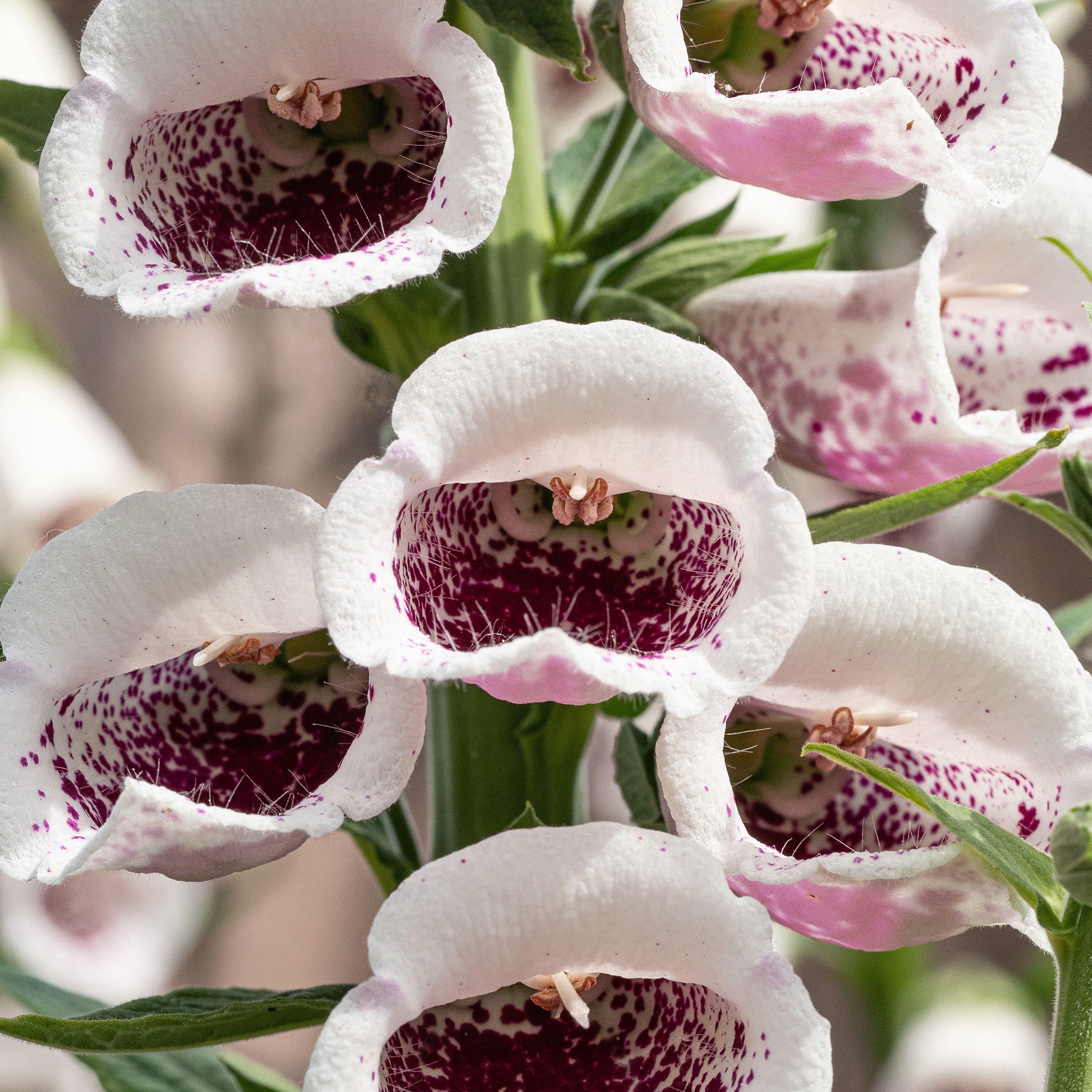 Foxglove ‘Pam’s Choice’ is a striking biennial variety that brings dramatic flair to borders and cottage gardens. Its tall spires are adorned with creamy white tubular blooms, each boldly marked with deep maroon throats, creating a stunning contrast that draws in bees and adds vertical interest to shaded areas. Reaching up to 1.6 metres in height, this variety is ideal for the back of borders or naturalistic planting schemes.