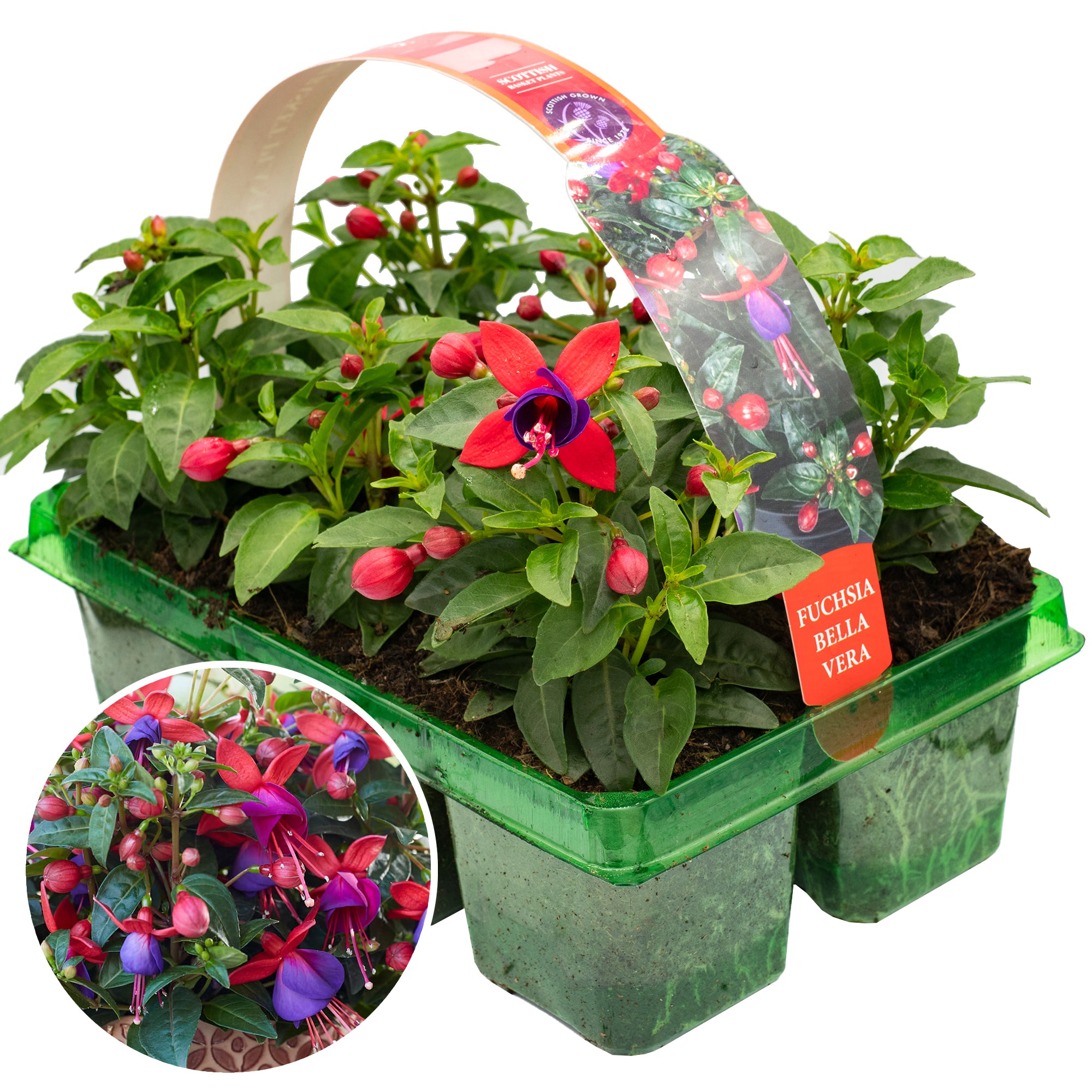 Fuchsia Bush Bella Vera is a compact deciduous plant with a neat upright habit, and will create an impressive basket display all season long. An abundance of single flowers appears in spring and lasts all the way through to late autumn, when the temperature drops and the first frosts appear. The bell-shaped flowers bloom upwards and outwards, creating an exciting burst of colour.