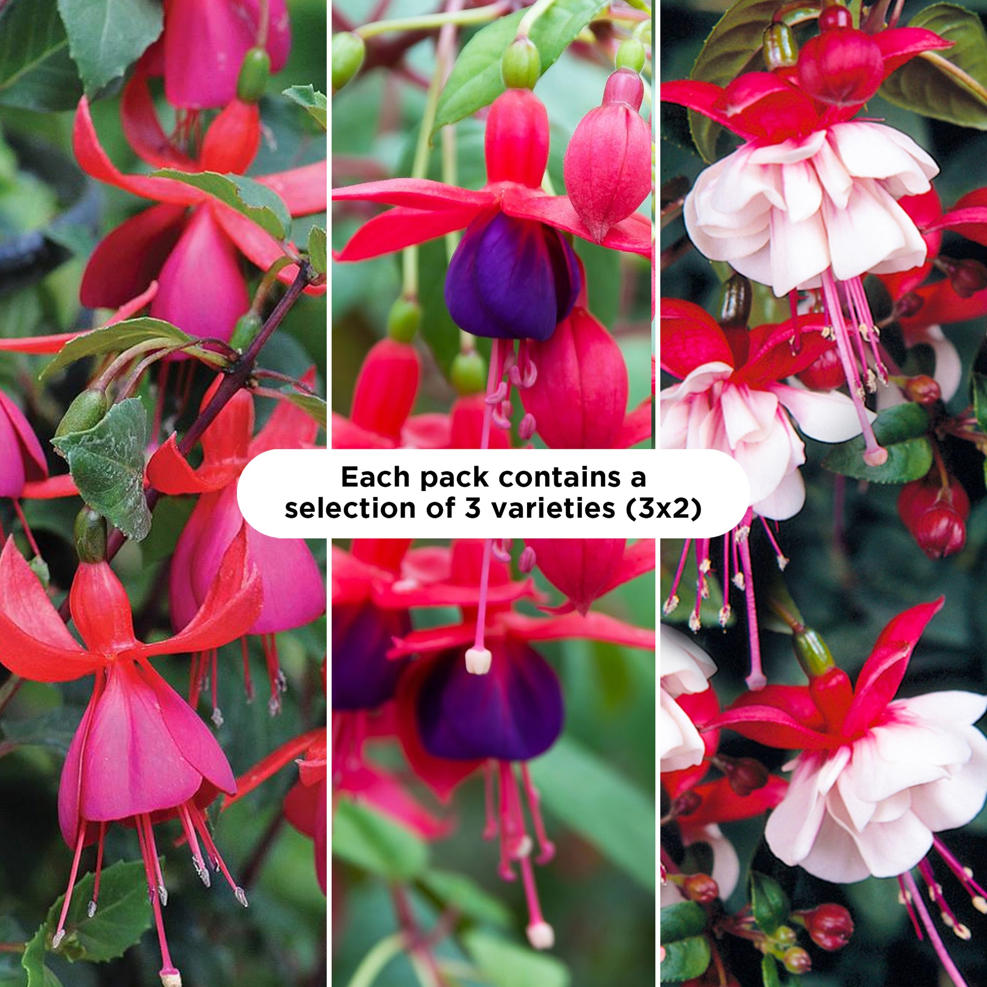 The Fuchsia Mixed Variety Basket Plants will offer a vibrant array of colour and gorgeous appearance to any garden. The plants are easy to care for throughout the year, flowering from late Spring until the end of Summer, only taking a few weeks to thrive and flourish once they're planted. Fuchsia Mix are supplied as a 6 pack, with 3 lots of 2 Fuchsia plant varieties each. They are great for the garden and can be utilised in many ways. Popular uses of these plants are as part of a hanging basket display, flower bed, border, pot or garden container. Regular watering should be carried out and a feed every 4-6 weeks is also required.