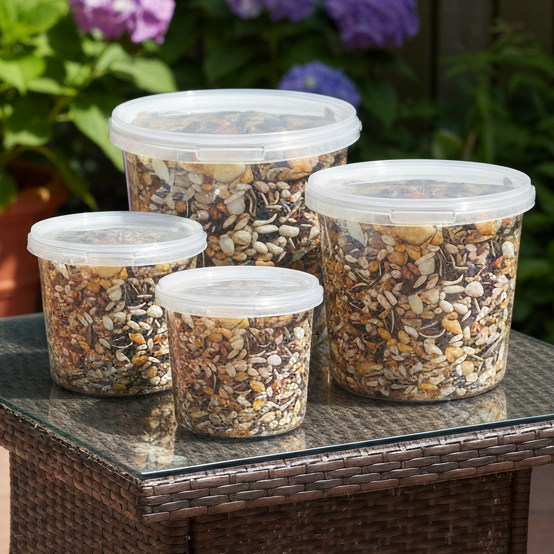 All sizes of feed will be supplied in a clear, reusable tub. Which can be stored away very easily.