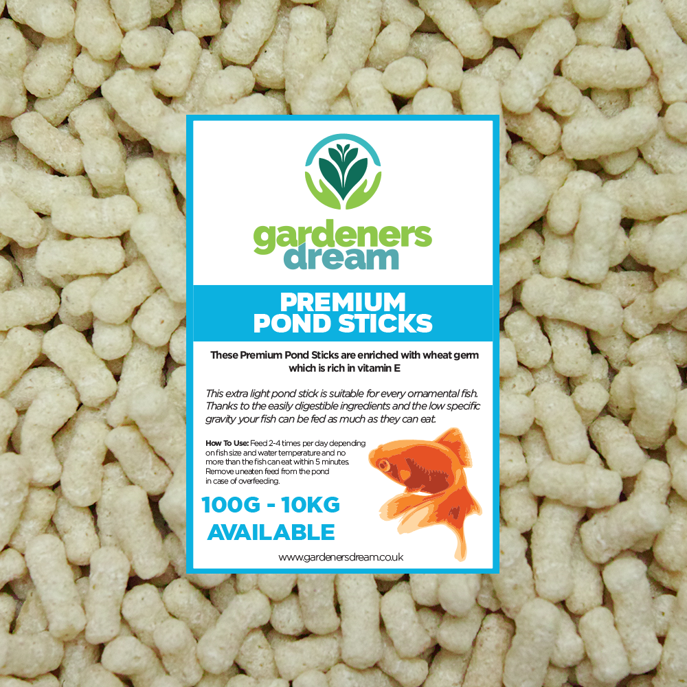 Gardeners Dream 4mm Premium Pond Sticks are a highly nutritious feeding solution for all cold water pond dwelling fish. These 4mm sticks are packed with vitamins and nutrients such as wheatgerm, as well as vitamins C & E to promote good health and a strong immune system to fight disease. This balanced feed can be used 2-4 times per day, depending on the size of the fish and the temperature of the water, so please gauge the amount of neccesary food accordingly. This feed is comprised of all natural and responsibly sourced ingredients, they are easy to digest, produce far less waste and keep the water in your pond or tank clearer for longer.