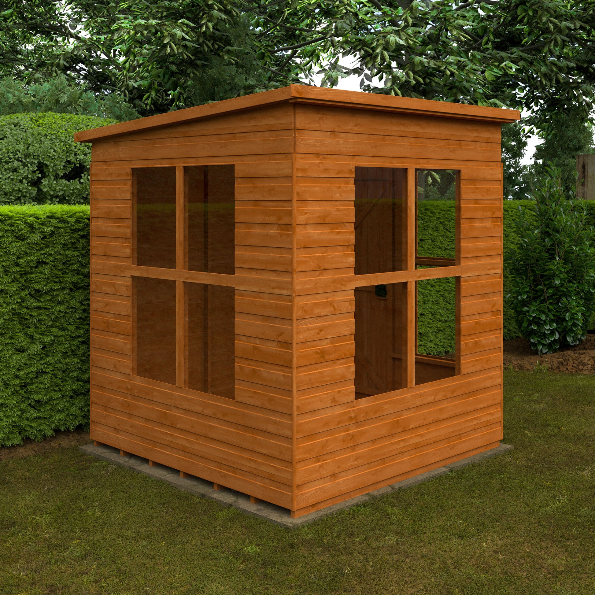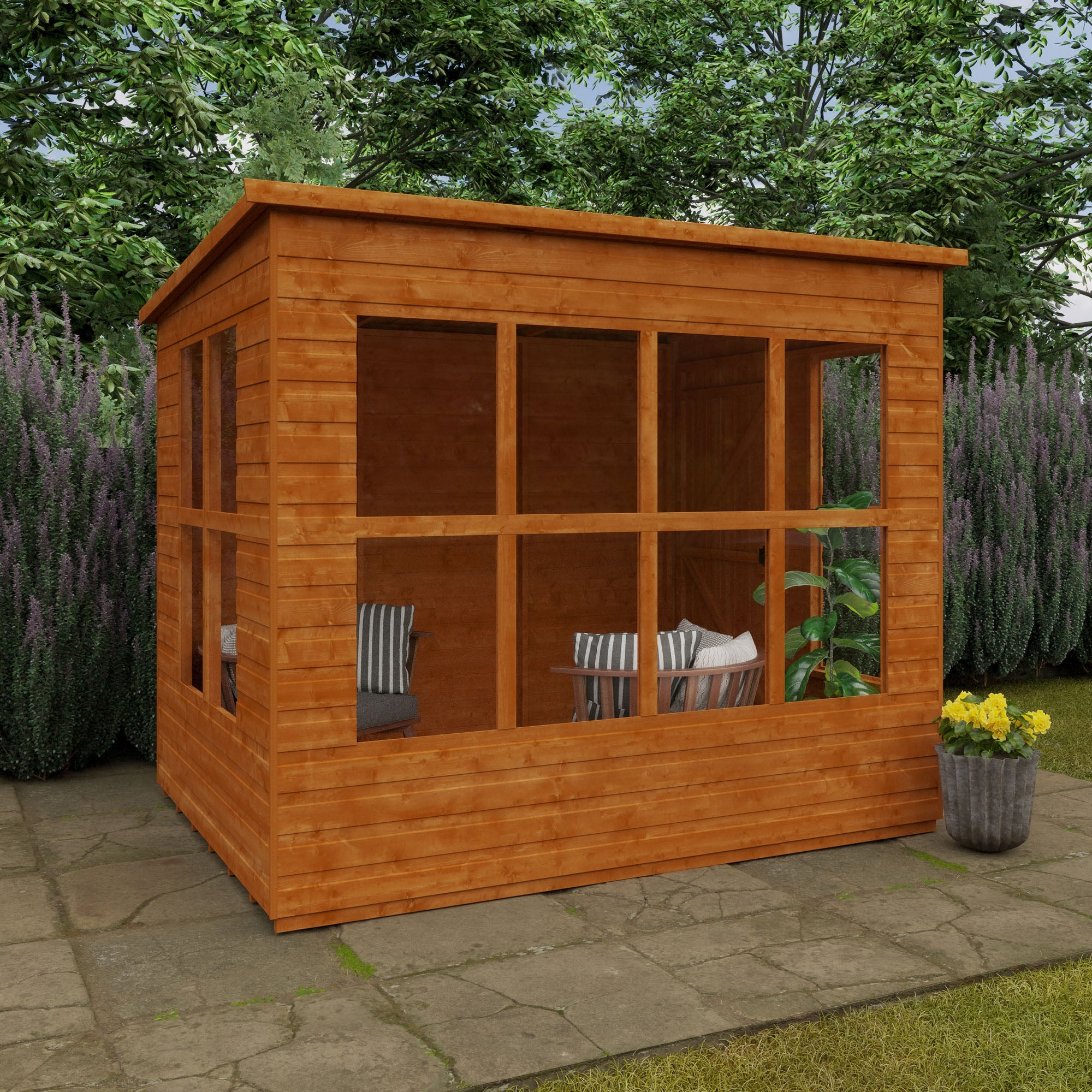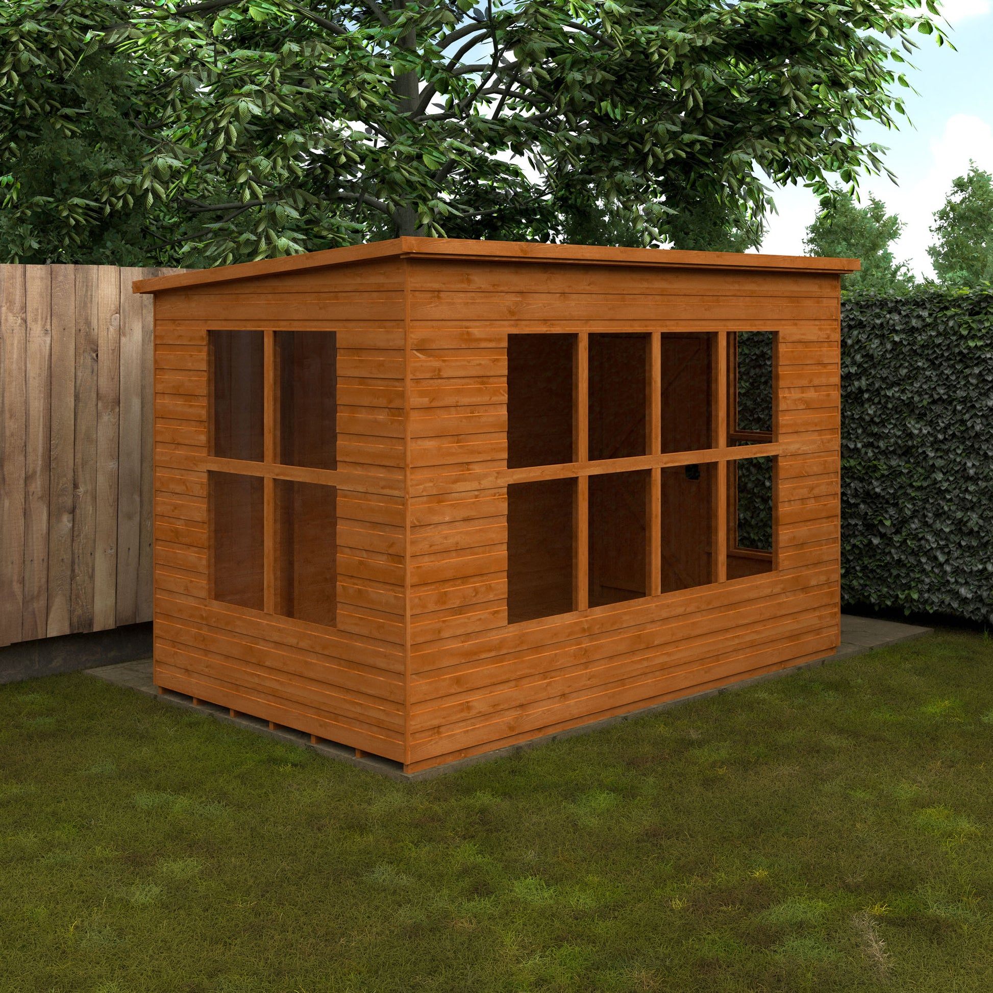 The shed includes a single fully boarded T&G door, measuring 785mm x 1692mm, providing secure and convenient access. All windows are fixed, each 457mm x 610mm in size, and made with 3mm thick glass, allowing ample natural light while ensuring strength. The roof and floor are crafted from 12mm Tongue & Groove Board, contributing to the shed's sturdy build. The roof is protected with grey mineral felt, and the shed is treated with a burnt orange water-based solution for added longevity. A lock and key system ensures security, and the shed is made from selected European softwoods, highlighting a commitment to quality and environmental responsibility.