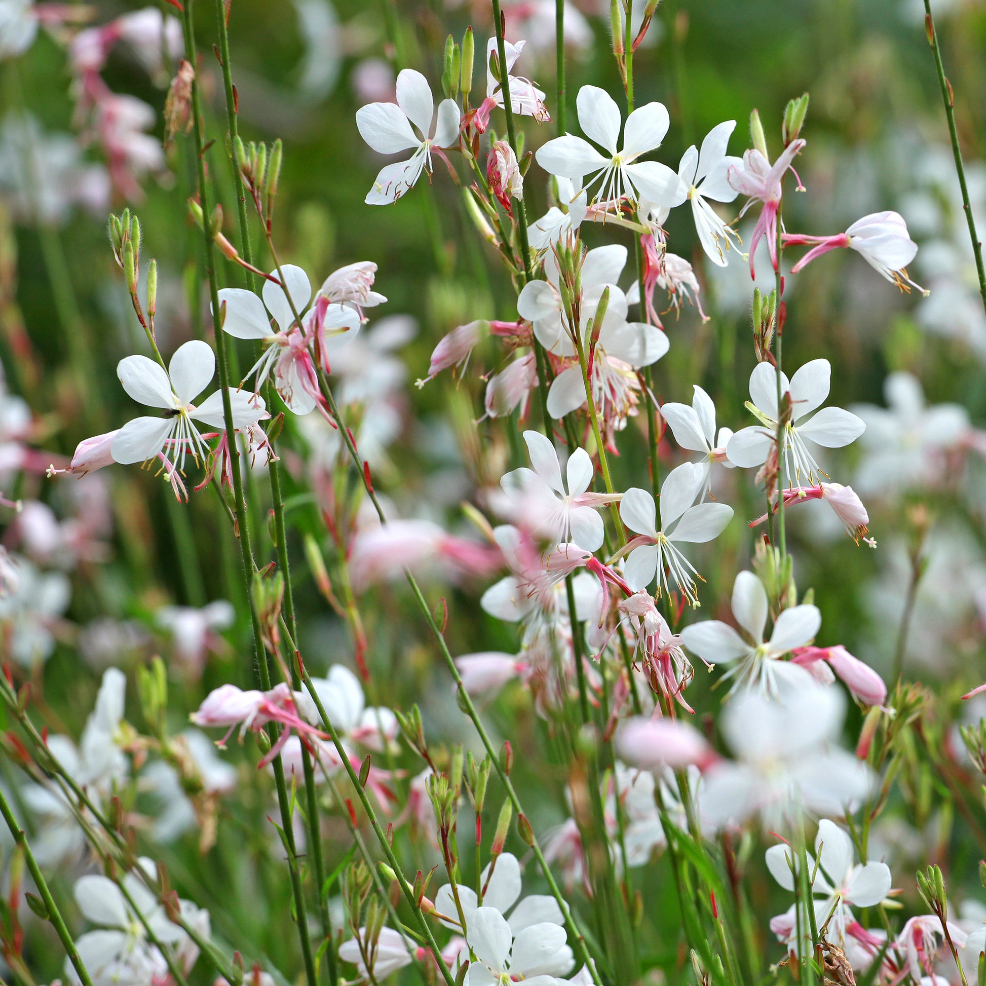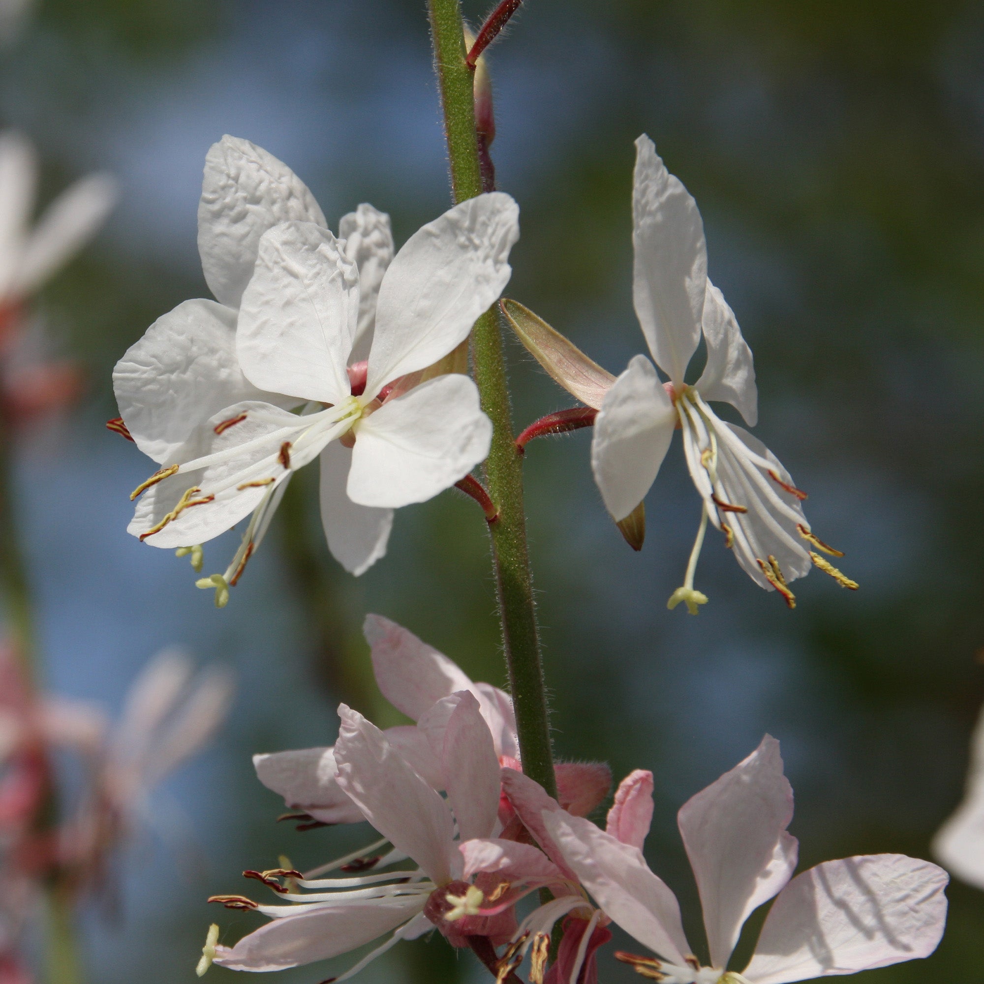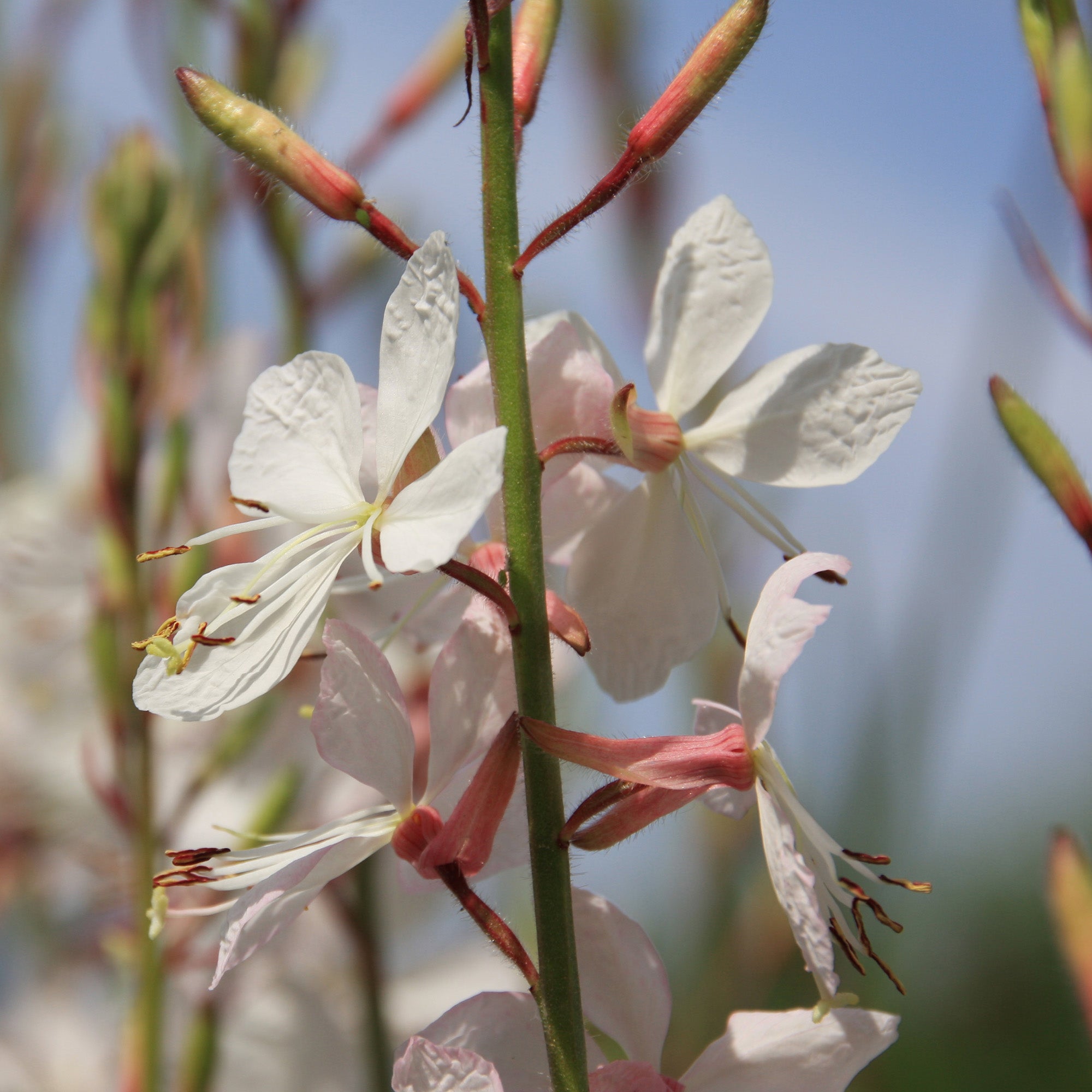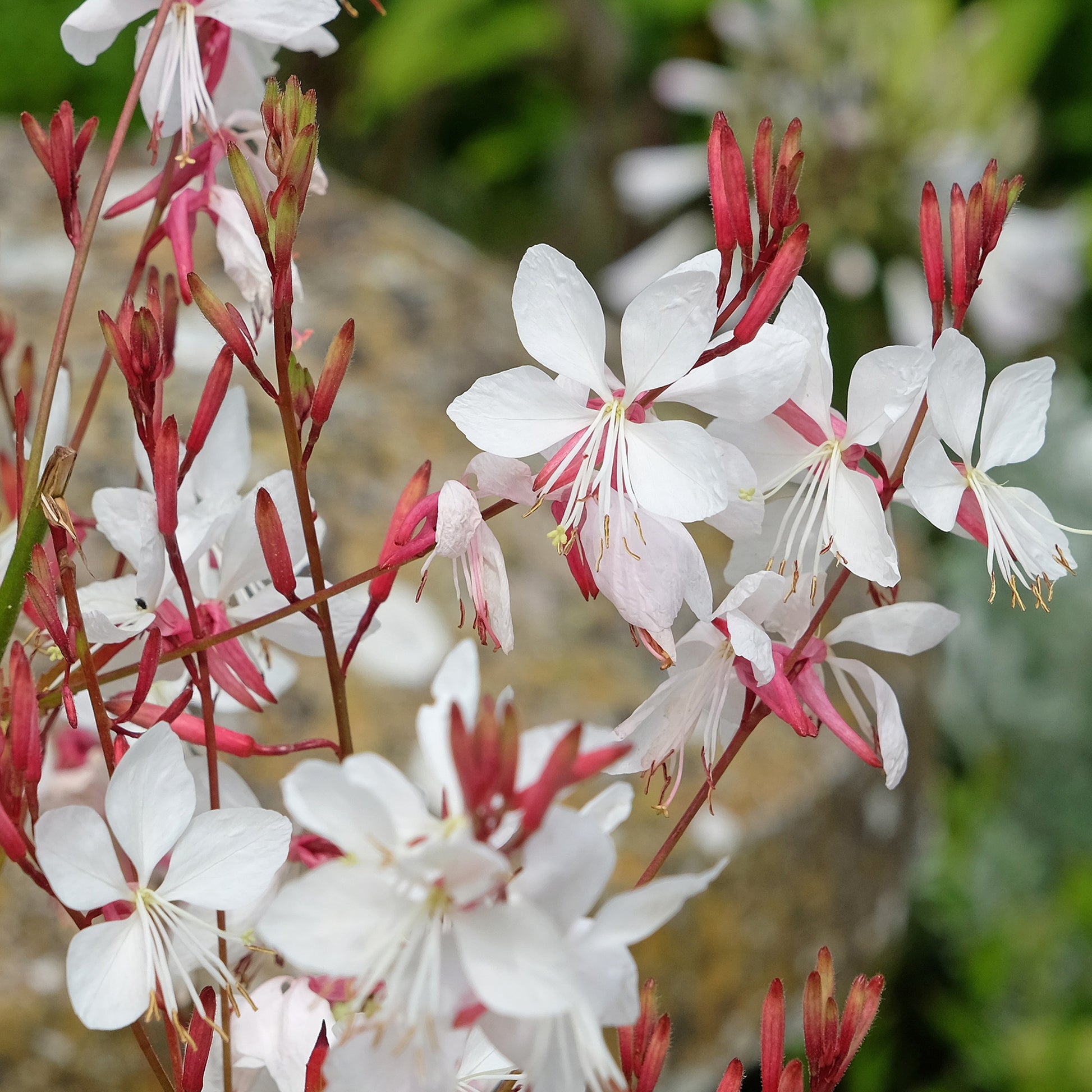 A delicate looking but hardy perennial with graceful, airy stems which flow and shift with the breeze, carrying beautifully bright Summer blooms. The Gaura or now known Oenothera 'Whirling Butterflies' is a compact variety with upright, thin stems which carry small pink buds in late Spring and early Summer. These bloom to elegant, star-shaped white flowers with long, arching anthers and a long flowering period lasting right through to the Autumn, where the light green foliage takes on soft hues of orange and red.