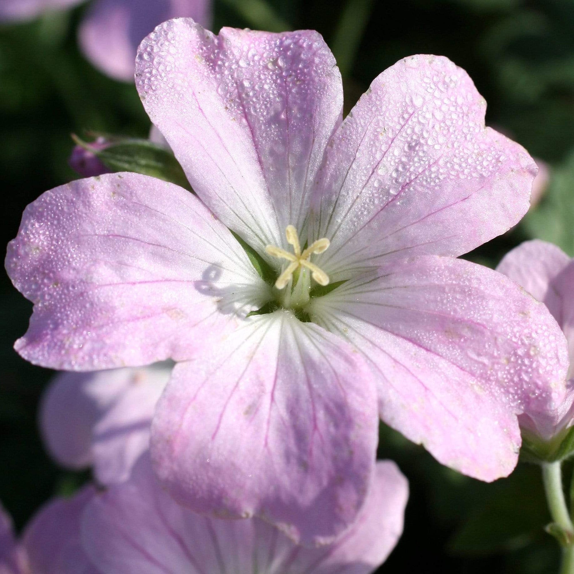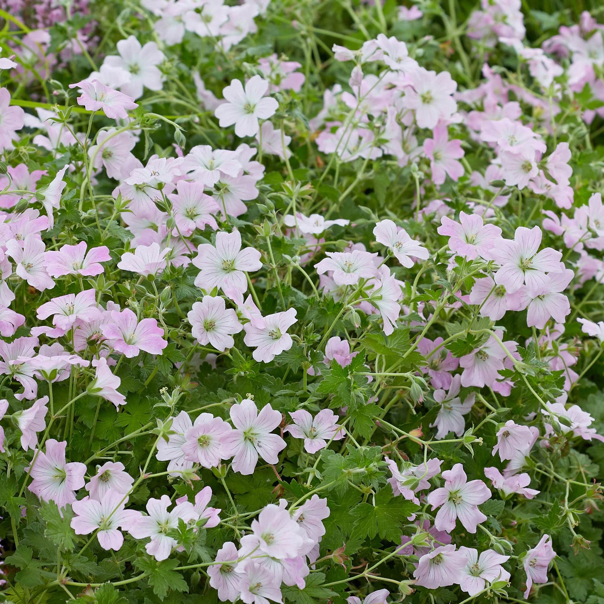 The ‘Dreamland’ Geranium variety offers white cup-shaped flowers, uniquely veined with dark streaks that concentrate at the middle, from spring into autumn. The plant’s deciduous lush green foliage creates the perfect backdrop for its delicate pale flowers.