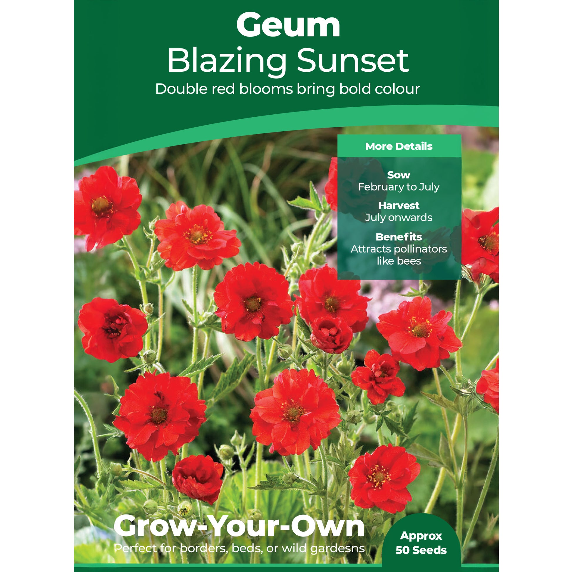 Geum Flora plena Blazing Sunset is an eye-catching herbaceous perennial ideal for adding dramatic colour to beds and borders. Also known as Avens, these scarlet-red flowers bloom from the first year when sown early enough. They burst into life from July to September and are a magnet for pollinators, making them a striking addition to a bee and butterfly garden.