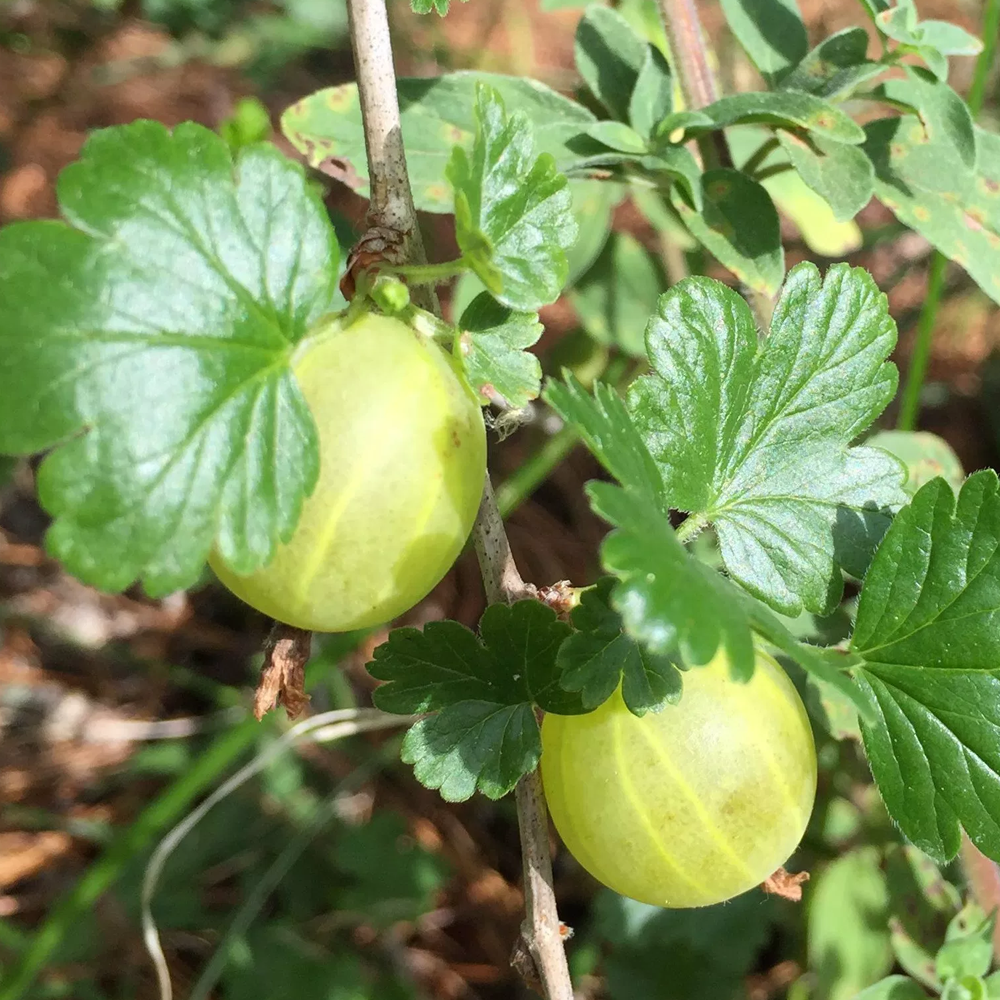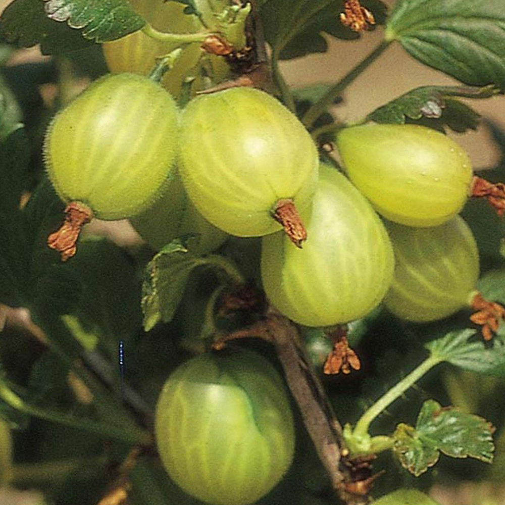 Plant gooseberries in well-drained, fertile soil with full sun or partial shade. Space plants about 120-150cm apart. Dig a hole slightly larger than the root ball, place the plant, and cover with soil. Water thoroughly to settle the roots.