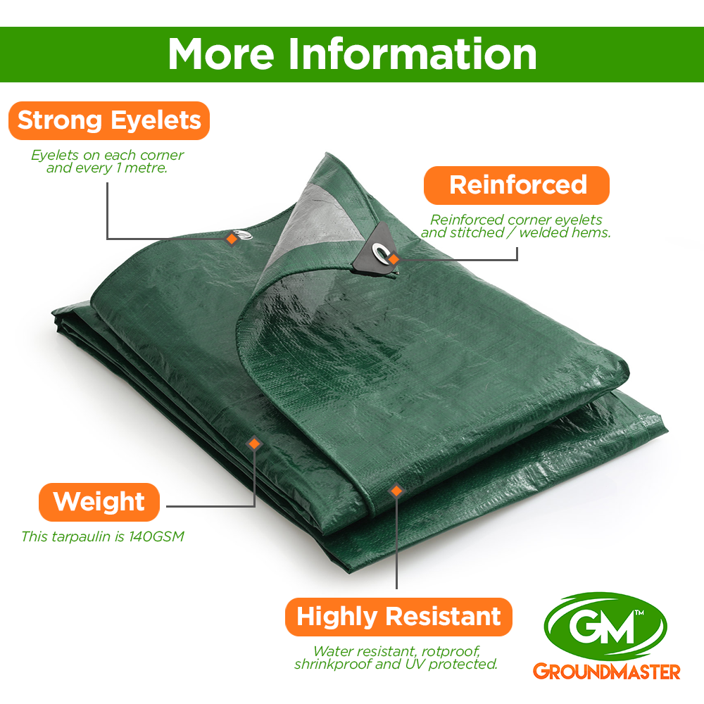GroundMaster mid-grade Green/Silver Tarpaulins are an ideal multipurpose cost-effective temporary covering solution. At 140gsm they are strong but lightweight, with a toughspec 10 x 12 weavecount that renders them flexible even in very low temperatures. Extremely versatile, they can be used as camping groundsheets as well as protective covers for cars, bikes, boats, log stores, building sites and much more. Fully fabricated with strong metal eyelets every metre with reinforced hems, these poly tarps can be fixed securely with rope and bungee cords. Our mid-grade tarpaulins are also waterproof, shrinkproof, rot proof & UV protected, making them perfect for any outdoor conditions as well as highly reusable.