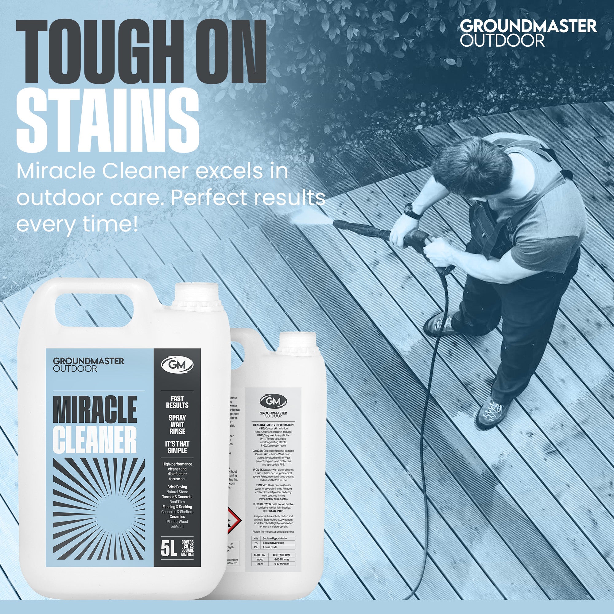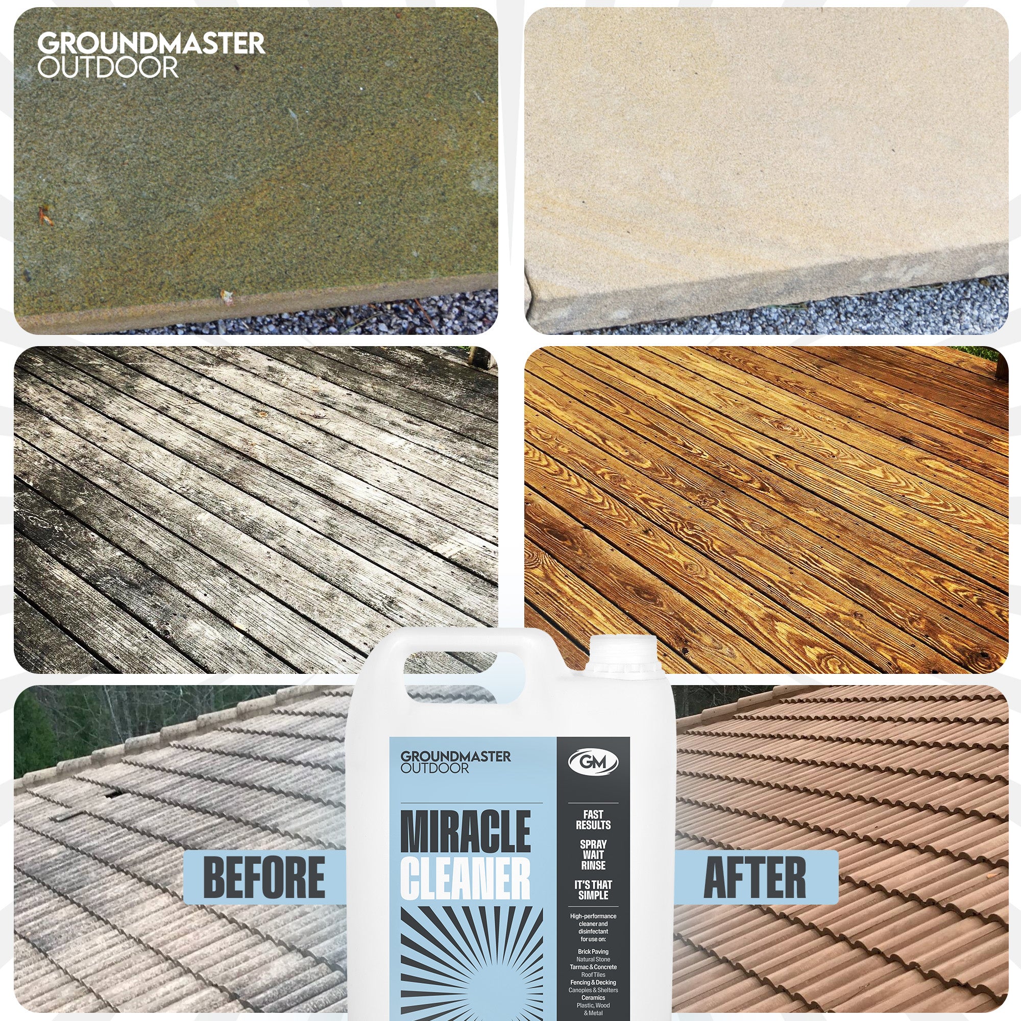 Enhance the cleanliness of your outdoor areas with GroundMaster Miracle Cleaner, the ultimate solution to perform as a green mould and algae remover, as well as eliminating stains and grime with minimal effort. Say goodbye to the inconvenience of traditional pressure washing methods due to this moss killer for paths and drives. Miracle Cleaner promises a secure, non-slip environment, providing peace of mind for users. This versatile product is a great patio cleaner, but also works very well on brick paving, stone, wood, tarmac, concrete and more, producing fast results every time.