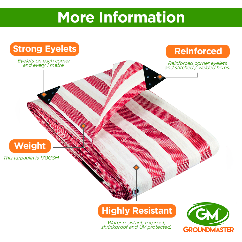 GroundMaster mid-grade Red/White Striped Tarpaulins are an ideal heavy duty covering solution, at 170gsm they are perfect for jobs that require a bit of a more rugged tarpaulin. Woven with a tough-spec 12 x 12 mesh, these heavy duty tarps are extremely tough and long lasting. This versatile cover has a wide range of popular uses; while commonly used as a market stall cover, these tarps are equally effective as a camping groundsheet, kennel/hutch cover or building tarp. Fixed eyelets every metre allows you to easily secure these covers using bungee cords and ropes, or with pins if being secured to the ground. These tarps are also waterproof, shrinkproof, rotproof & UV protected, meaning they are perfect in any outdoor conditions and can be used again and again.