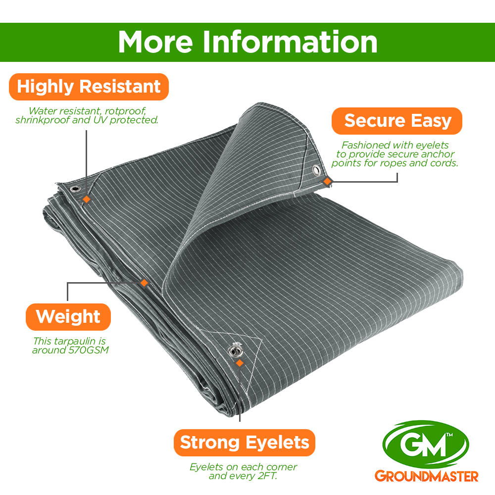 GroundMaster 17oz Rip-Stop Canvas Tarpaulins are some of the toughest multipurpose covers available. At 17oz (around 570gsm) these tarps are considered super heavy duty, they have increased resistance to tearing and abrasion, and offer a great deal of protection. These tarps are commonly used in the agricultural and construction industries, protecting machinery, securing truck loads and transporting materials. Due to their robust and breathable nature they have a wide range of additional uses; such as a building tarp, kennel/hutch cover, or as part of a shelter. Fixed eyelets every 2ft allows you to easily secure these covers using bungee cords, ropes and pins. These rotproof canvas tarps are chemically-treated making them a bit more lightweight that their wax-treated counterparts, this treatment also gives the tarp water resistant properties.