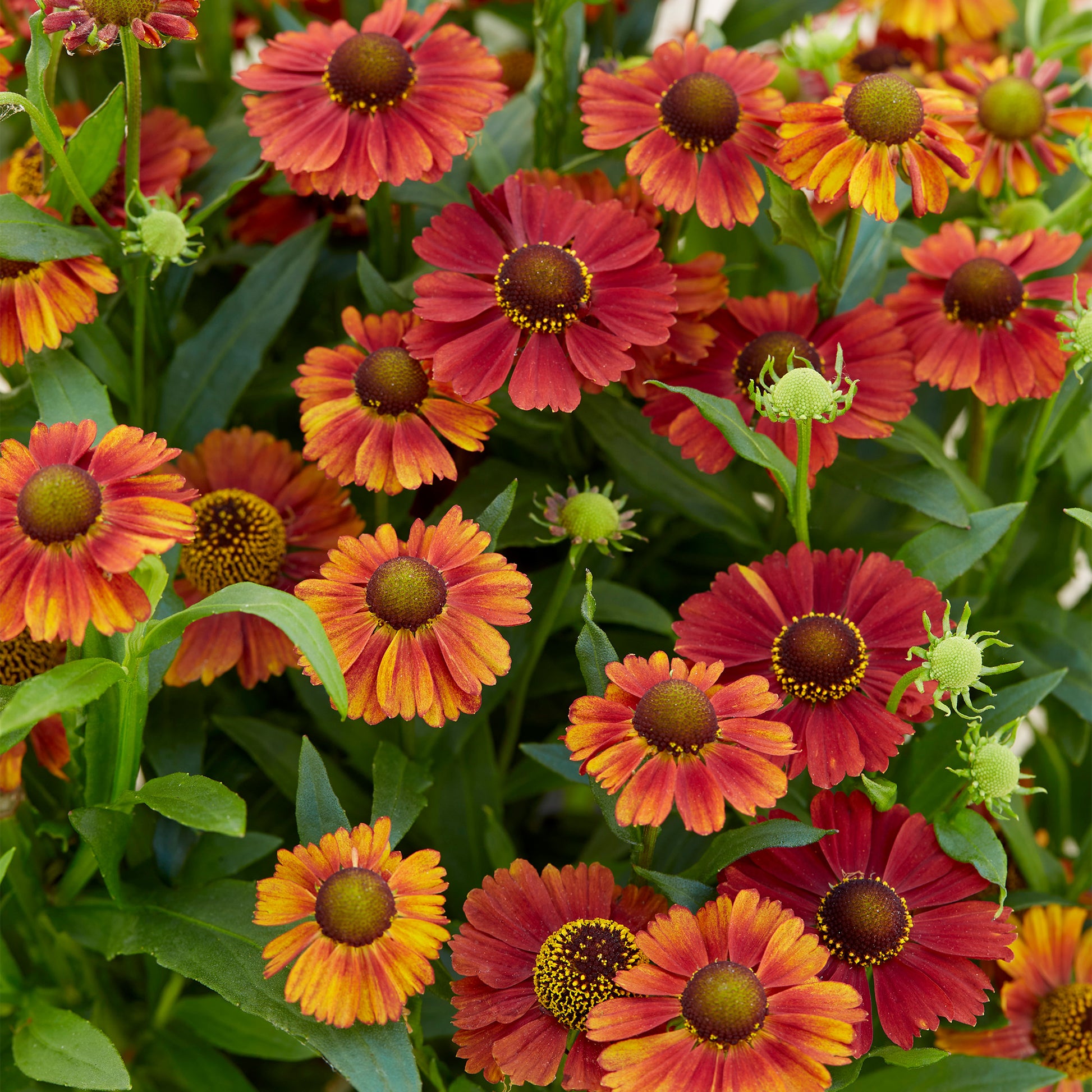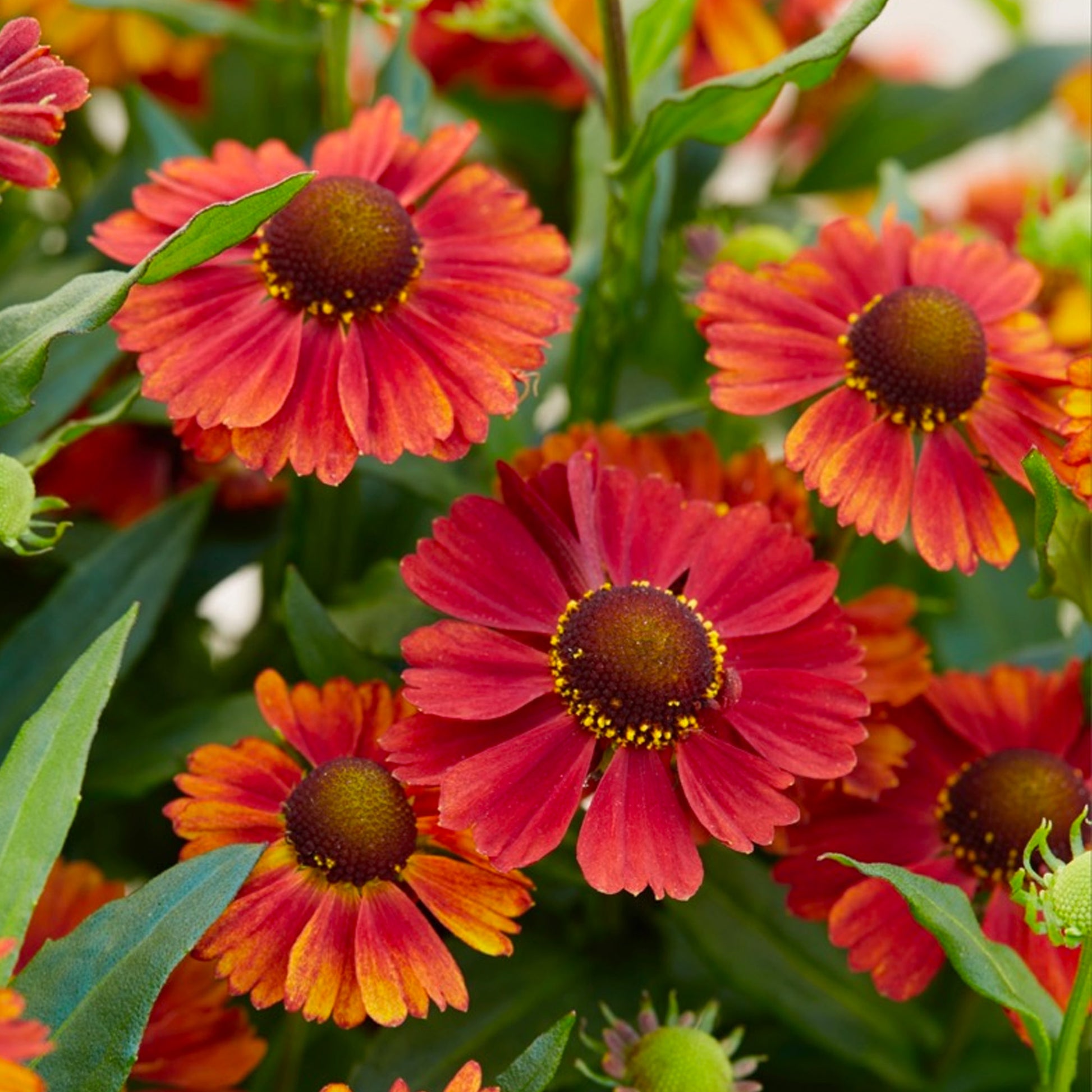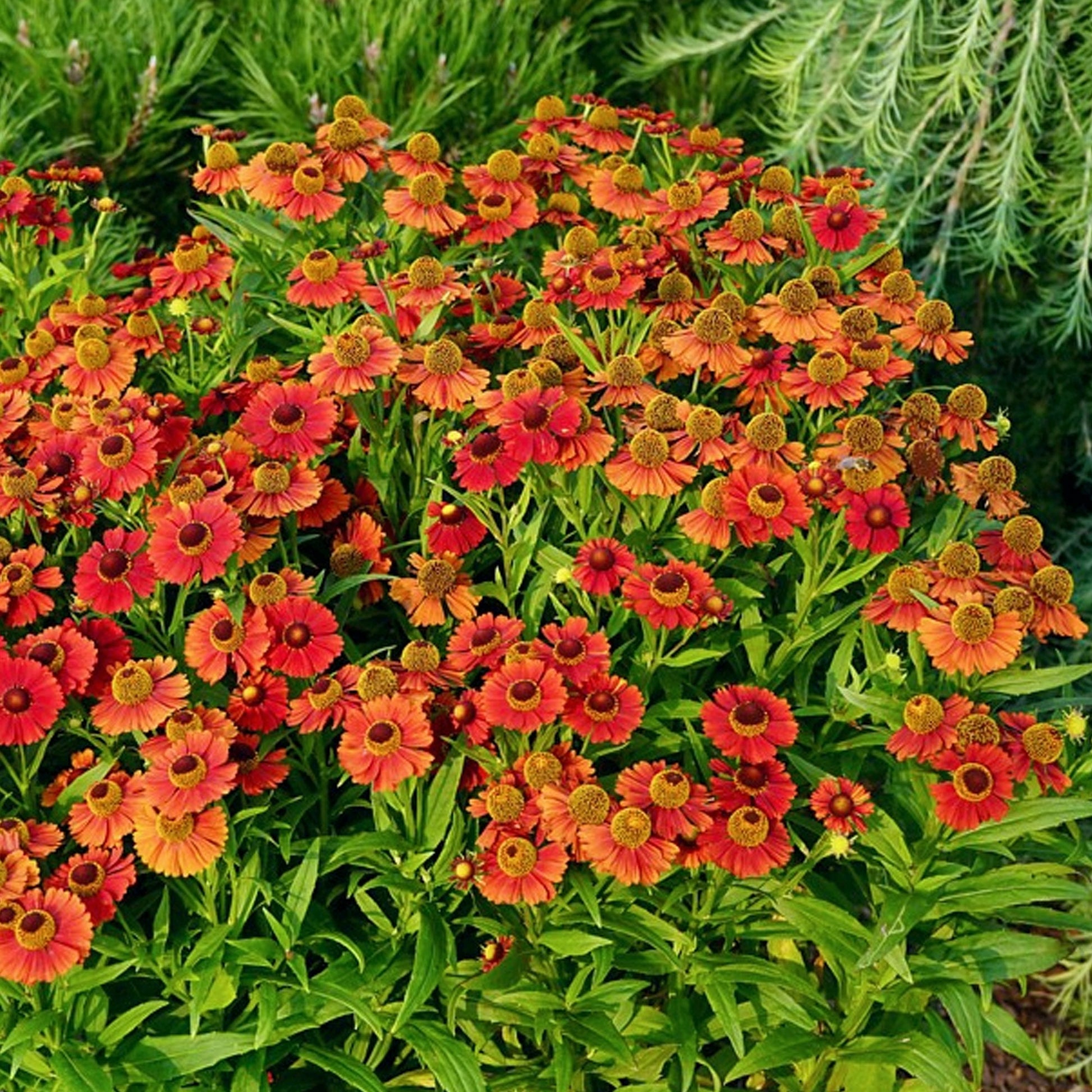 Helenium 'Strawberry Sundae', also known as Helen's Flower or Sneezeweed, is a sun loving perennial with classically beautiful orange and red tinted flowers with a pollen-rich brown middle that will attract bees and butterflies. The strong upright stems are rife with oblong, scarcely toothed green leaves.