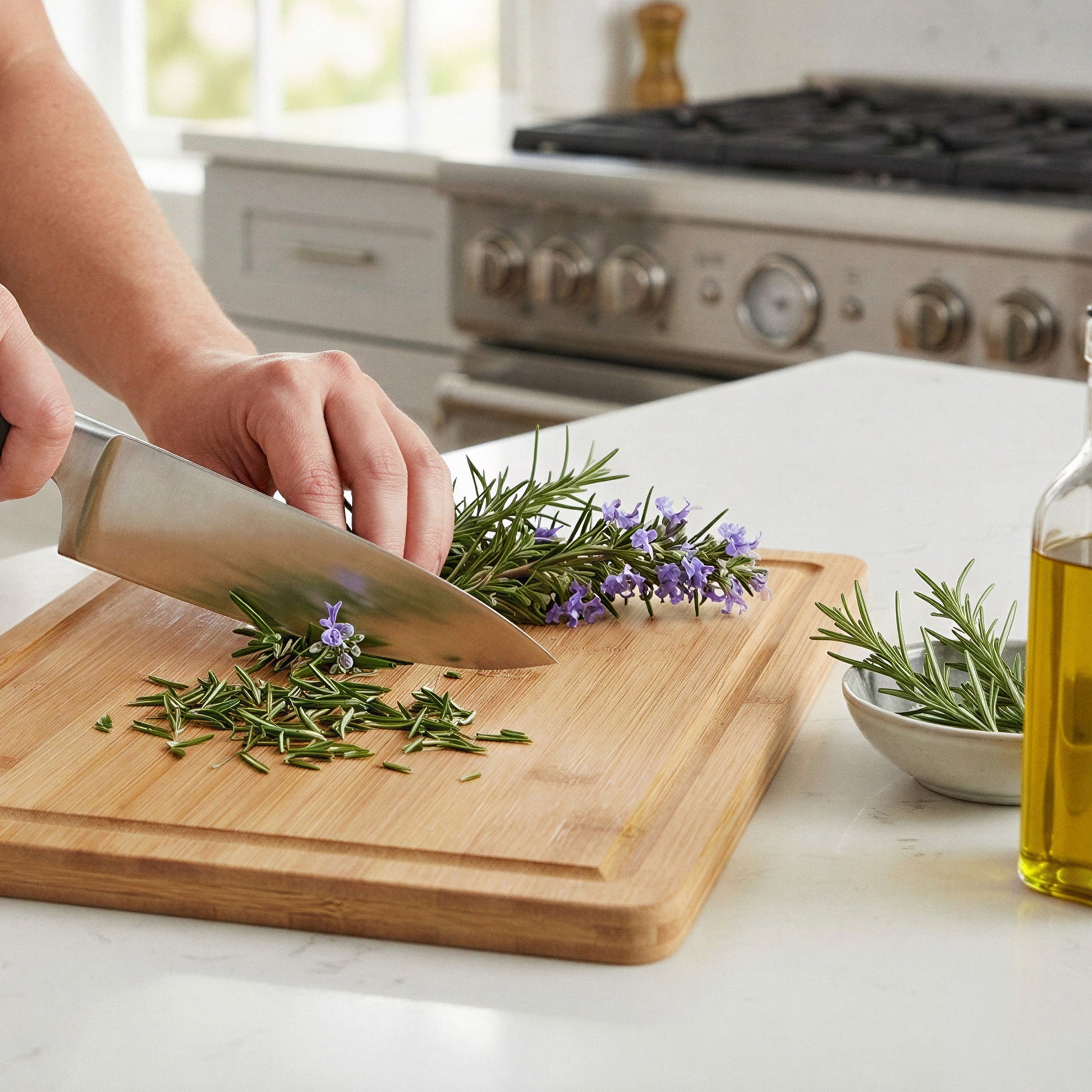Rosemary 'Severn Sea' is a popular perennial herb, famously prized for its graceful, arching branches and prolific clear blue flowers. The primary part used for its culinary value is its aromatic, needle-like leaves, which provide a classic, robust, and piney rosemary flavour essential for seasoning roasted foods, breads, and oils. However, its edibility doesn't stop there; the attractive, clear blue flowers are also edible and make a beautiful, fragrant garnish for salads and drinks.