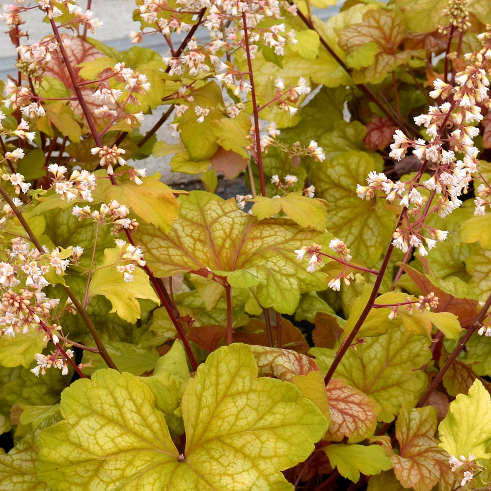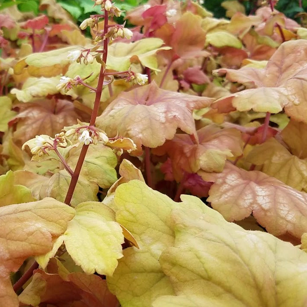 Heuchera ‘Champagne’, also known as Coral Bells or Alum Root, is a vibrant addition to any garden display with bright, mounding foliage that changes from an amber to golden yellow as the seasons progress. Dark red stems reach high above the low foliage to carry loose panicles of light peach flowers from late Spring and well into the Summer months. Heuchera is a great choice for a variety of garden displays, working well as ground cover for flower beds, borders, rockeries and surrounding the base of trees. It can also be used as a tidy pot or container shrub.