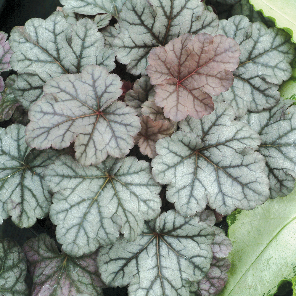 Heuchera are very versatile evergreen perennials with exquisite plant colours, unseen in usual gardens. They present a wide range of exceptional foliage colours and bright flowers, both at the same time. Cinnabar Silver is a new hardy variety that is tough and can withstand extreme weather conditions. It grows short in height but with large mounds of stunning metallic silver leaves.