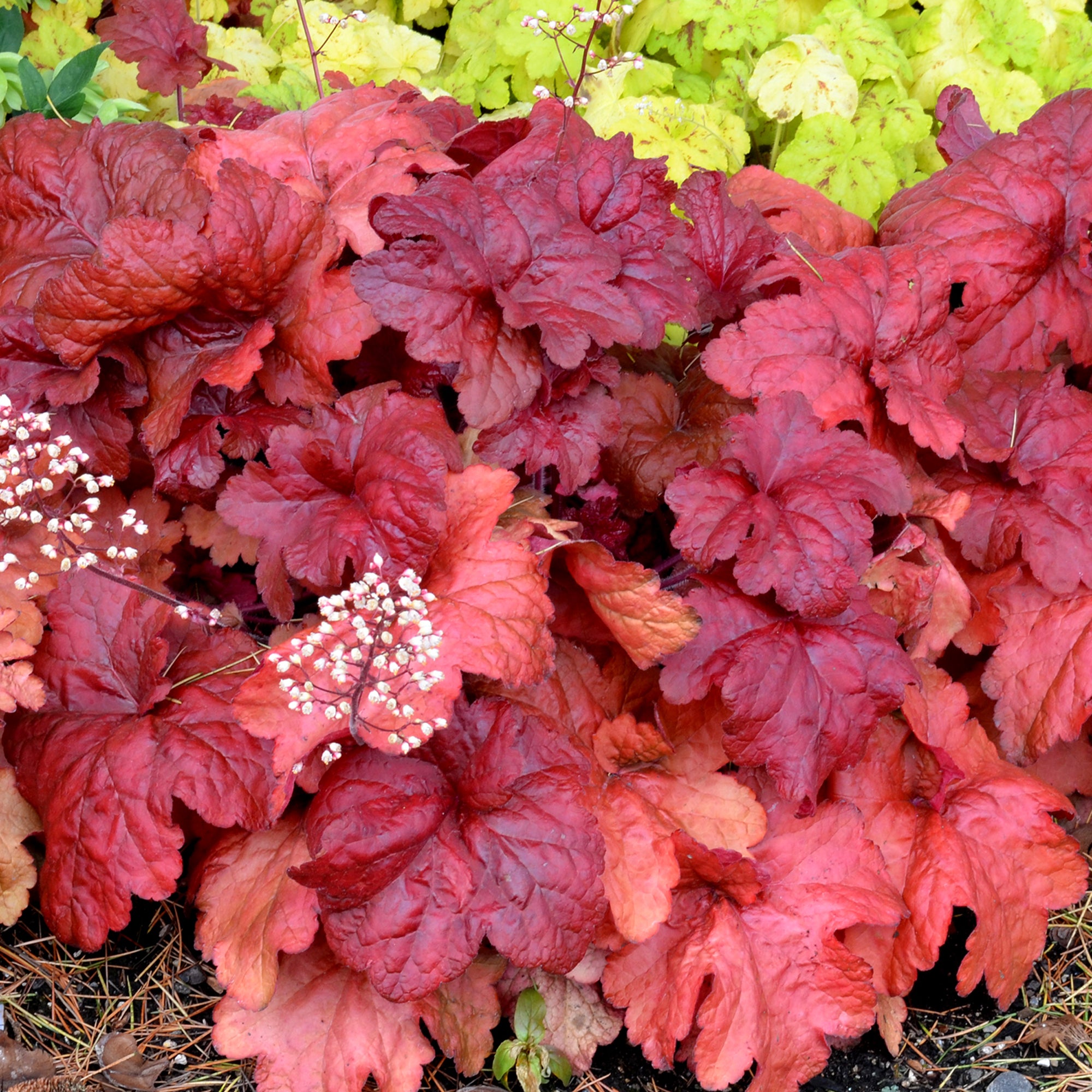 A compact, clump-forming herbaceous perennial shrub and highly popular woodland native. Heuchera 'Fire Alarm', sometimes known as Alum Root or Coral Bells are vibrant and colourful shrubs carrying large, fiery-red foliage, darkening in colour slightly as they mature. Tall, slender stems carry panicles of tiny bell-shaped white flowers tinged with a hint of pink which appear above the foliage from early to mid-Summer.