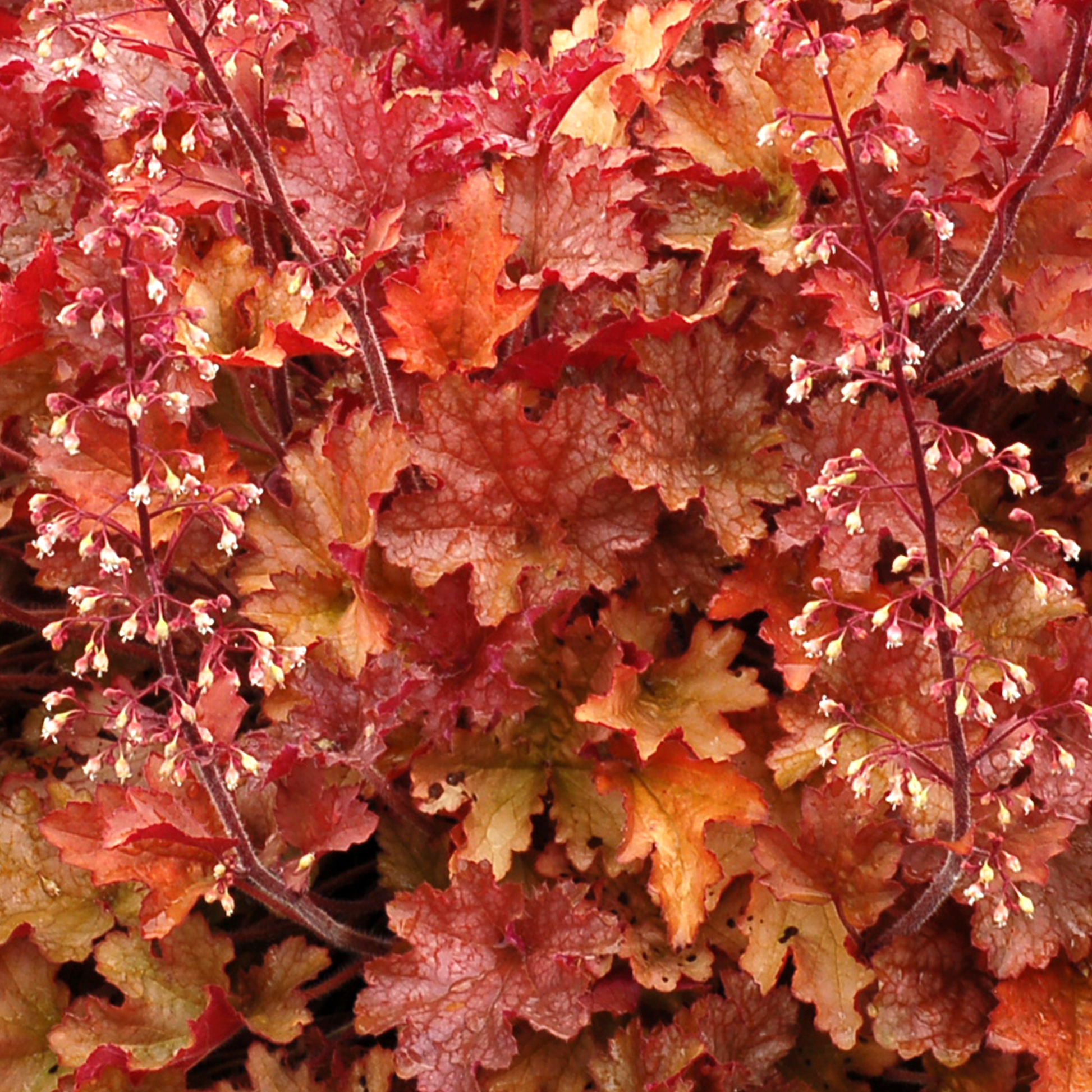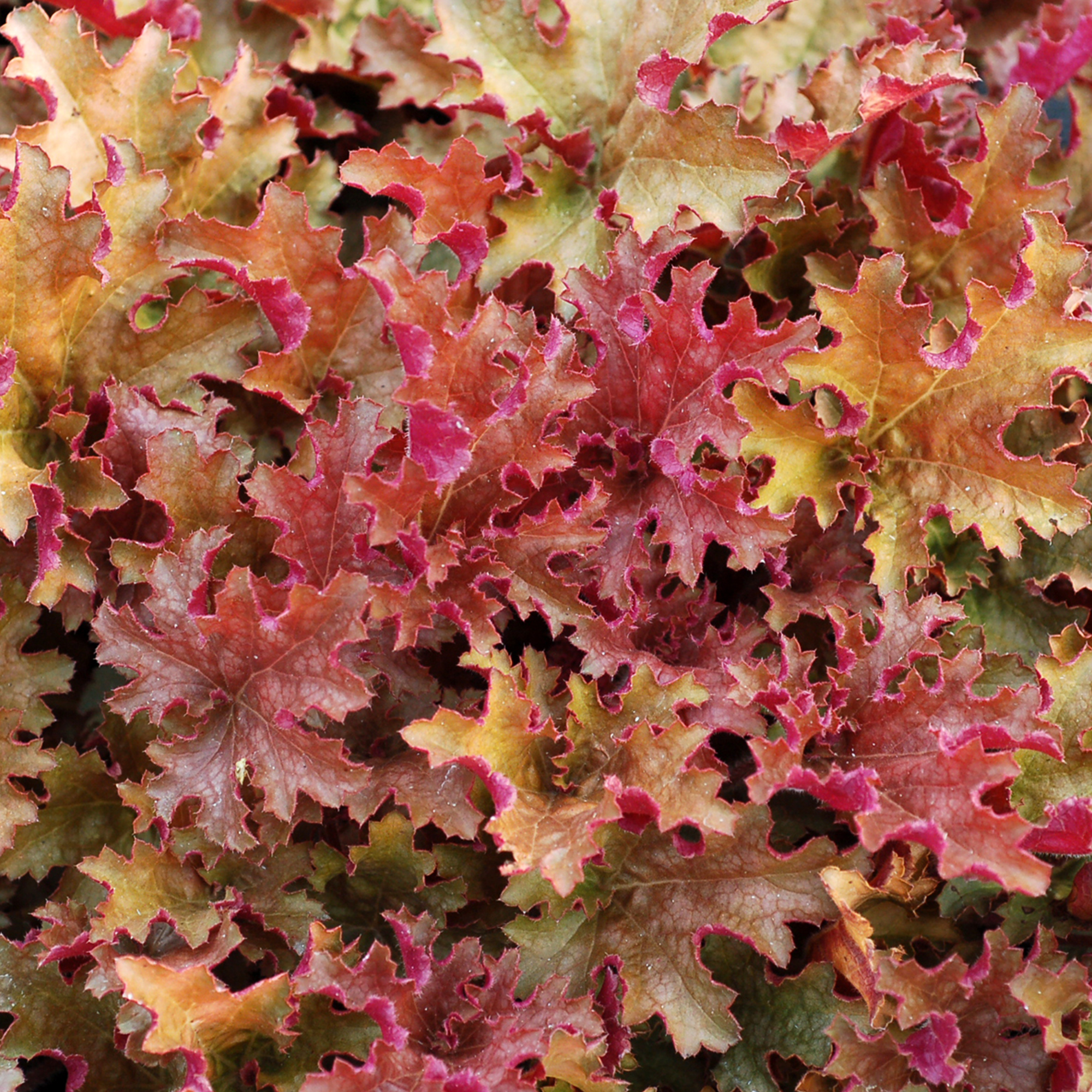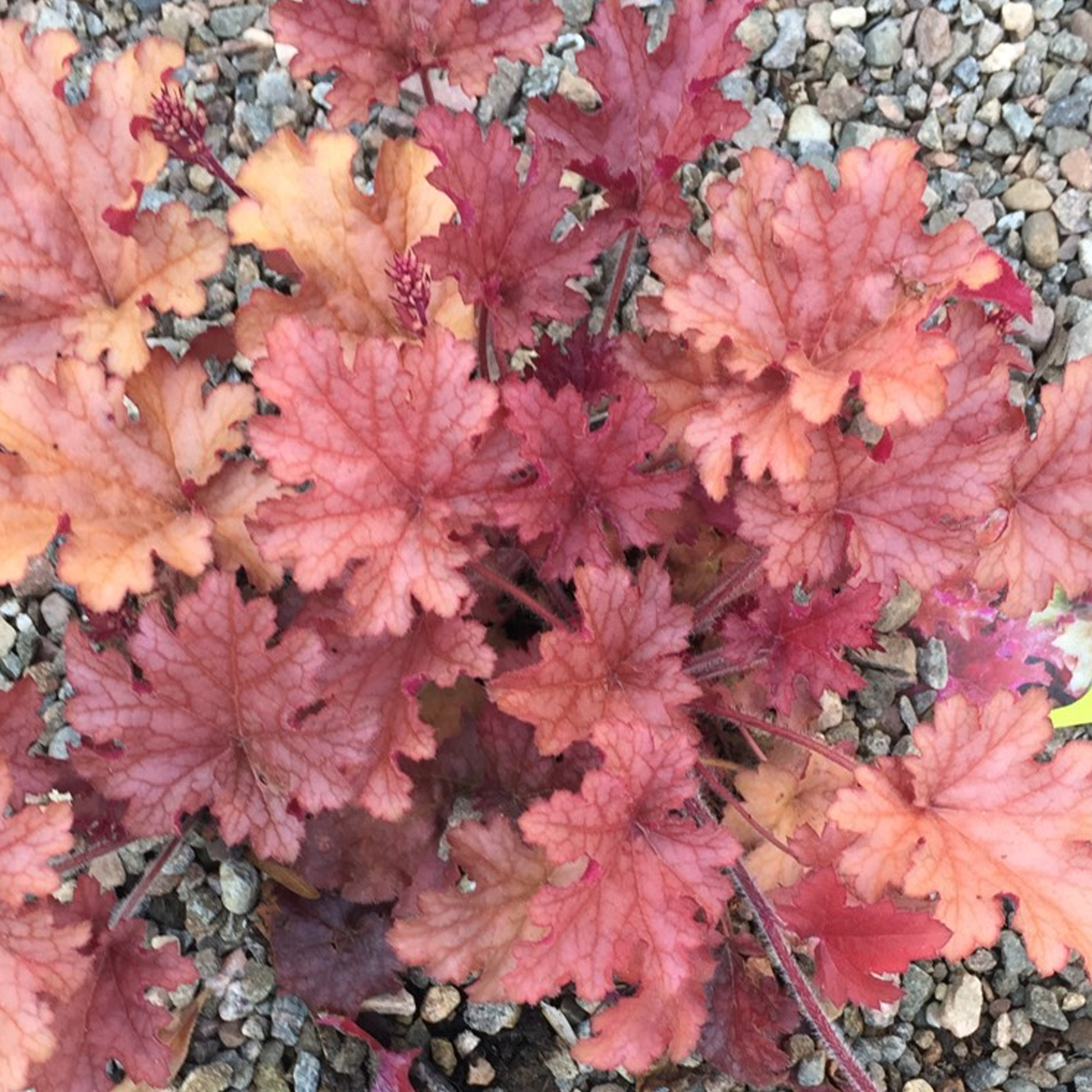 The Heuchera Ginger Peach is a perennial plant with a neat habit. This variety features ruffled rose-pink foliage that is ever-changing from peach to coral to copper and rose. Pale pink flowers appear in the Spring. The Heuchera Ginger Peach is considered the fastest growing Heuchera, it is very hardy and will thrive in most soil types. This particular plant will be best planted in a full sun or partially shaded location.